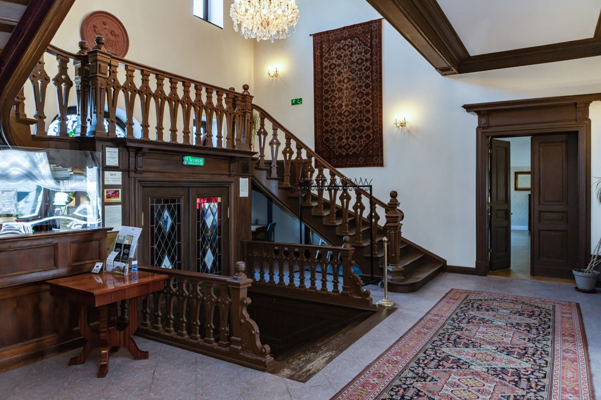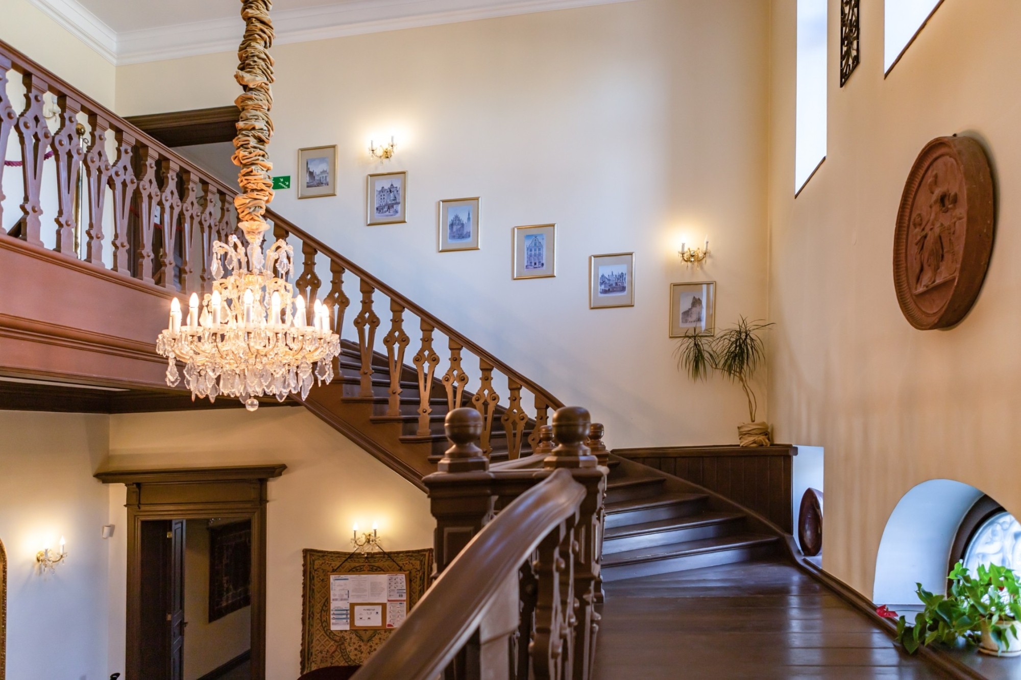 Poddasze: wyłącznie pomieszczenia hotelowe: apartamenty 2-osobowe z łazienkami i komunikacją wewnętrzną. Posadzki: terakota, parkiet dębowy, posadzka kamienna, wykładziny dywanowe. Ściany tapetowane, malowane emulsyjnie lub glazurowane, częściowo ze skosami dachu. Stolarka okienna i drzwiowa drewniana.