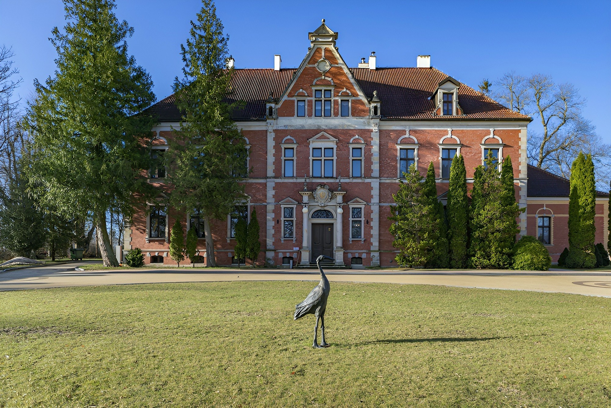 Jest to jeden z najpiękniejszych pałaców w północnej Polsce. Kompleks pałacowo-parkowy powstał na przełomie XVIII i XIX wieku. Pałac został wzniesiony w 1884 roku w stylu neorenesansowym w miejscu dawnego dworu rodziny Przebendowskich. Otaczający park krajobrazowy zawiera liczne drzewa uznane za pomniki przyrody oraz drzewa spełniające kryteria do uznania ich za takie pomniki. Stan zdrowotny drzewostanu jest zróżnicowany – większość drzew znajduje się w dobrej lub średniej kondycji zdrowotnej.