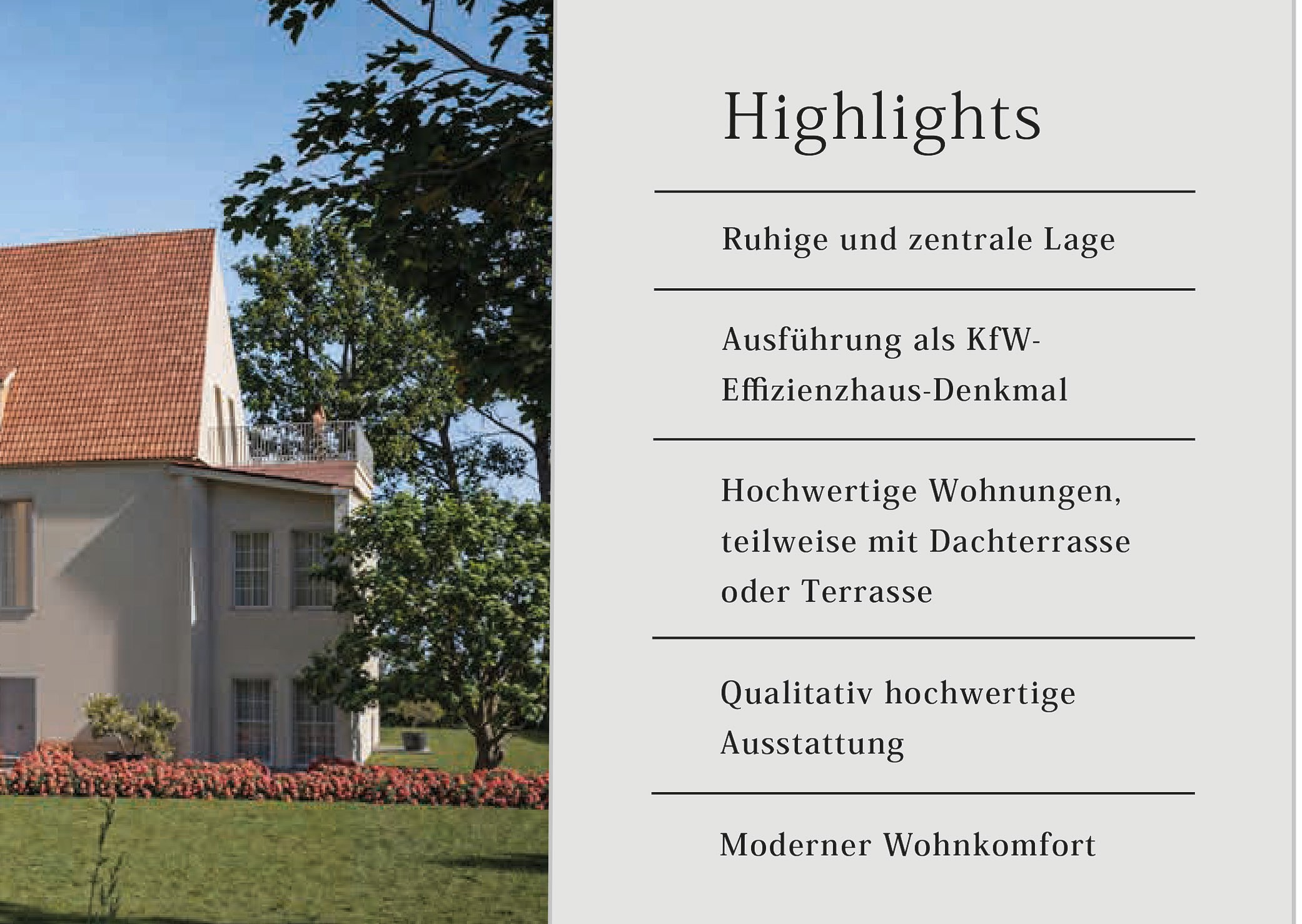 25 lokali mieszkalnych od ok. 67 m², ceny od 292.000 € (bez prowizji dla kupującego). Cały kompleks na zapytanie. Udział we współwłasności działki o pow. ok. 9.279 m². Koszty dodatkowe zakupu ok. 5,5 %, plus odsetki budowlane dla każdej jednostki.