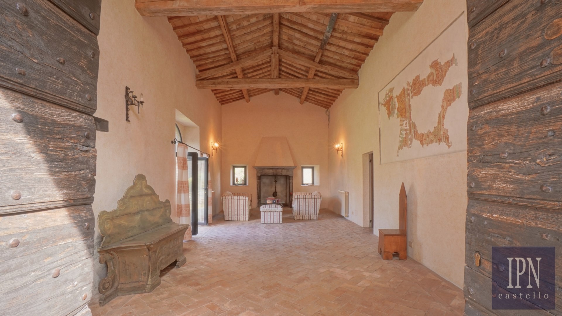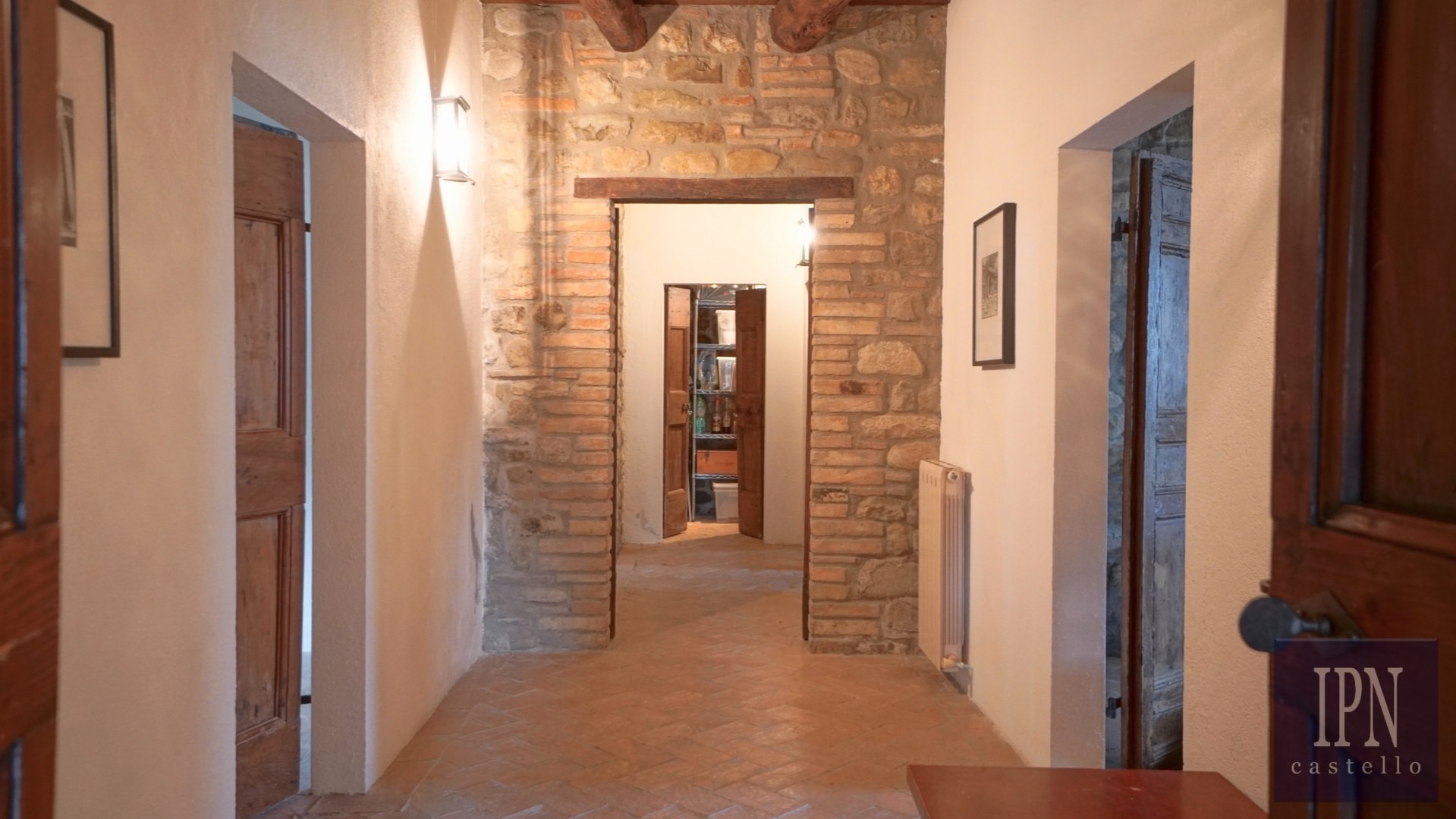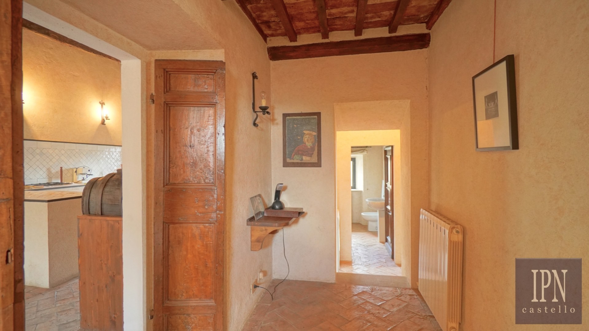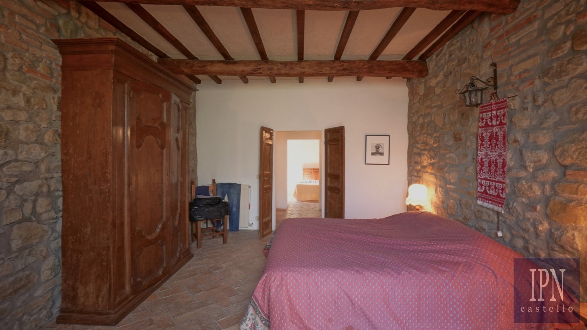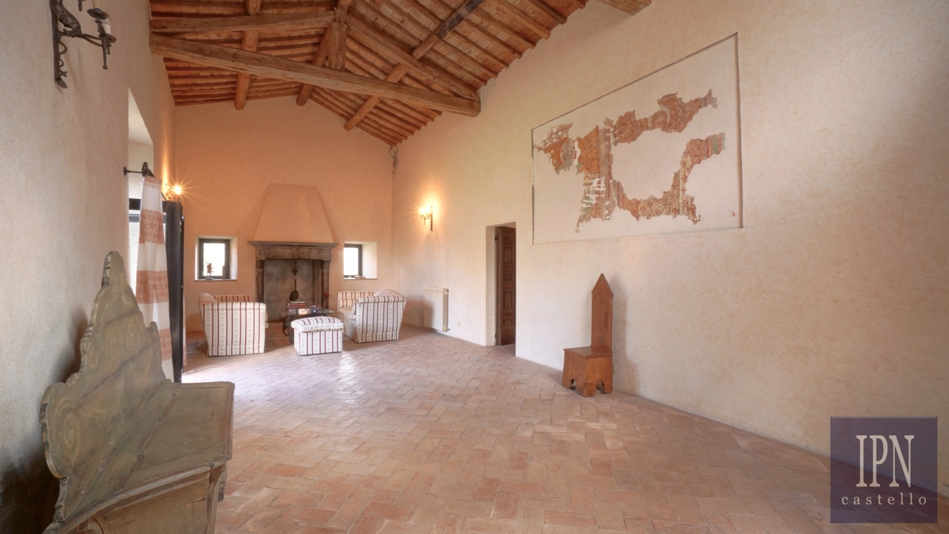 Piętro: sypialnia dwuosobowa z własną łazienką, druga łazienka oraz druga kuchnia. Serce nieruchomości stanowi odrestaurowana kaplica (45 m²) z oryginalnymi freskami, która może służyć jako niezależna przestrzeń mieszkalna, miejsce do pracy lub atelier. Z piętra prowadzi schody na panoramiczny taras z widokiem na okoliczną dolinę.