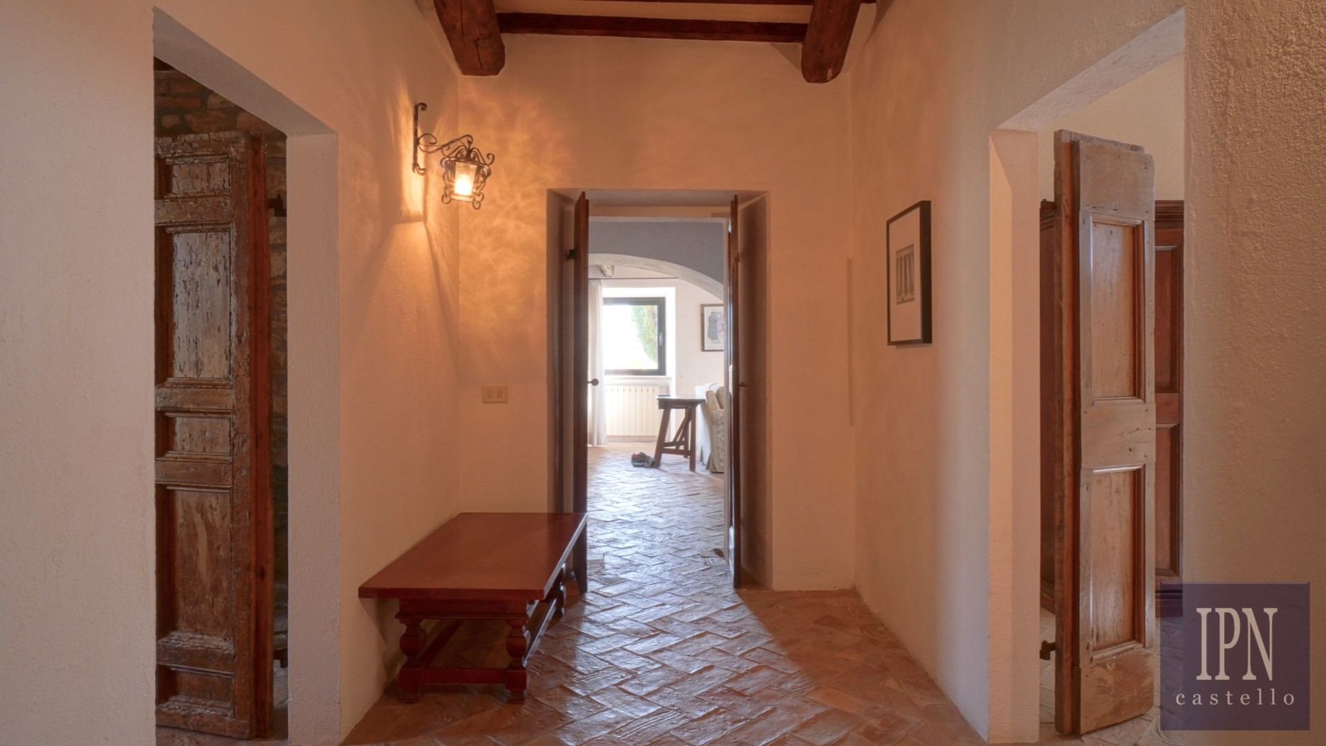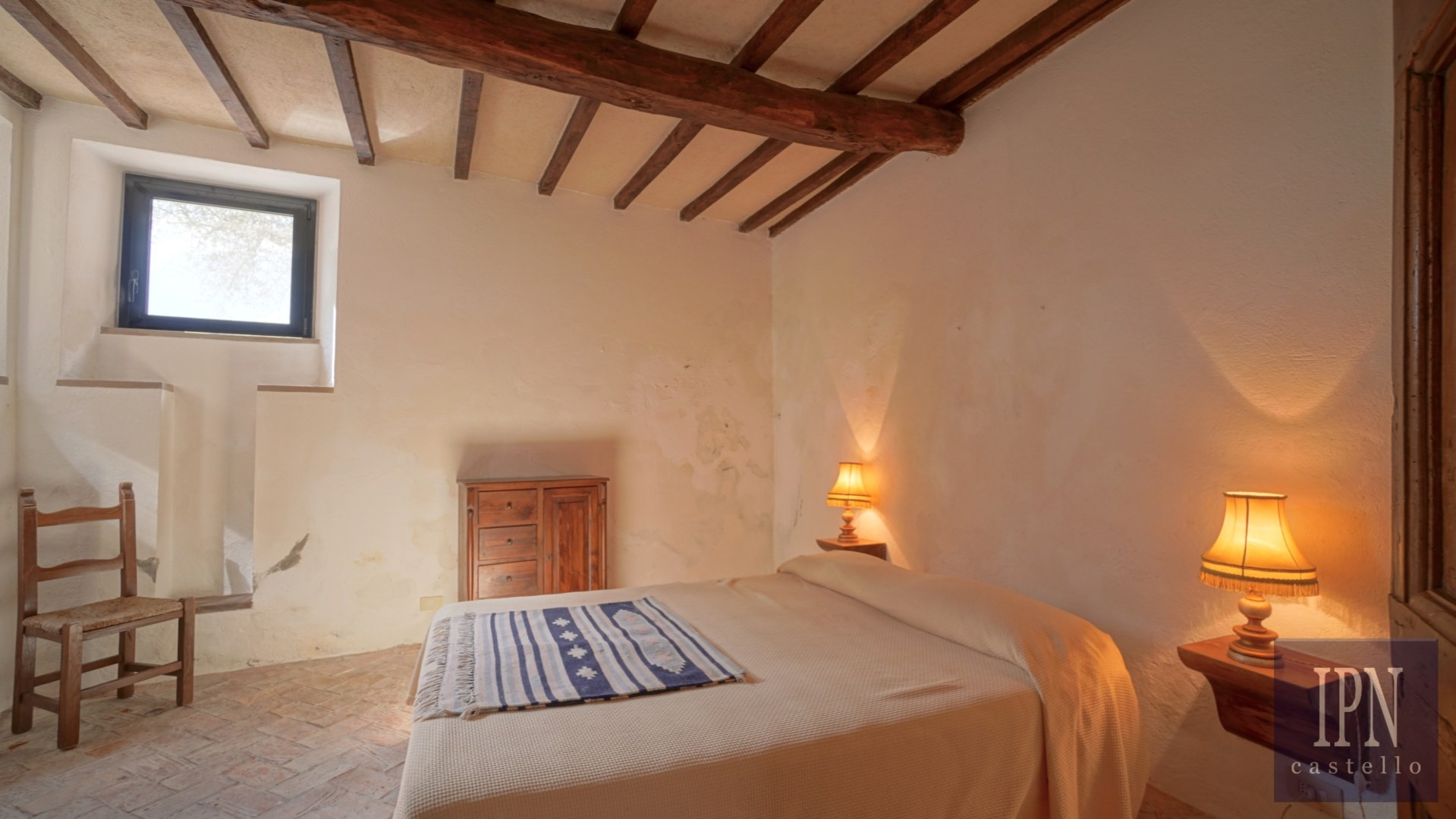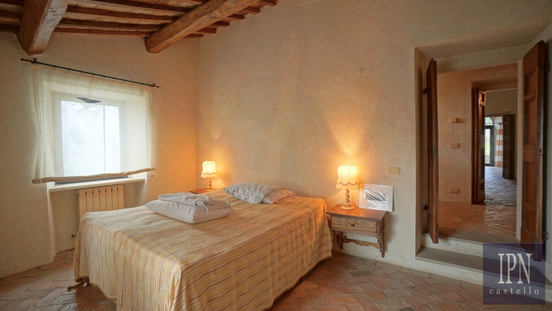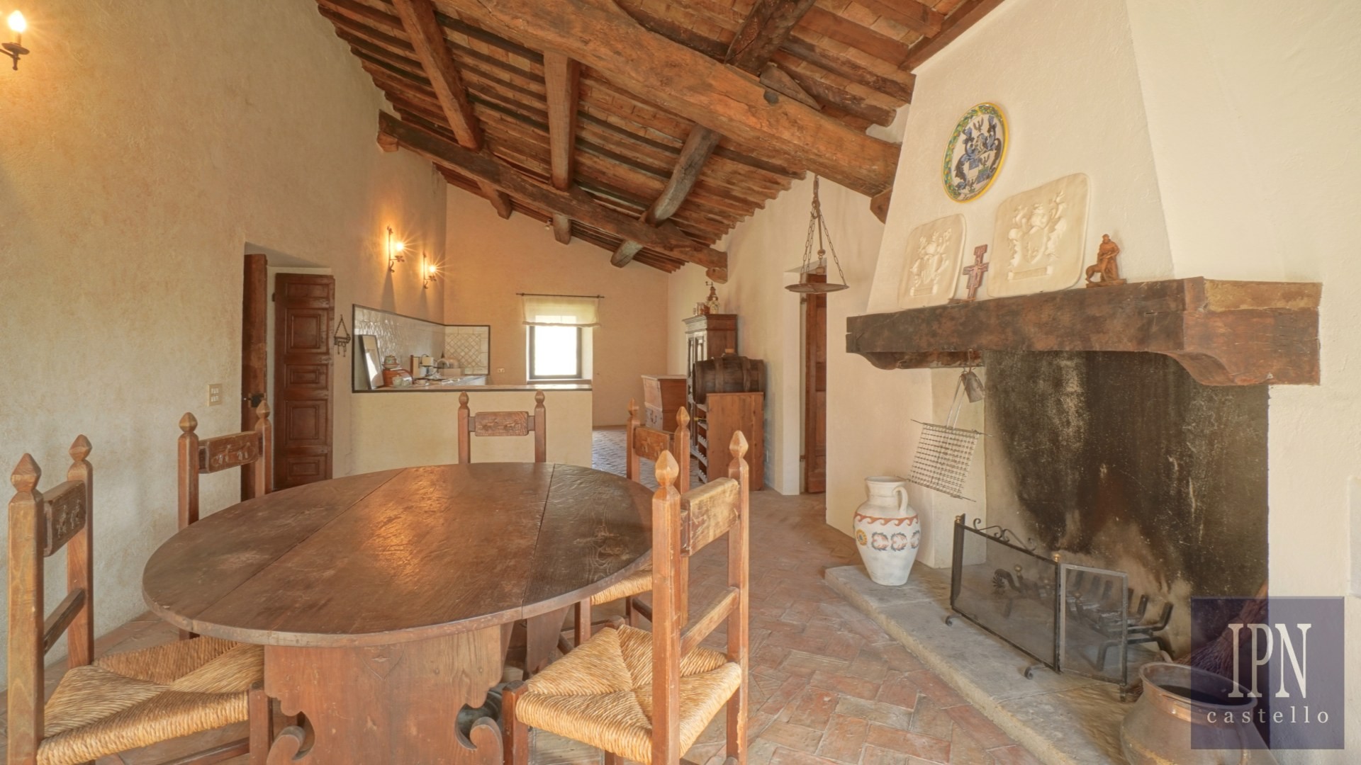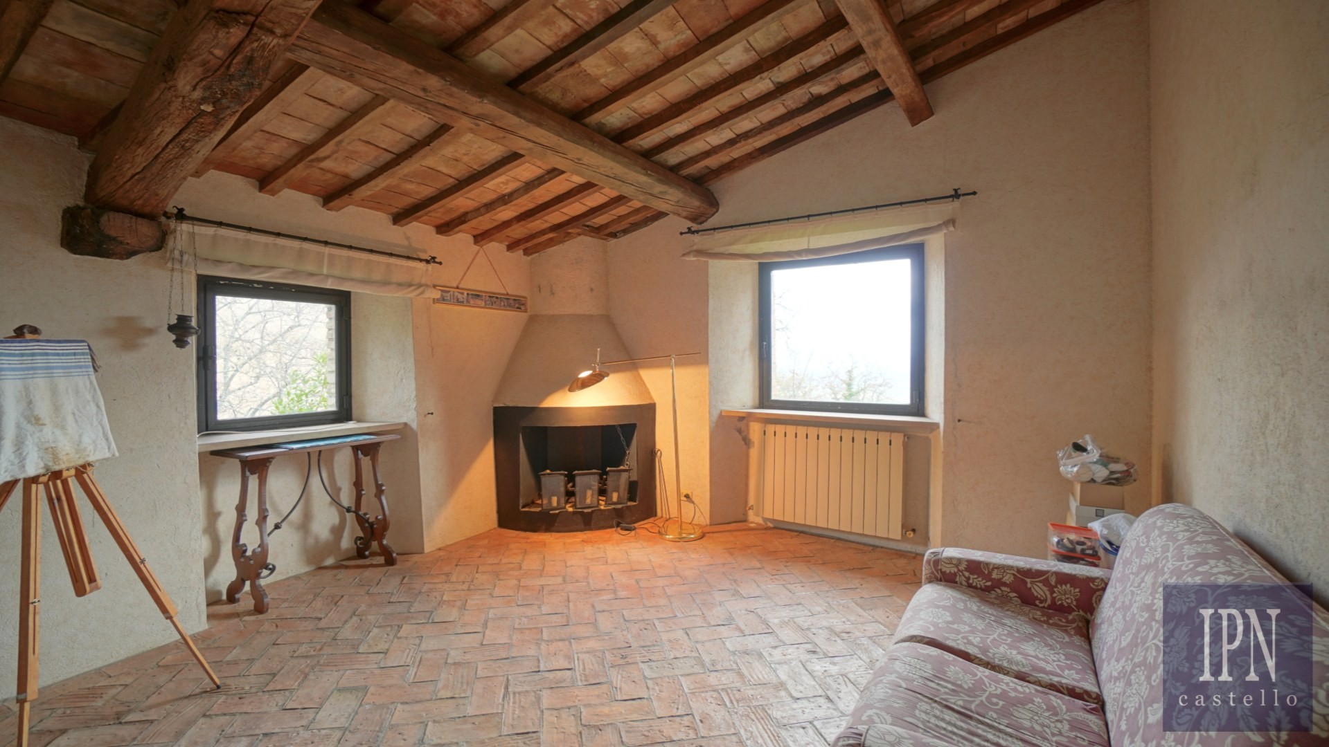 Piętro: sypialnia dwuosobowa z własną łazienką, druga łazienka oraz druga kuchnia. Serce nieruchomości stanowi odrestaurowana kaplica (45 m²) z oryginalnymi freskami, która może służyć jako niezależna przestrzeń mieszkalna, miejsce do pracy lub atelier. Z piętra prowadzi schody na panoramiczny taras z widokiem na okoliczną dolinę.