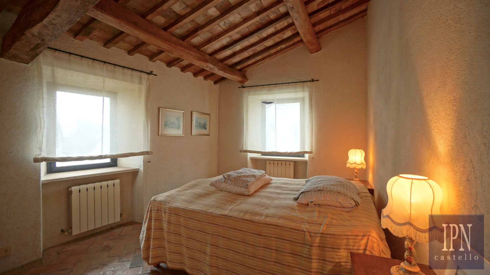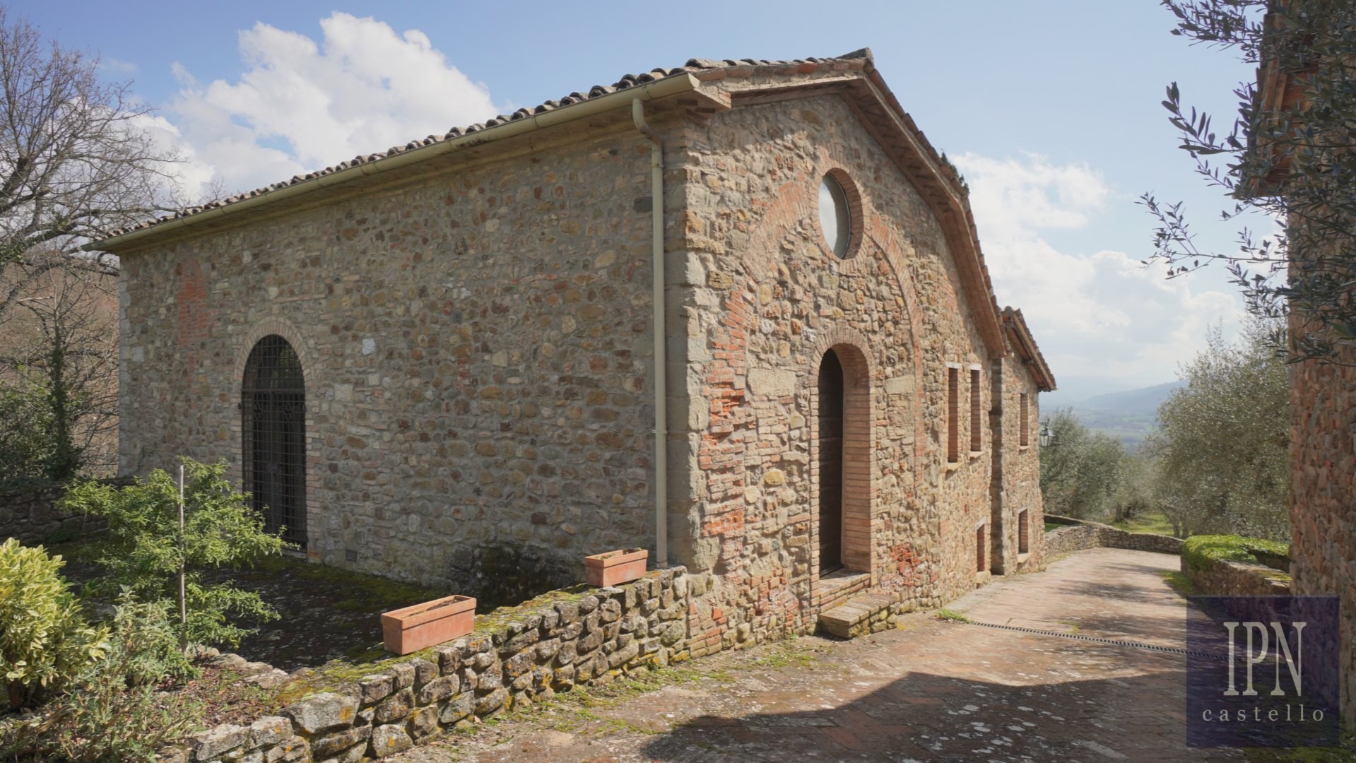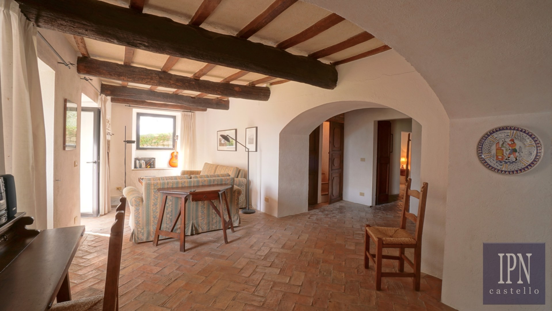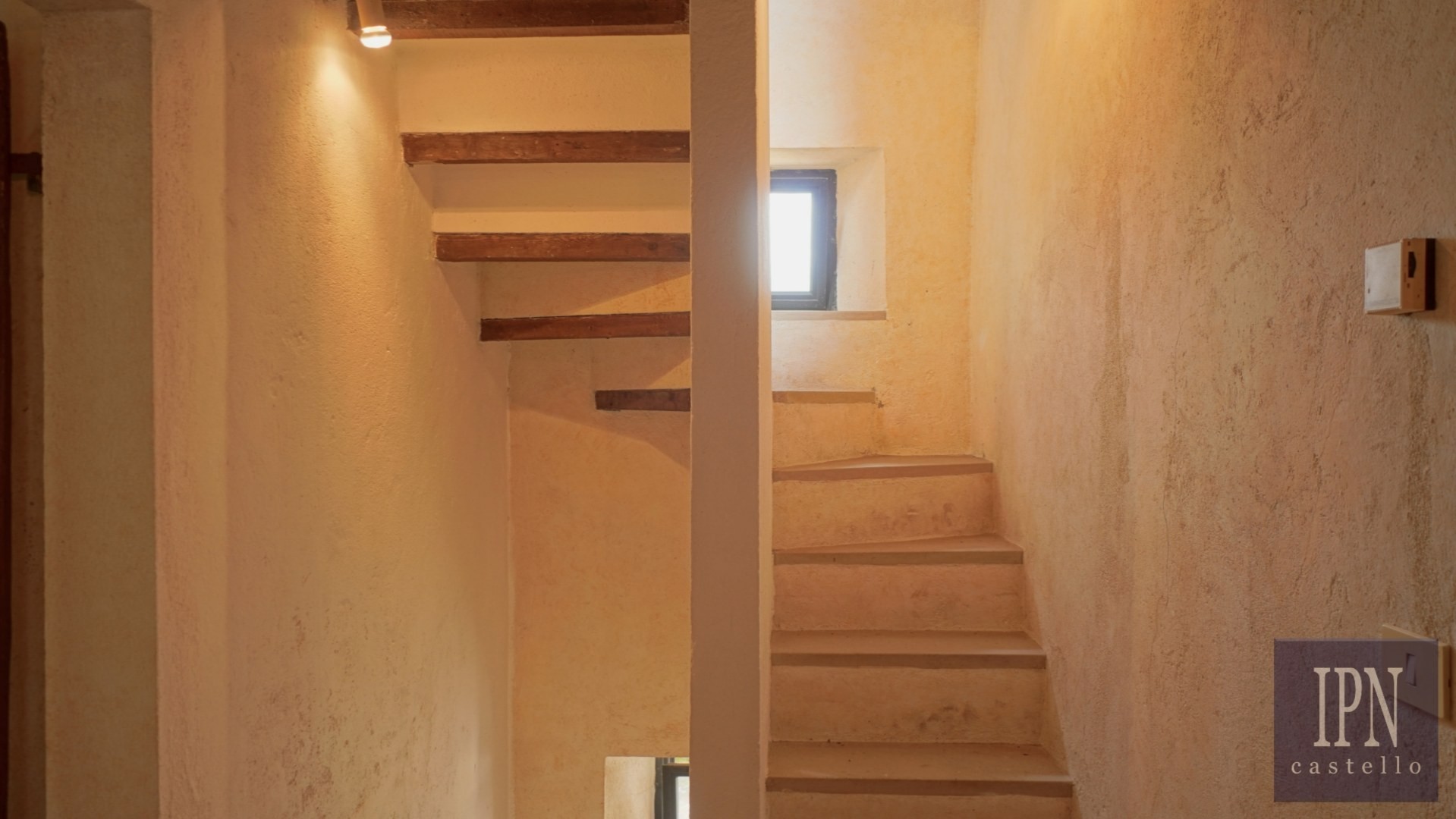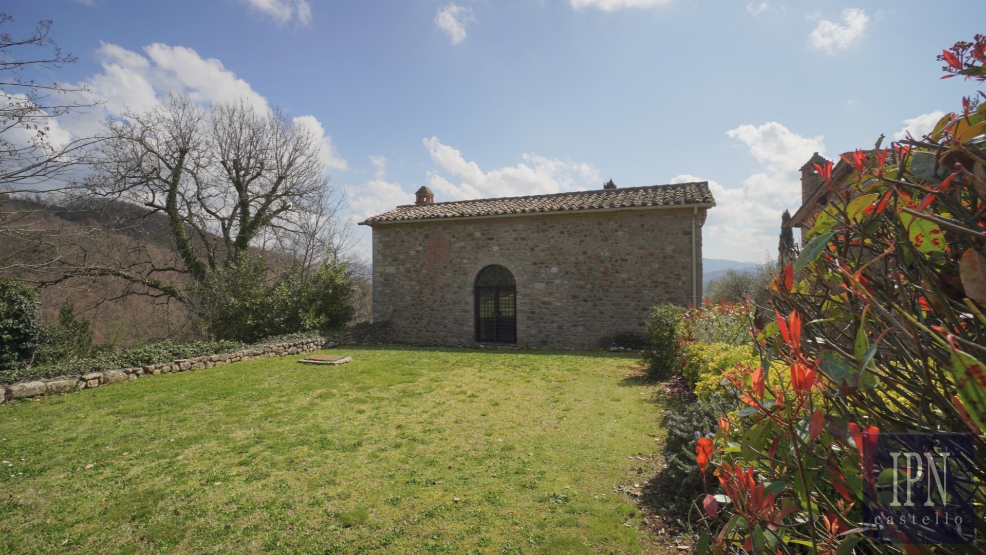 Piętro: sypialnia dwuosobowa z własną łazienką, druga łazienka oraz druga kuchnia. Serce nieruchomości stanowi odrestaurowana kaplica (45 m²) z oryginalnymi freskami, która może służyć jako niezależna przestrzeń mieszkalna, miejsce do pracy lub atelier. Z piętra prowadzi schody na panoramiczny taras z widokiem na okoliczną dolinę.