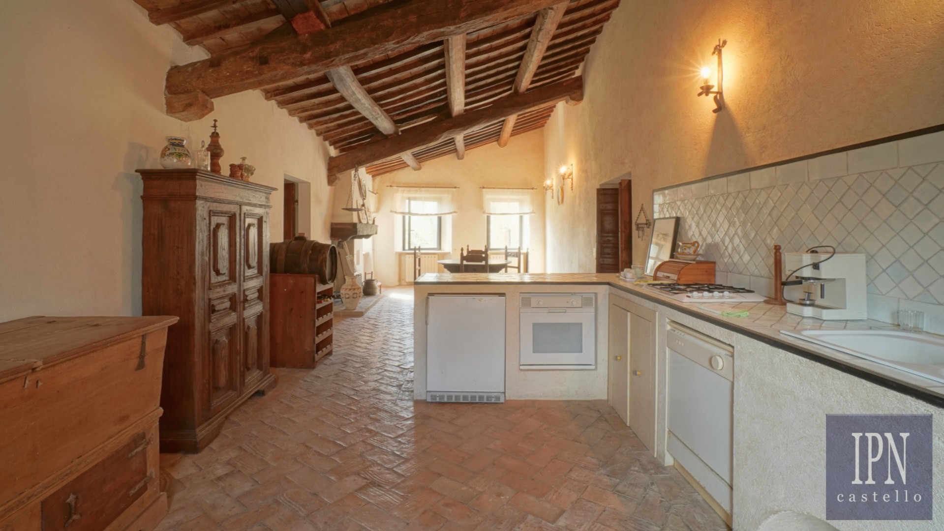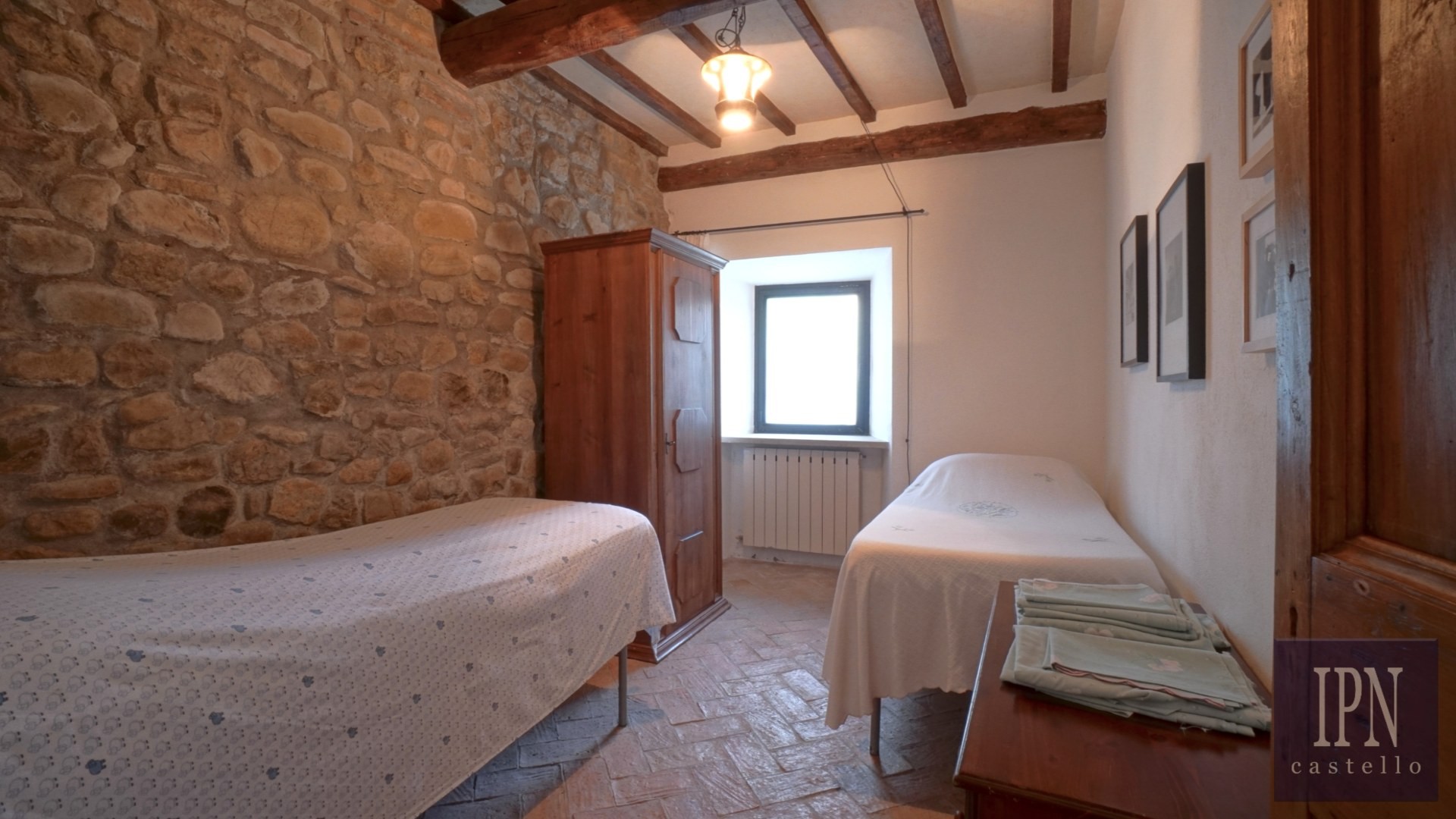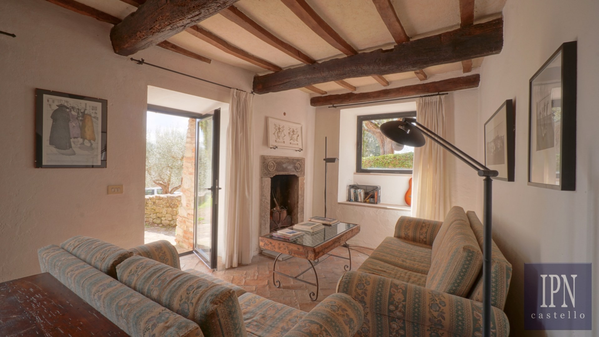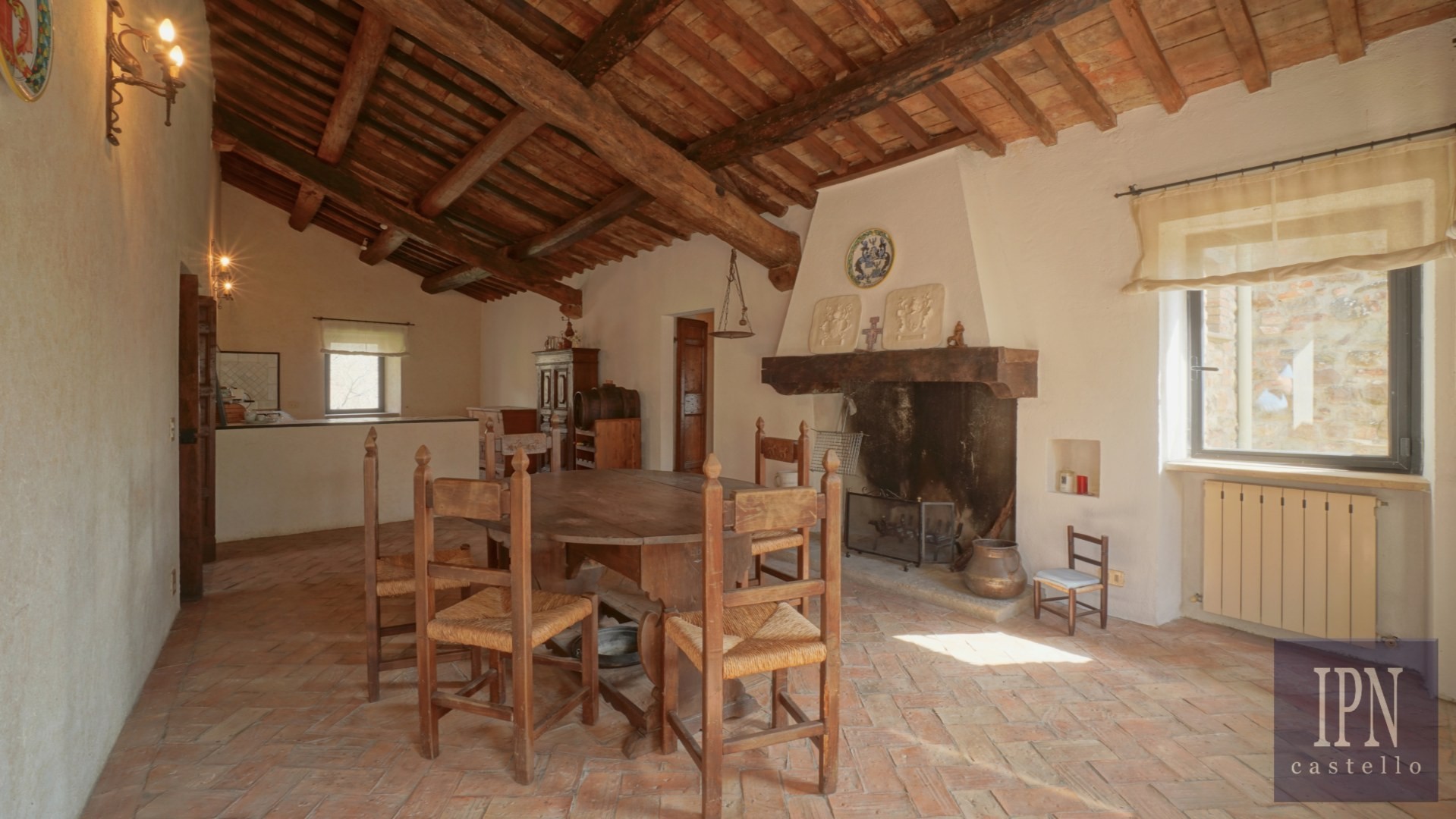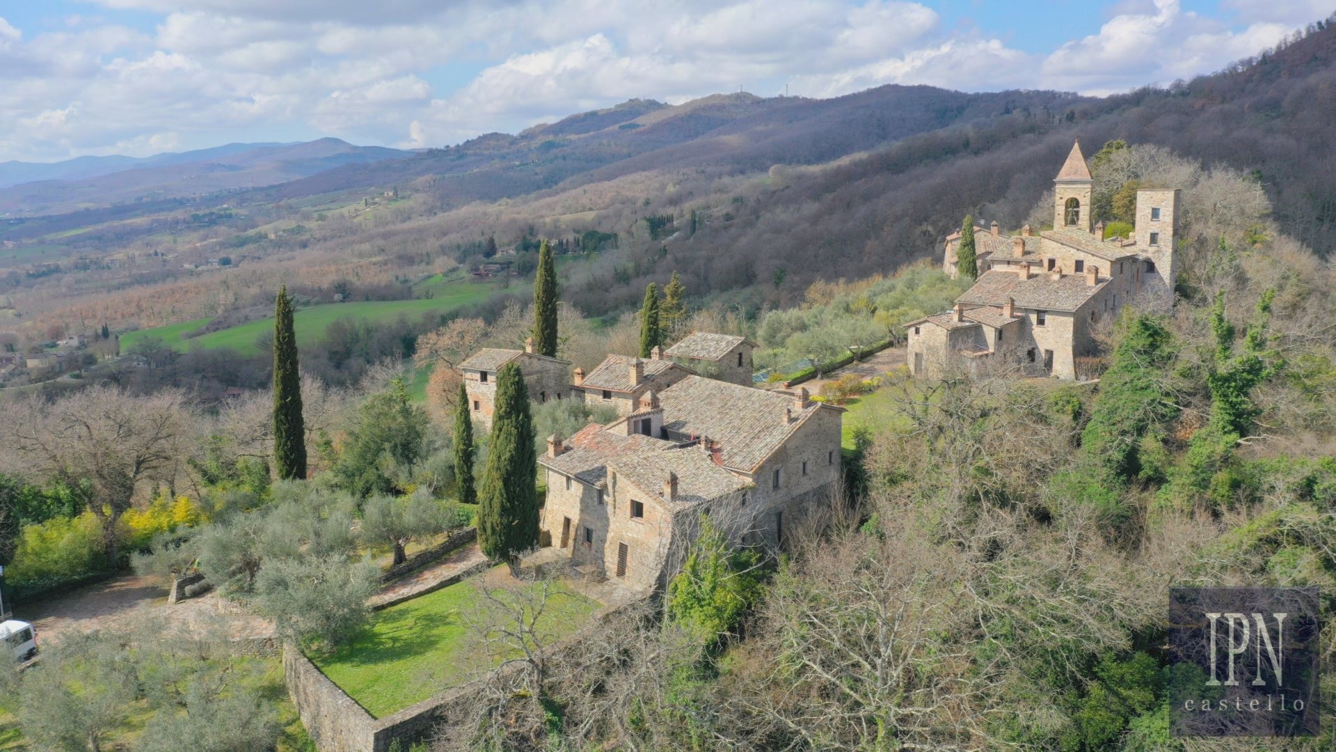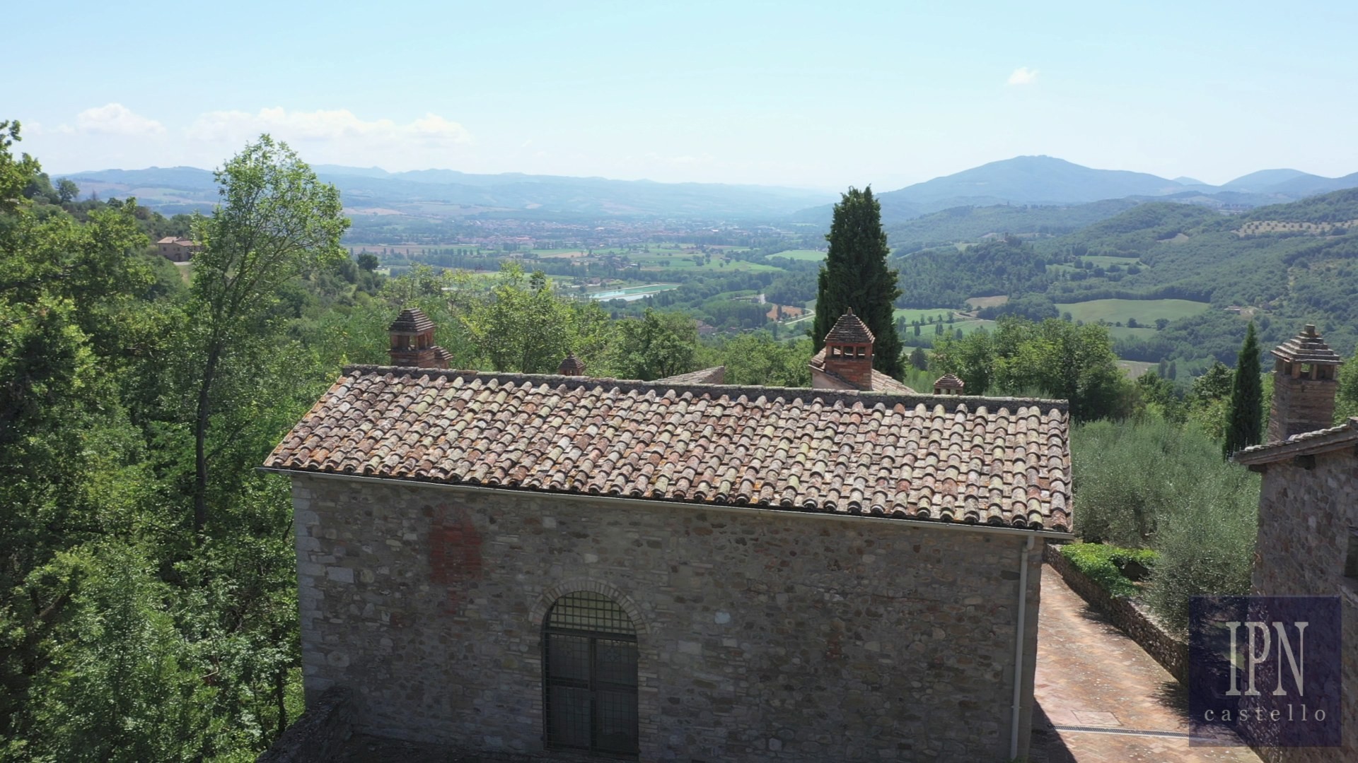 Piętro: sypialnia dwuosobowa z własną łazienką, druga łazienka oraz druga kuchnia. Serce nieruchomości stanowi odrestaurowana kaplica (45 m²) z oryginalnymi freskami, która może służyć jako niezależna przestrzeń mieszkalna, miejsce do pracy lub atelier. Z piętra prowadzi schody na panoramiczny taras z widokiem na okoliczną dolinę.