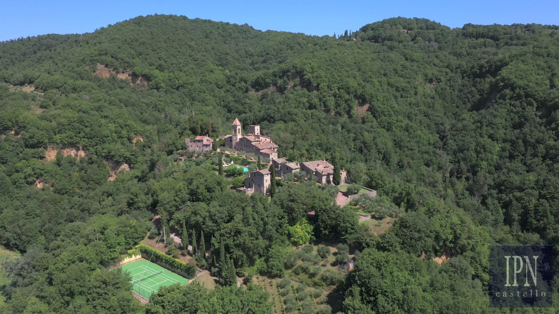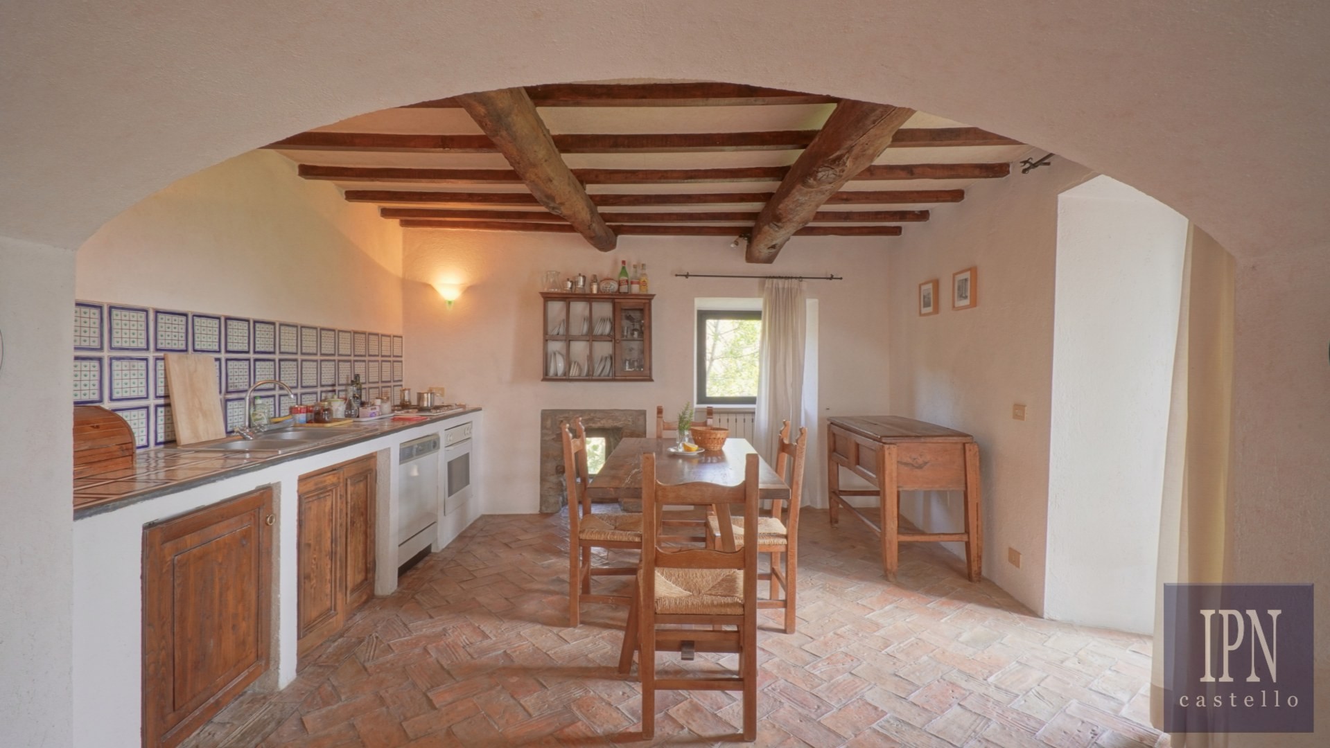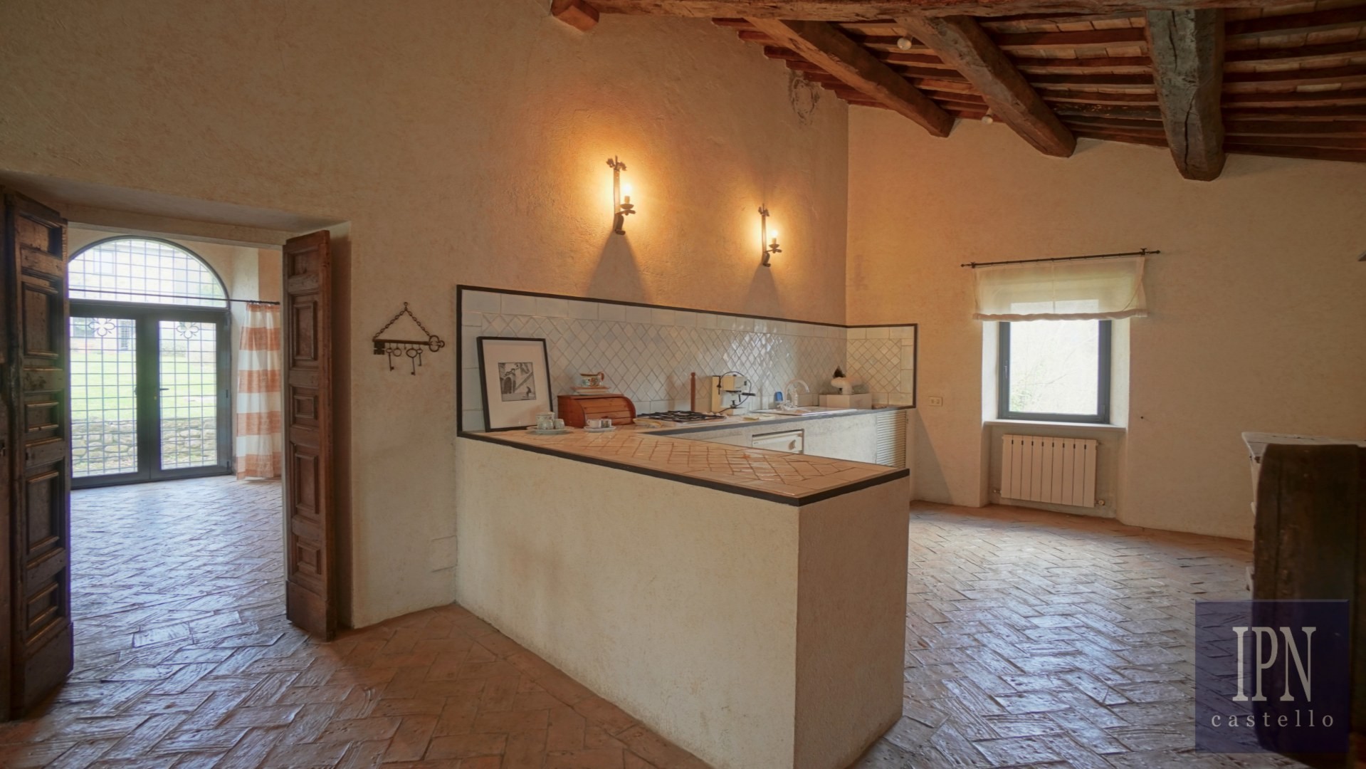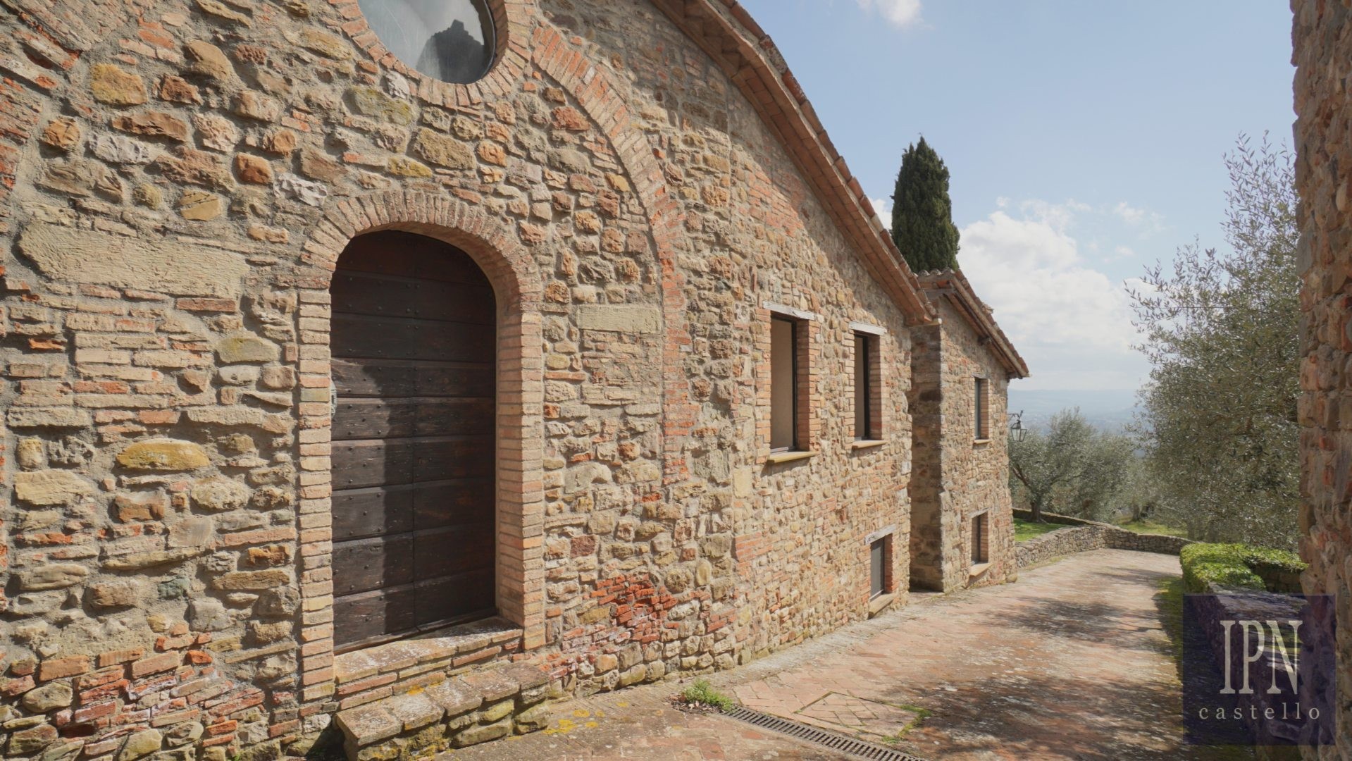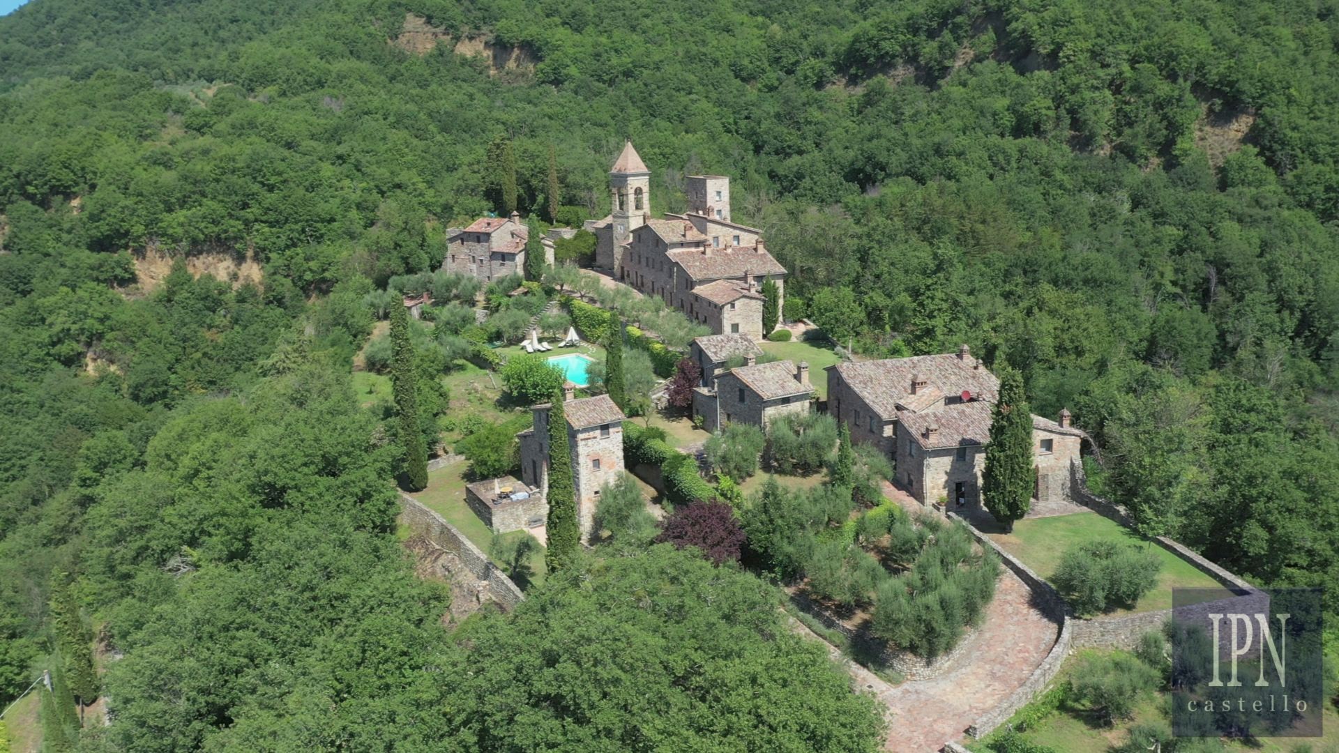 Piętro: sypialnia dwuosobowa z własną łazienką, druga łazienka oraz druga kuchnia. Serce nieruchomości stanowi odrestaurowana kaplica (45 m²) z oryginalnymi freskami, która może służyć jako niezależna przestrzeń mieszkalna, miejsce do pracy lub atelier. Z piętra prowadzi schody na panoramiczny taras z widokiem na okoliczną dolinę.