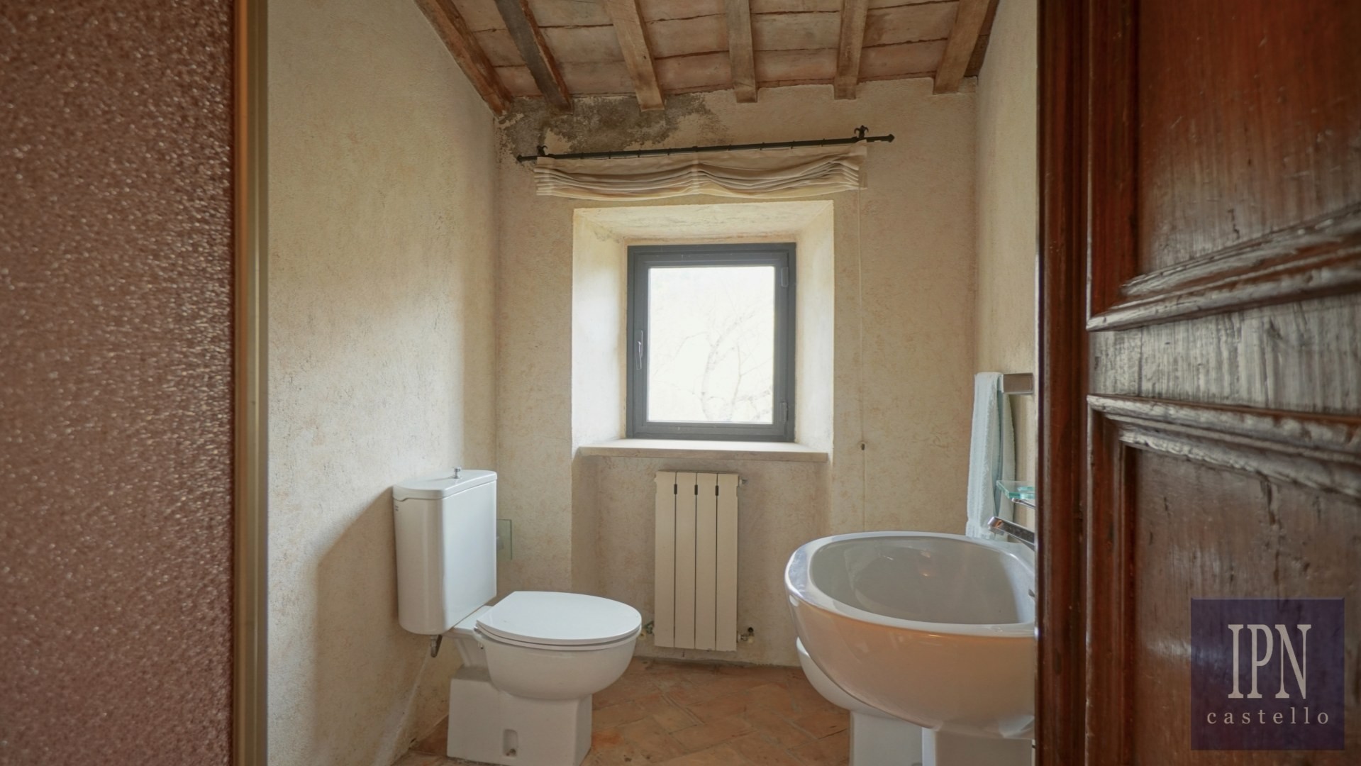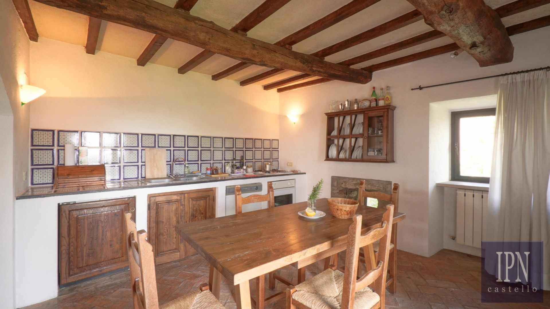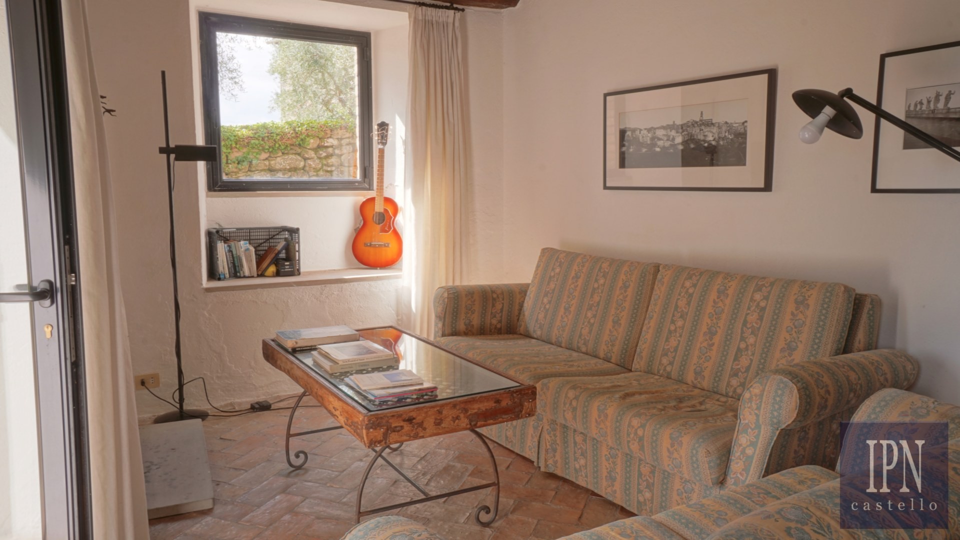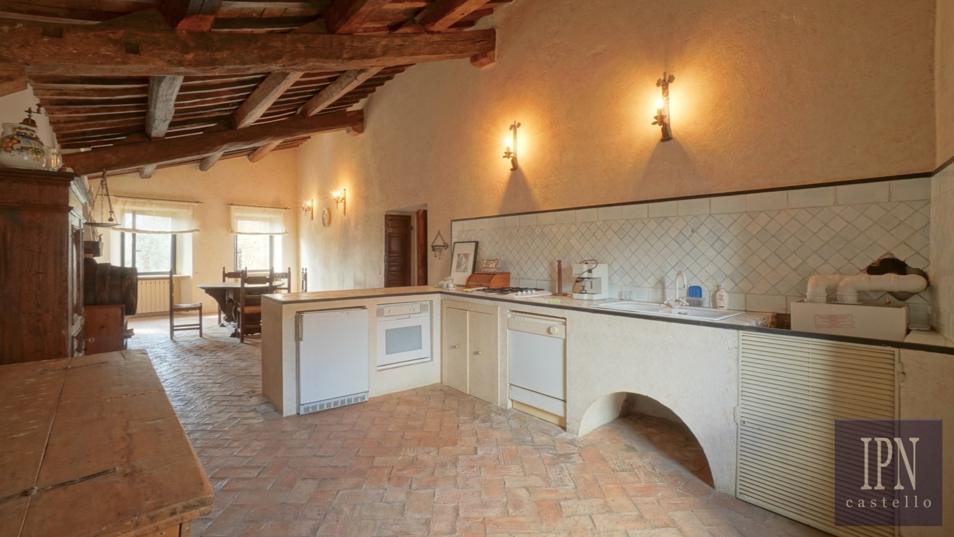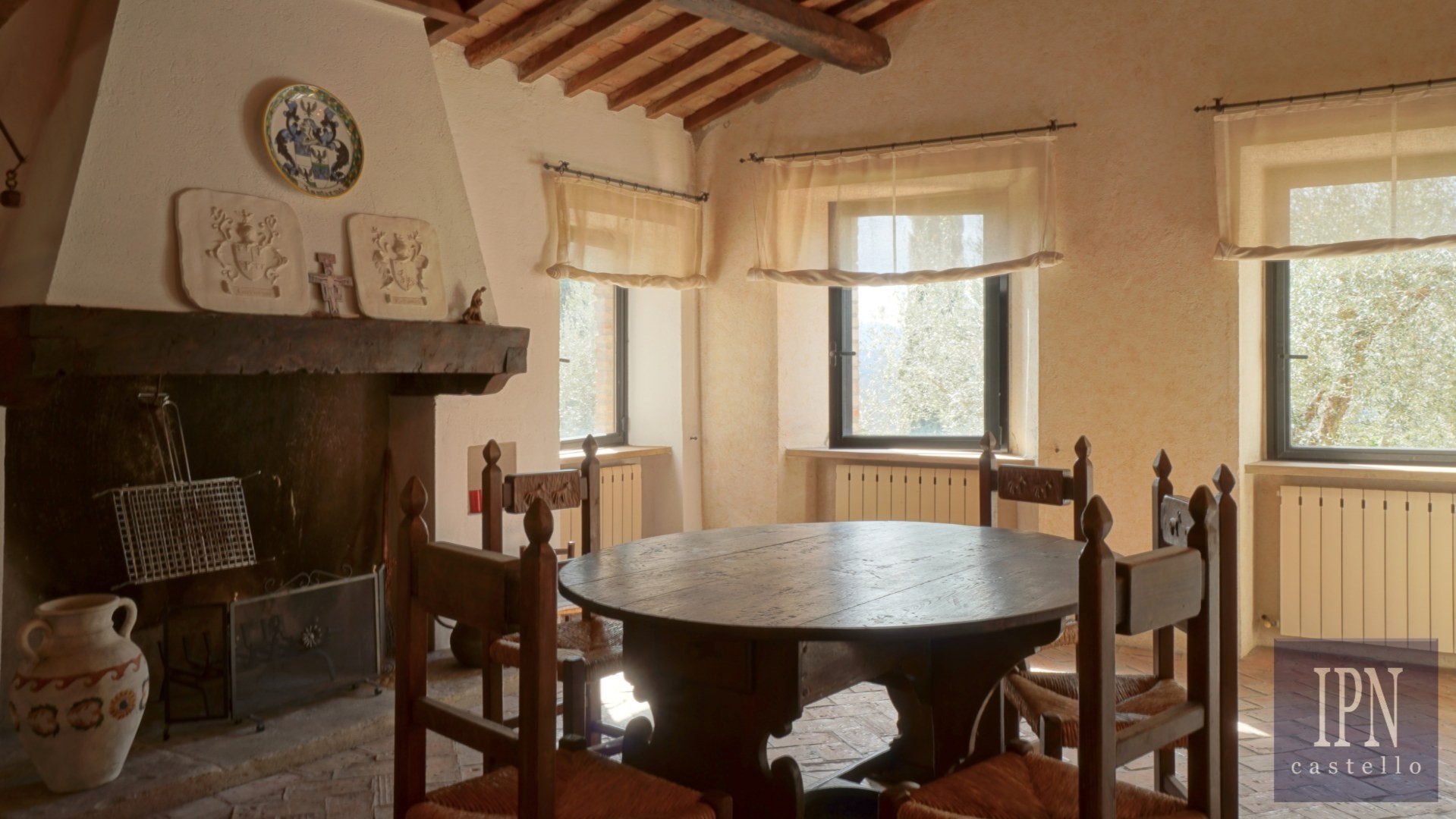 Piętro: sypialnia dwuosobowa z własną łazienką, druga łazienka oraz druga kuchnia. Serce nieruchomości stanowi odrestaurowana kaplica (45 m²) z oryginalnymi freskami, która może służyć jako niezależna przestrzeń mieszkalna, miejsce do pracy lub atelier. Z piętra prowadzi schody na panoramiczny taras z widokiem na okoliczną dolinę.