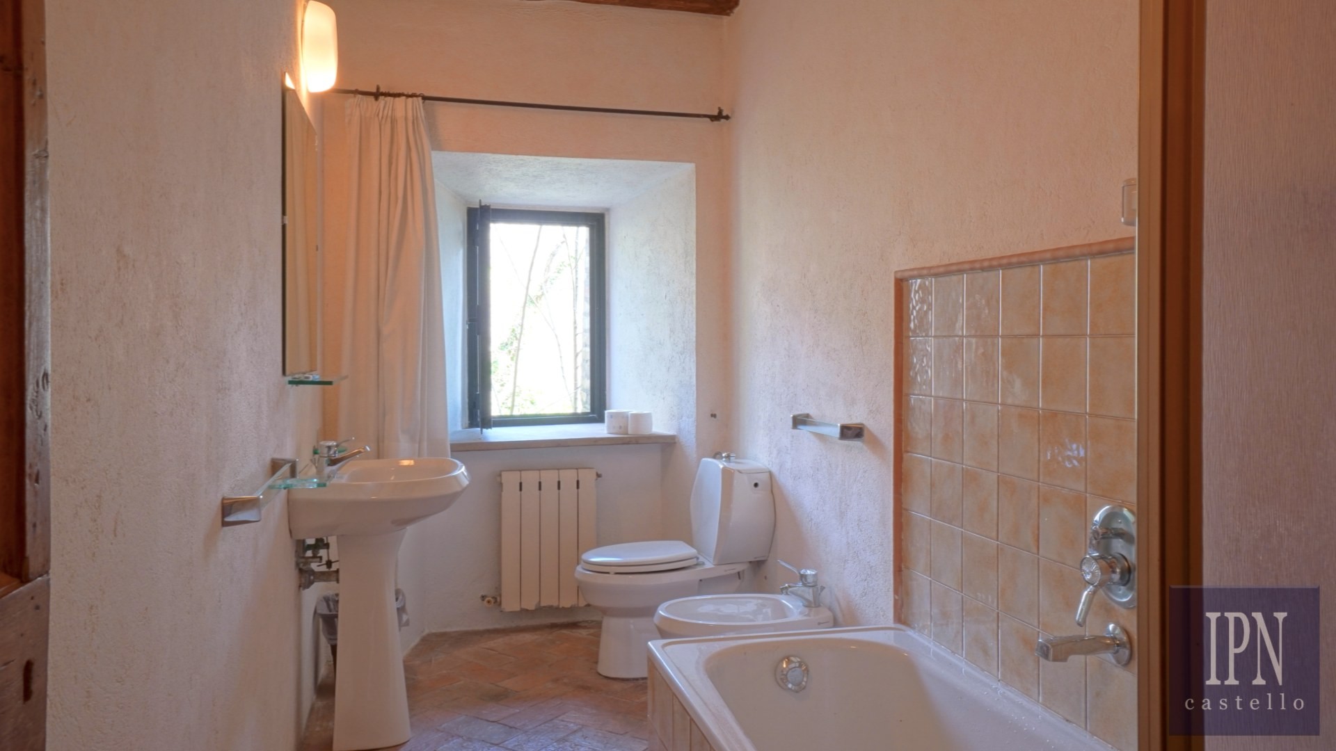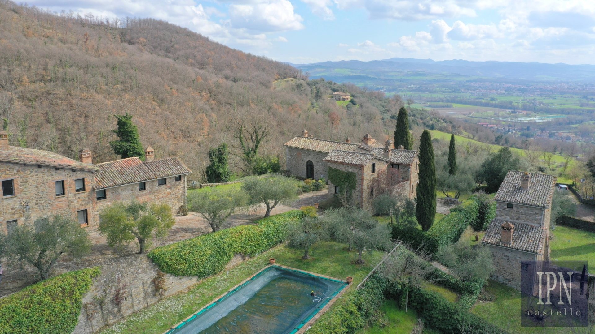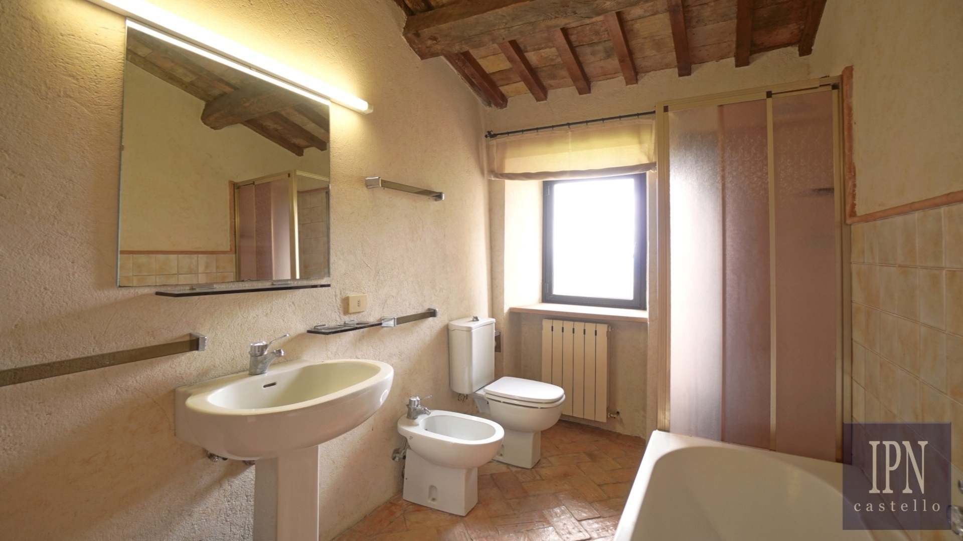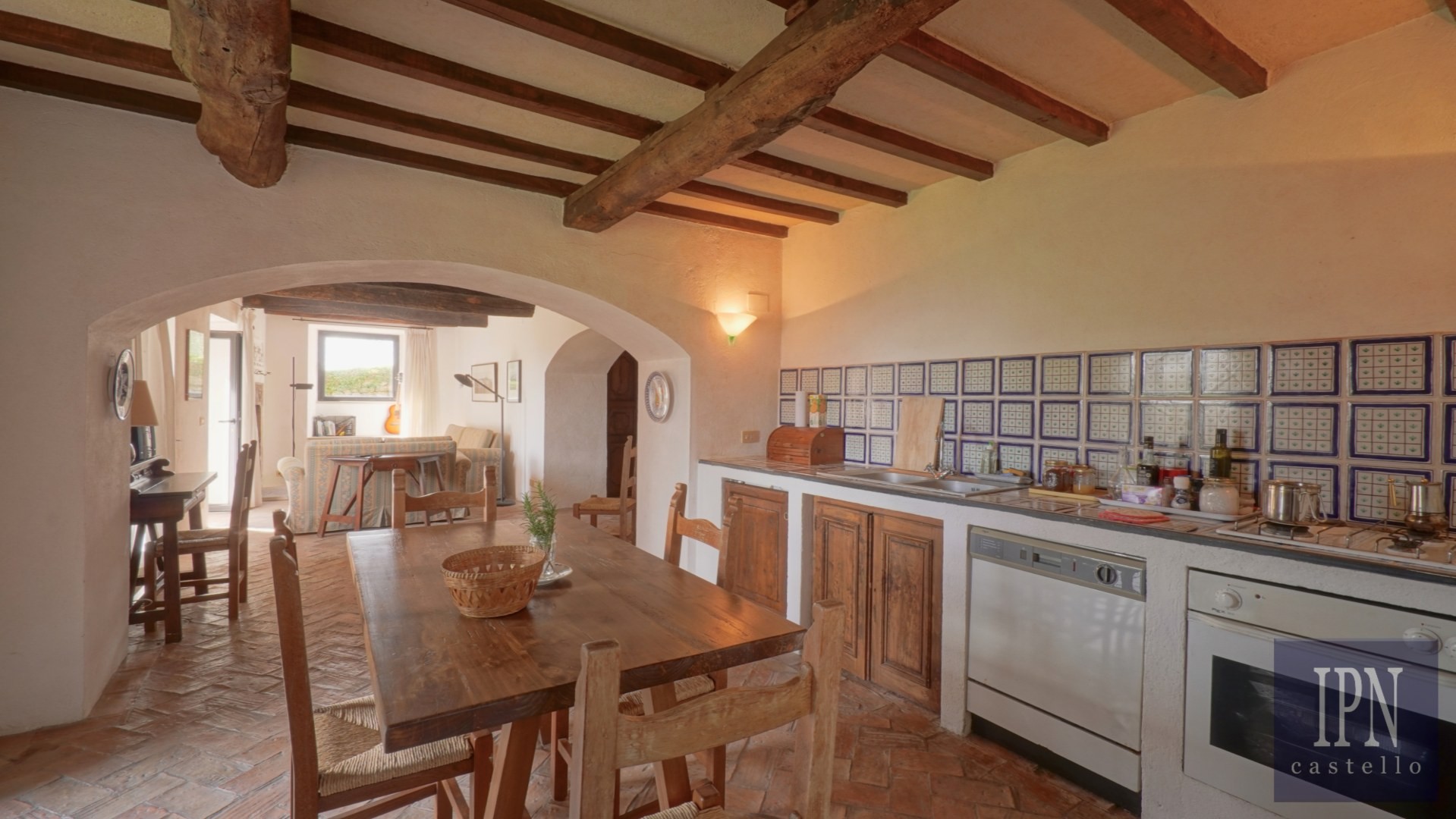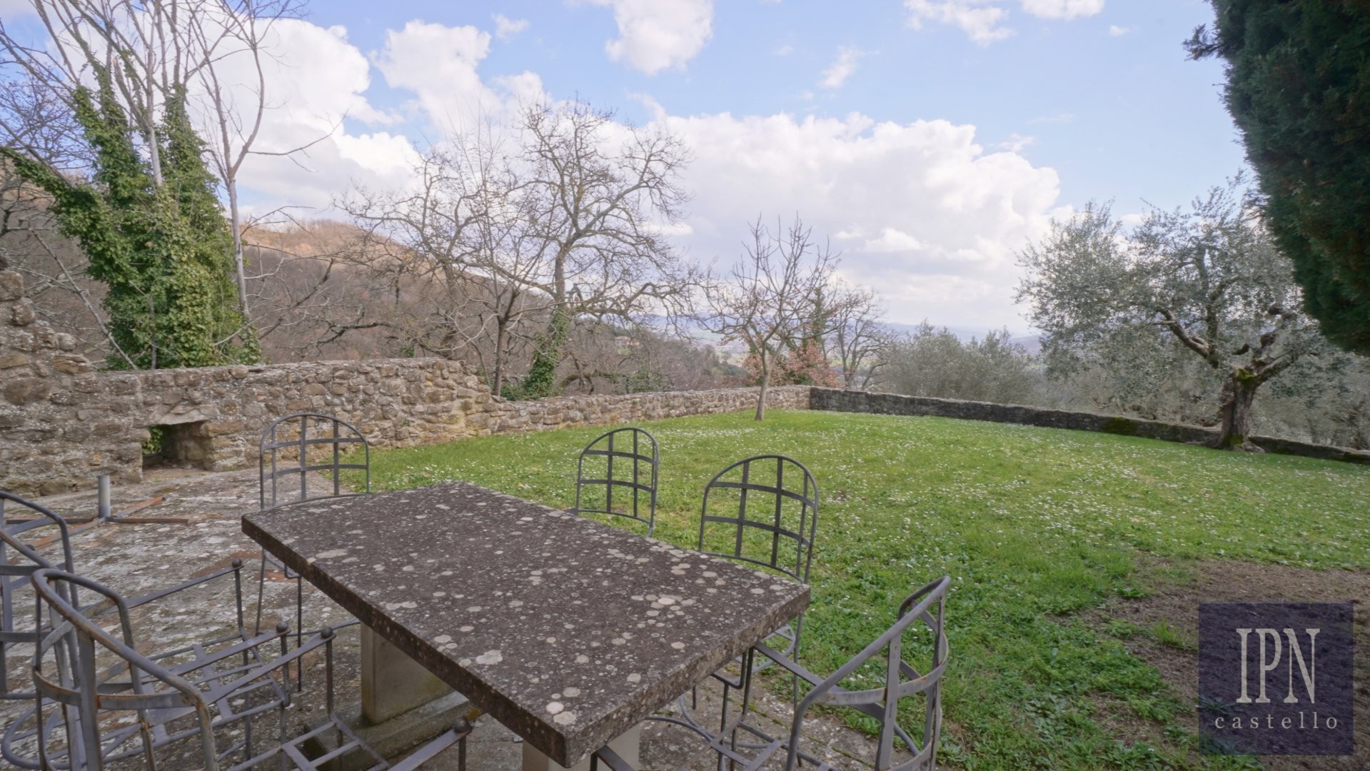 Piętro: sypialnia dwuosobowa z własną łazienką, druga łazienka oraz druga kuchnia. Serce nieruchomości stanowi odrestaurowana kaplica (45 m²) z oryginalnymi freskami, która może służyć jako niezależna przestrzeń mieszkalna, miejsce do pracy lub atelier. Z piętra prowadzi schody na panoramiczny taras z widokiem na okoliczną dolinę.