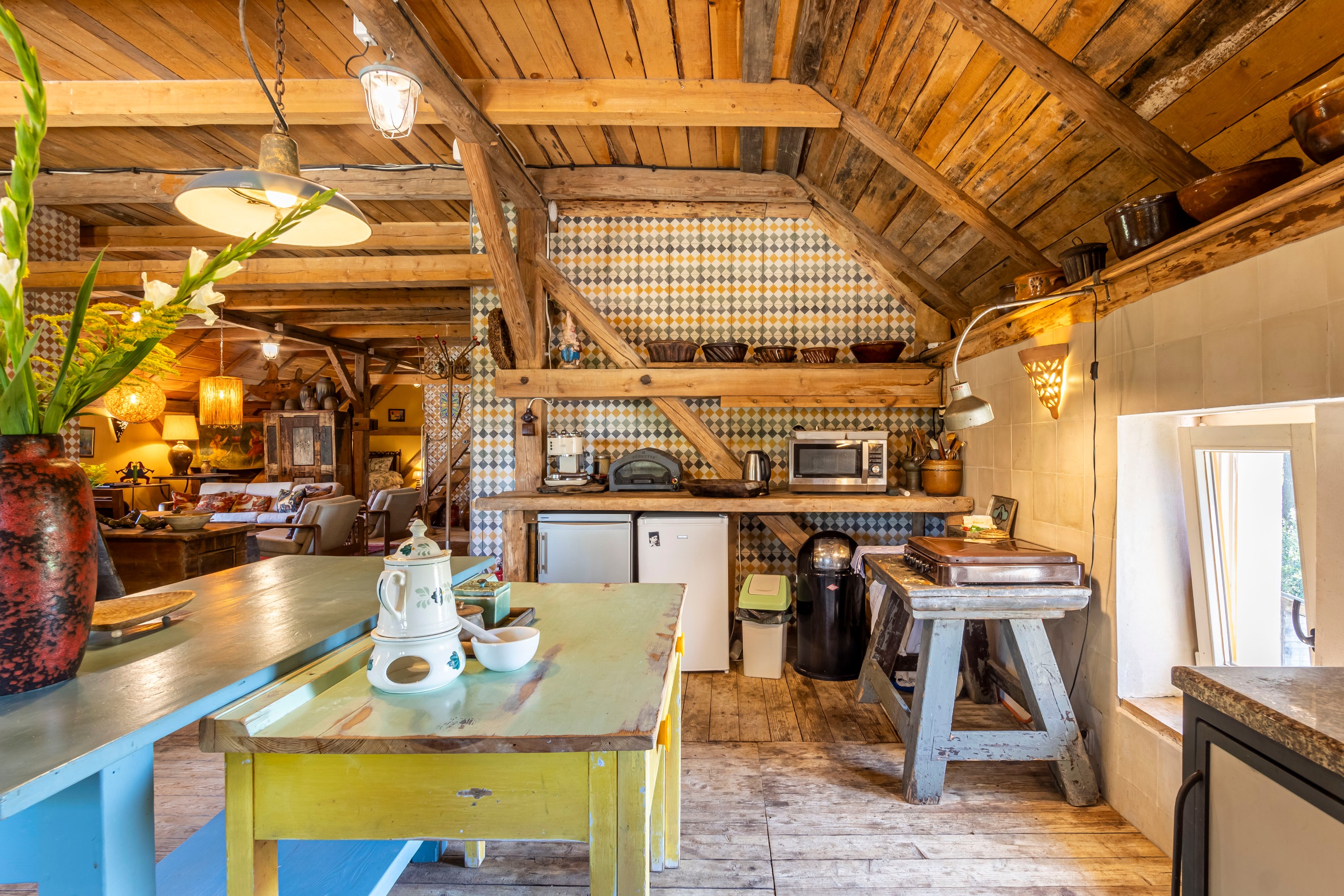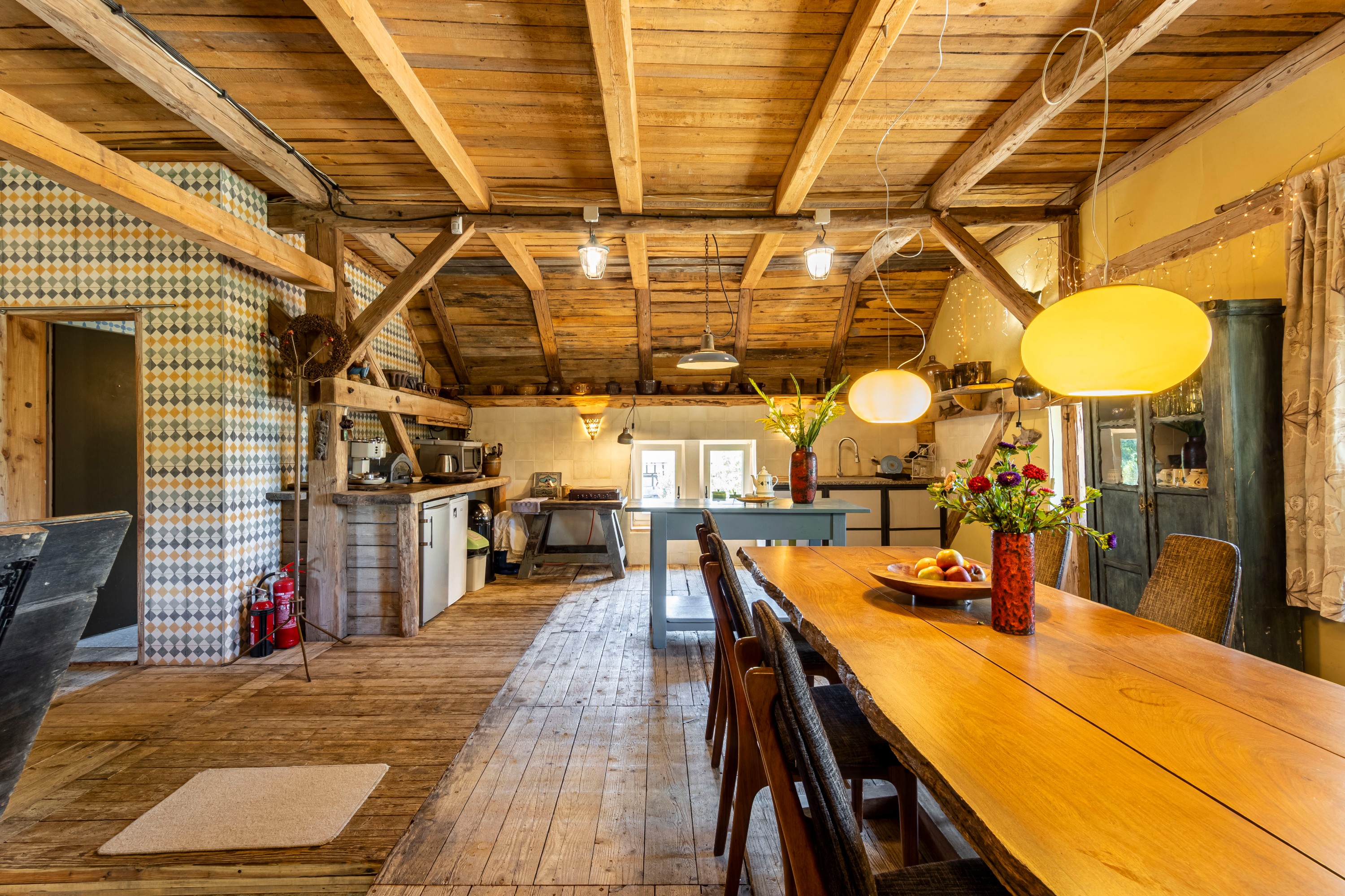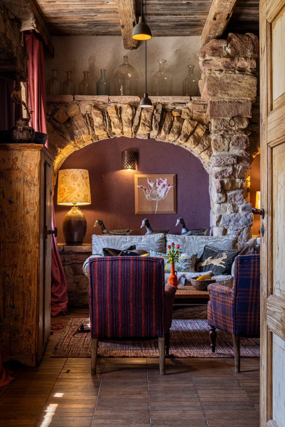 Wnętrze w bardzo rustykalnym stylu łączące w sobie nowoczesność z klimatem przytulnej, wiejskiej chatki. Z prywatnym kominkiem i wyjściem bezpośrednio na ogród.