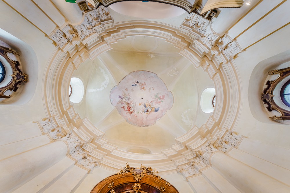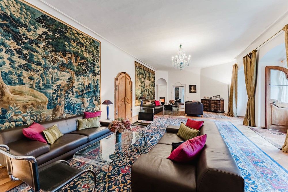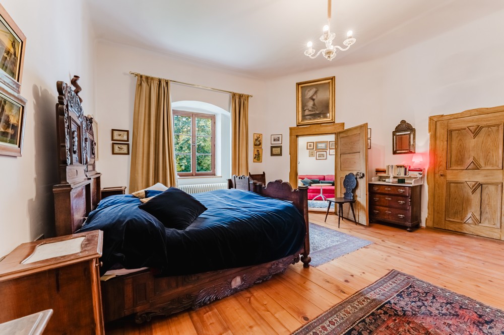 Wnętrza rezydencji zachwycają wyjątkowym pięknem. Przestronne pokoje z wysokimi sufitami, bogatymi stiukami i oryginalnymi drewnianymi boazeriami opowiadają historię minionych stuleci. Wytworne kominki tworzą przytulne zakątki w arystokratycznej atmosferze, a kaplica zamkowa poświęcona św. Nepomukowi—ozdobiona kunsztownymi ołtarzami w stylu rokoko i dziełami malarza barokowego Bartolomeo Altomonte (1769)—dodaje nieruchomości duchowego wymiaru.