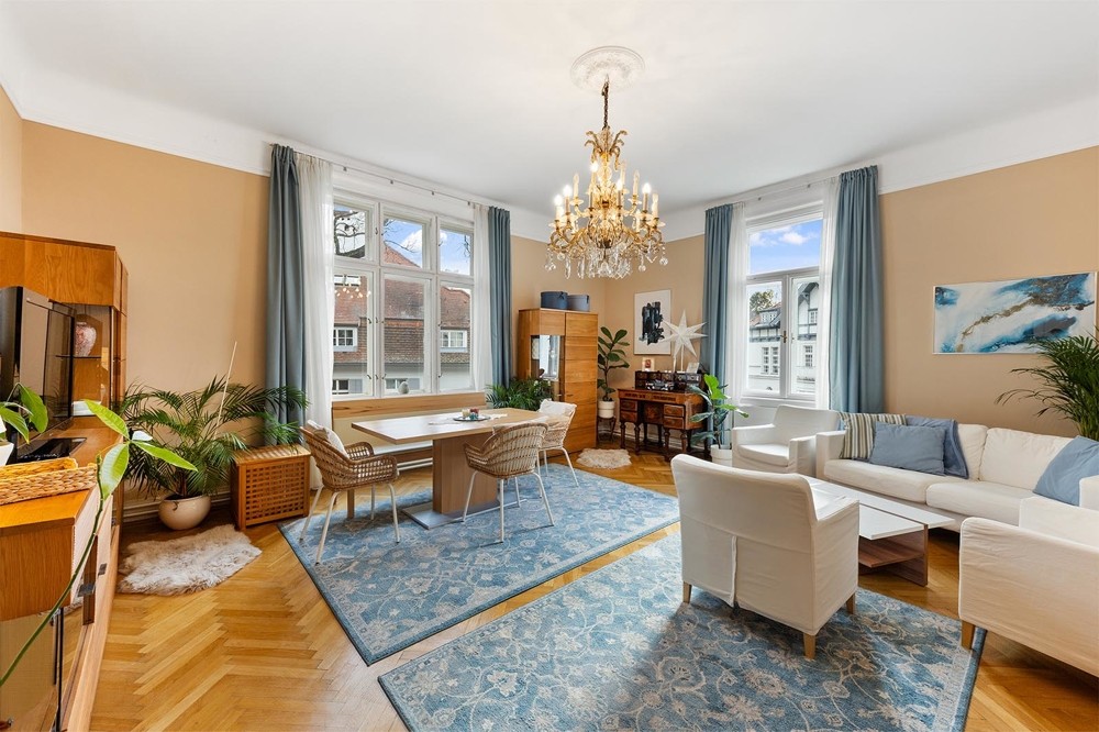 Podwyższony parter stanowi eleganckie wejście do willi. Hol wejściowy odzwierciedla historyczny charakter nieruchomości. Na powierzchni około 118 m² znajdują się trzy przestronne pokoje, urokliwa kuchnia z bezpośrednim wyjściem na taras oraz salon z eleganckim wykuszem.