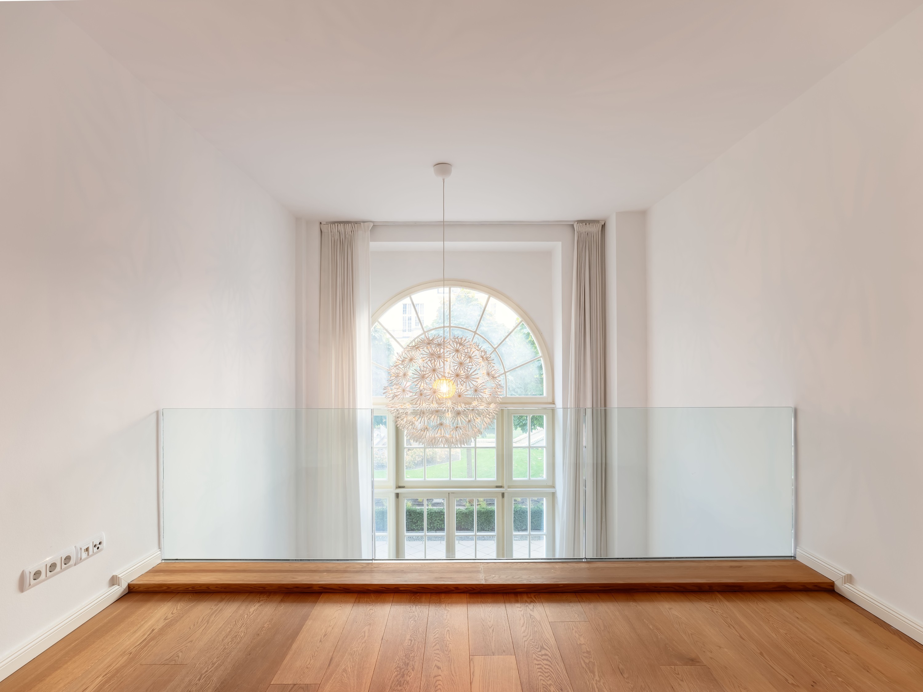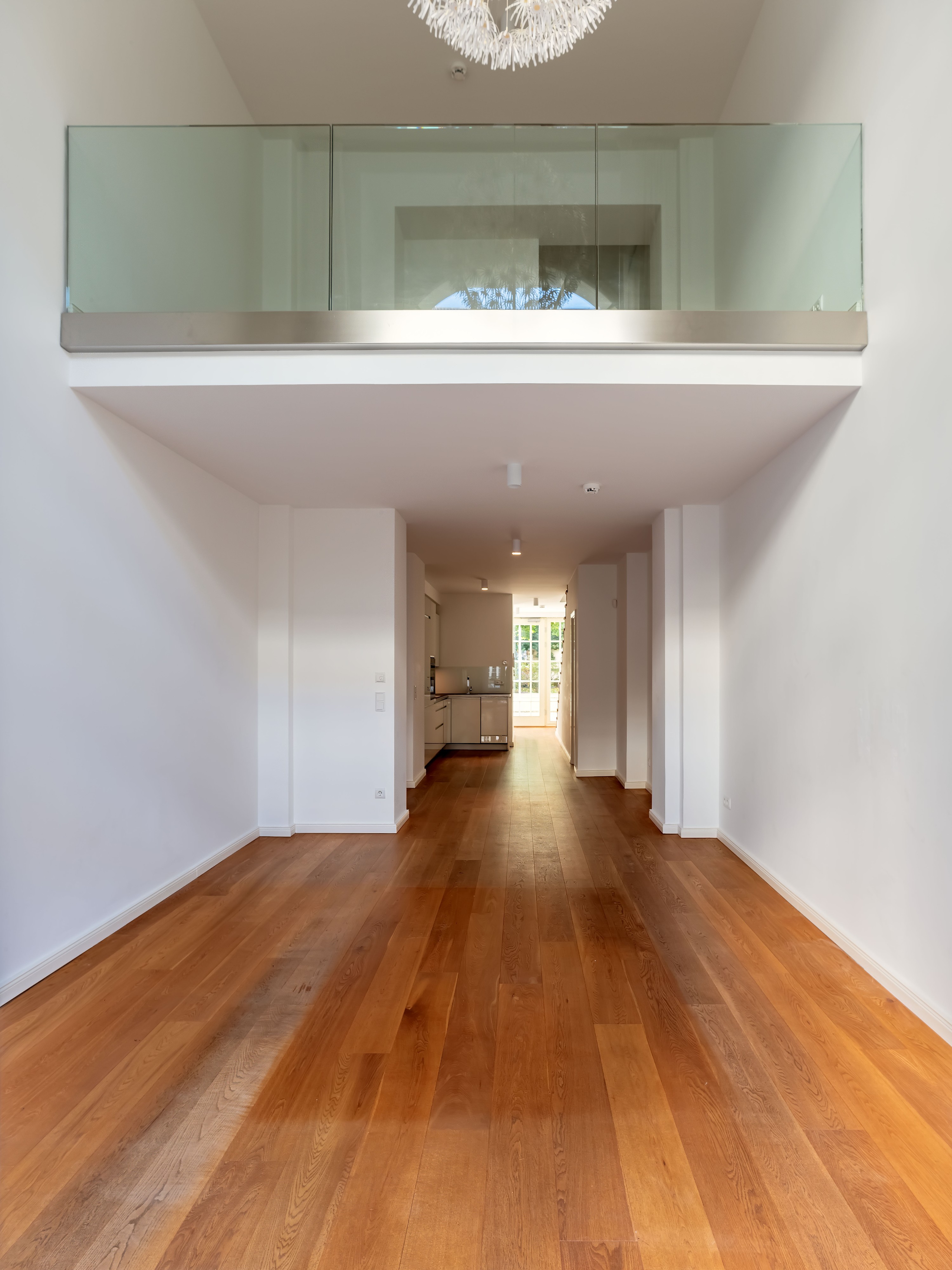 Loft wyróżnia się imponującą wysokością sufitu wynoszącą około 7 metrów, zwłaszcza po stronie dziedzińca, gdzie znajduje się subtelna galeria. Układ przestrzenny tworzy wyjątkowe wrażenie przestronności i oferuje liczne możliwości aranżacyjne – zarówno jako przestronny apartament, jak i reprezentacyjne mieszkanie z możliwością prowadzenia działalności gospodarczej. Orientacja na wschód i zachód zapewnia doskonałe doświetlenie, a okna sięgające od podłogi do sufitu oferują przepiękny widok na zadbany dziedziniec i jego ogrody.
