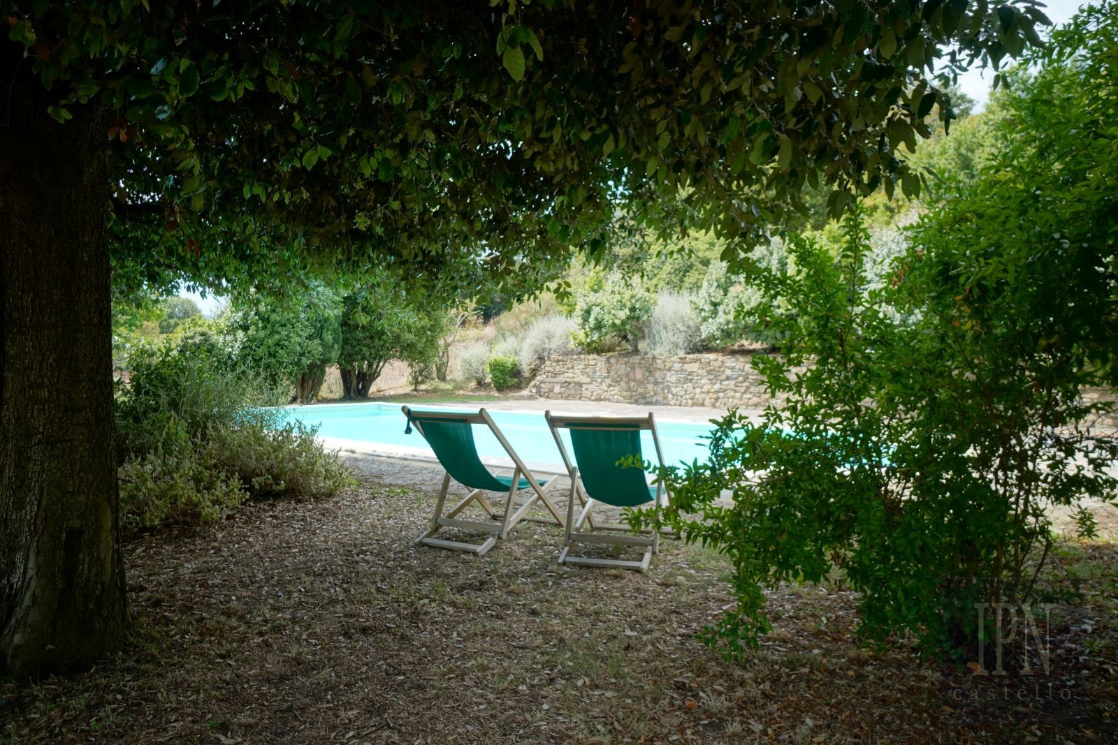 Posiadłość obejmuje również różne pomieszczenia do przechowywania oraz piwnicę, idealną do przekształcenia w piękną winiarnię. Na zewnątrz znajduje się zadbany ogród o powierzchni około 3000 m², z prywatnym basenem i zapierającym dech w piersiach widokiem na okolicę.