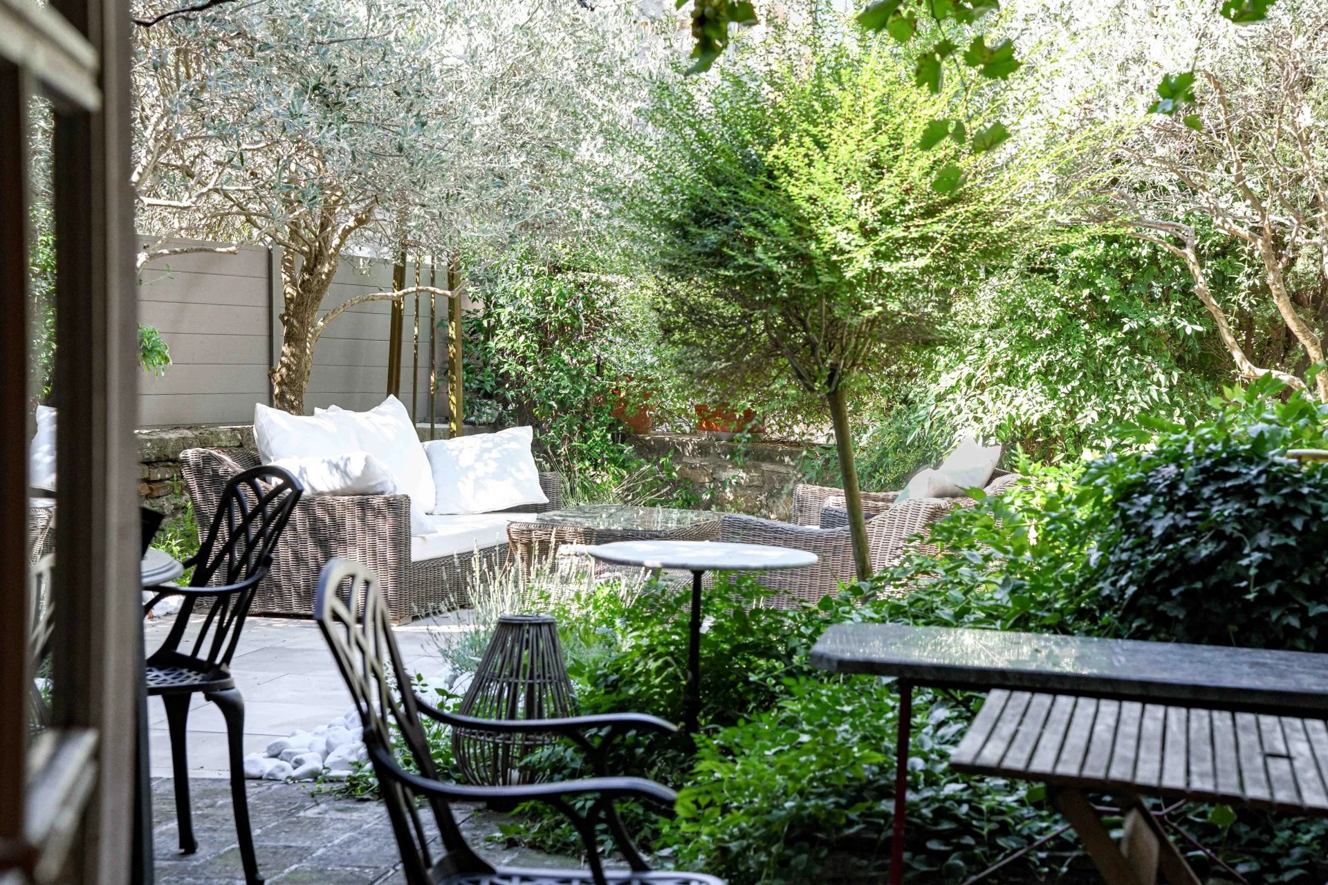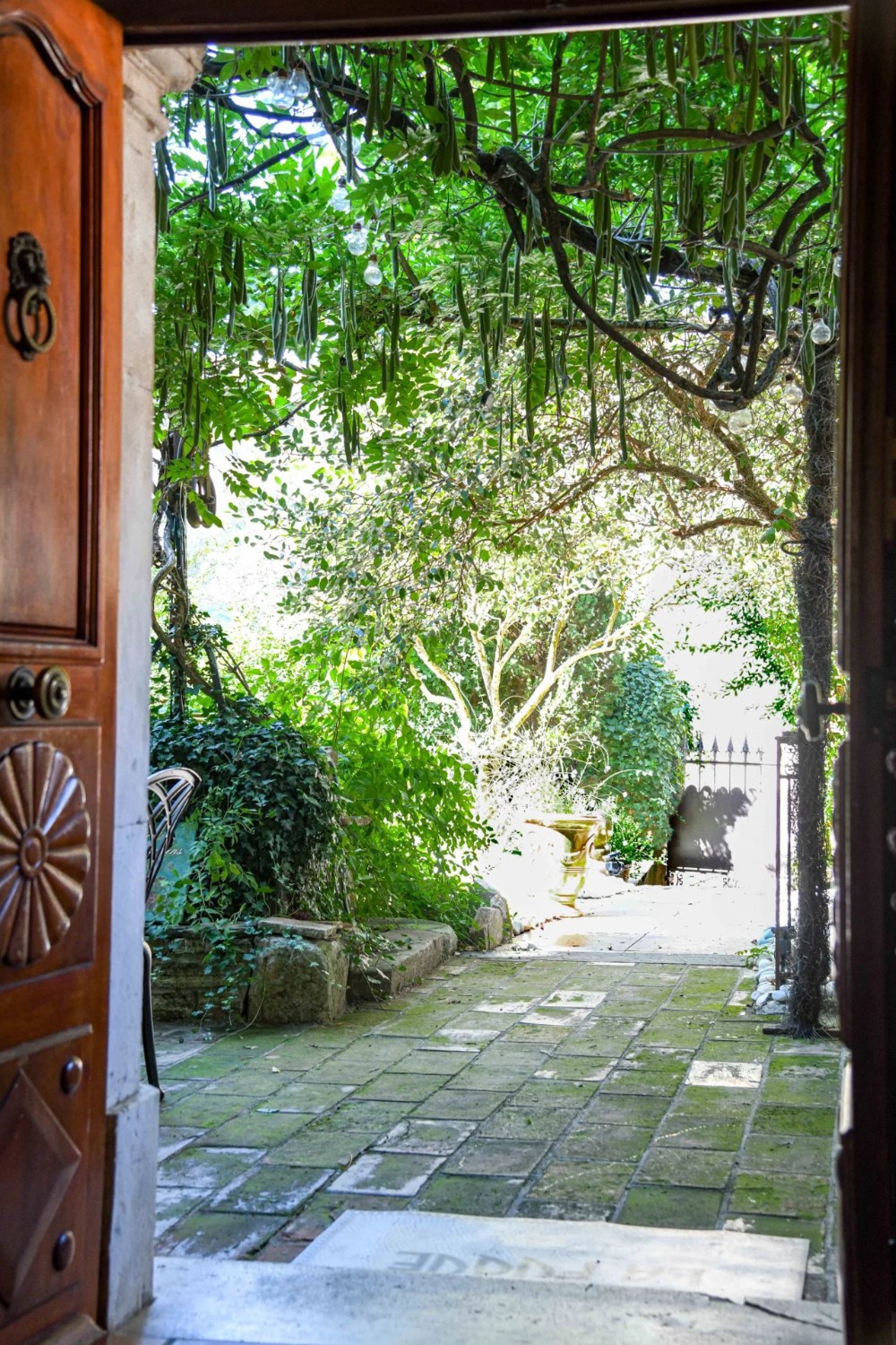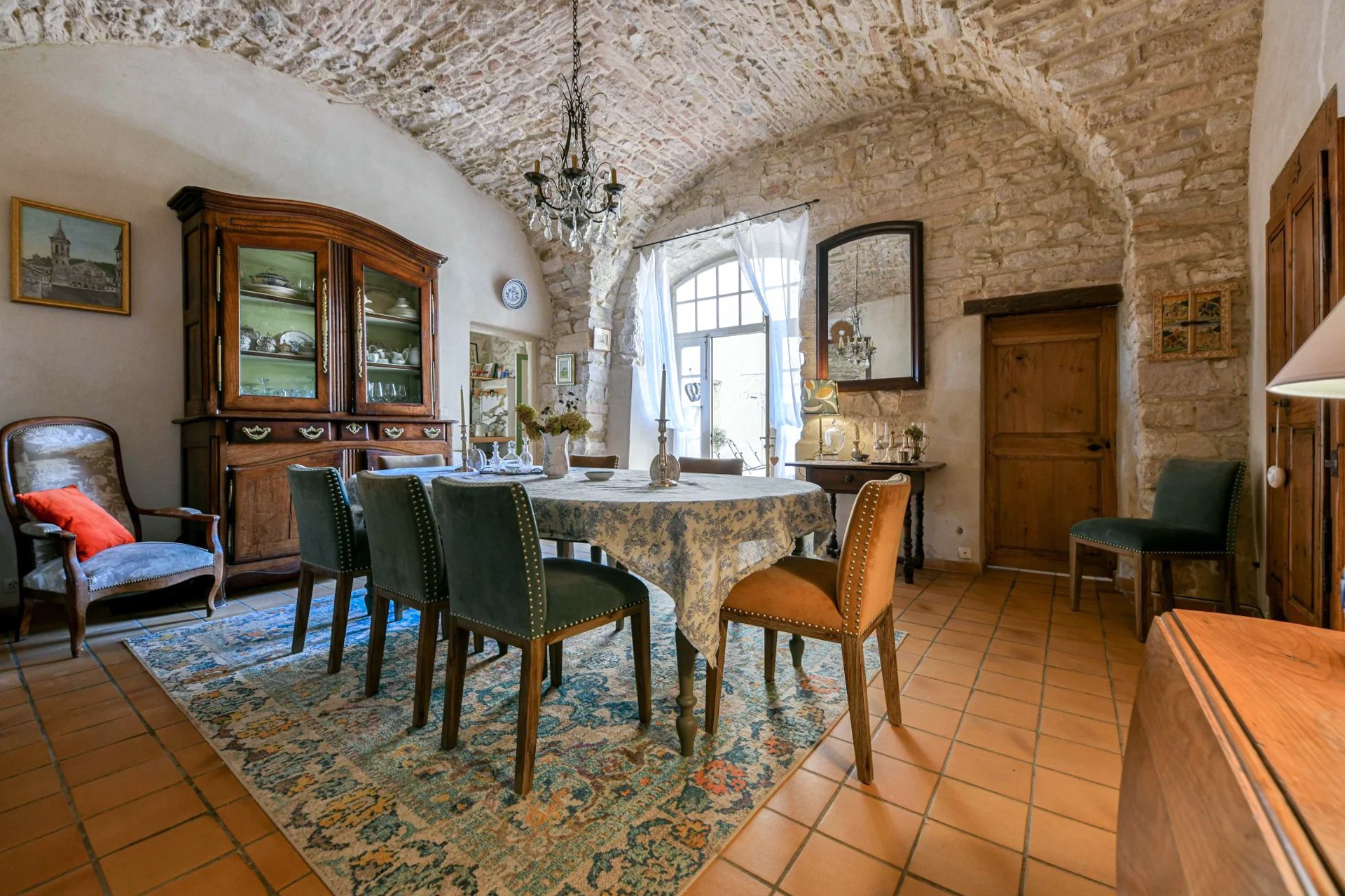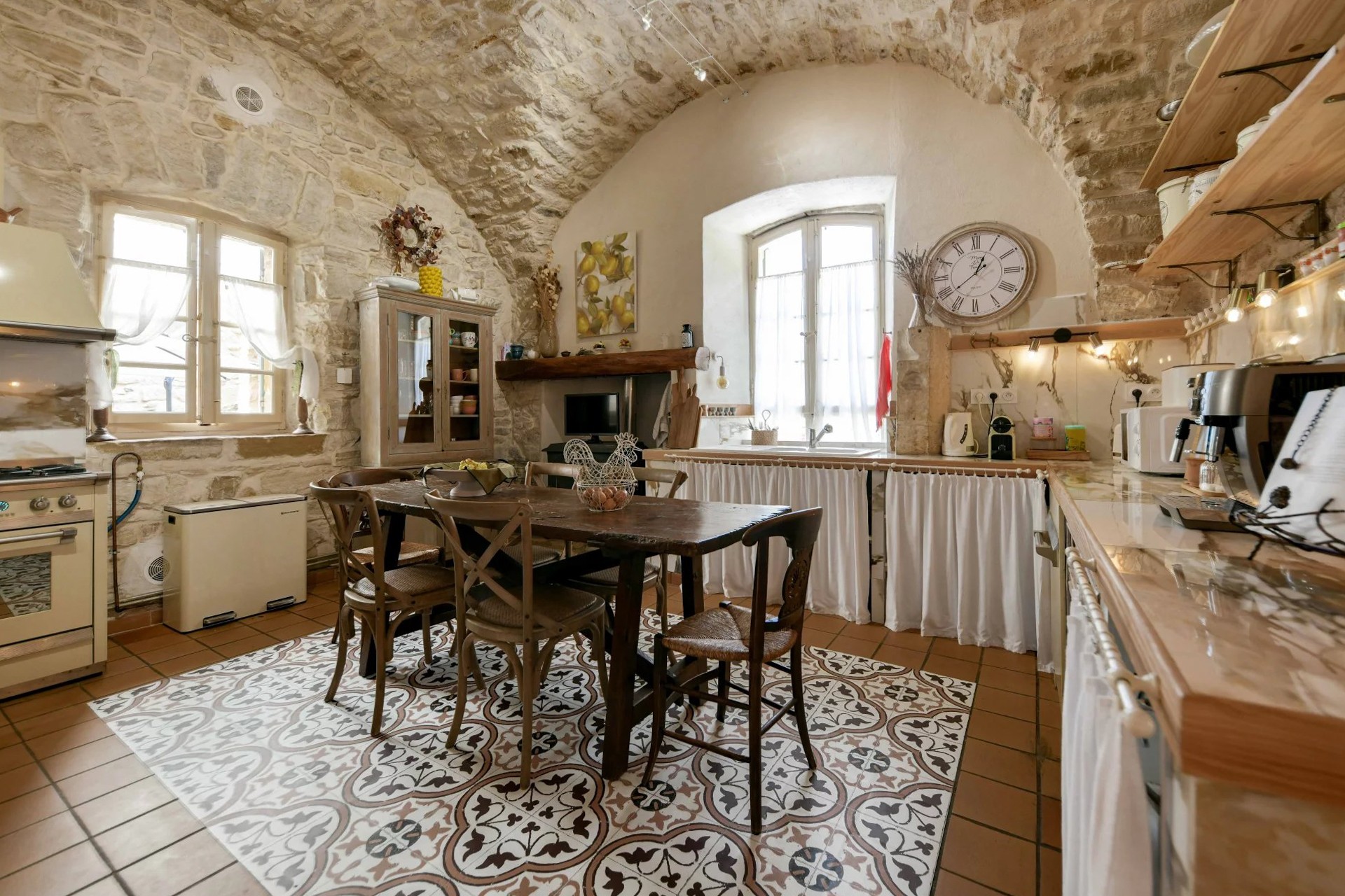 Na parterze od razu przykuwa uwagę jasny salon z pięknymi kamiennymi sklepieniami, który otwiera się na przestronny, zielony dziedziniec. Wbudowany basen z jacuzzi harmonijnie wpisuje się w prywatny ogród. Przyległa kuchnia, również z sufitem kolebkowym, uzupełniona jest dużą spiżarnią z piwniczką. Sklepiony jadalnia dopełnia parter, tworząc przytulną i elegancką przestrzeń do życia.