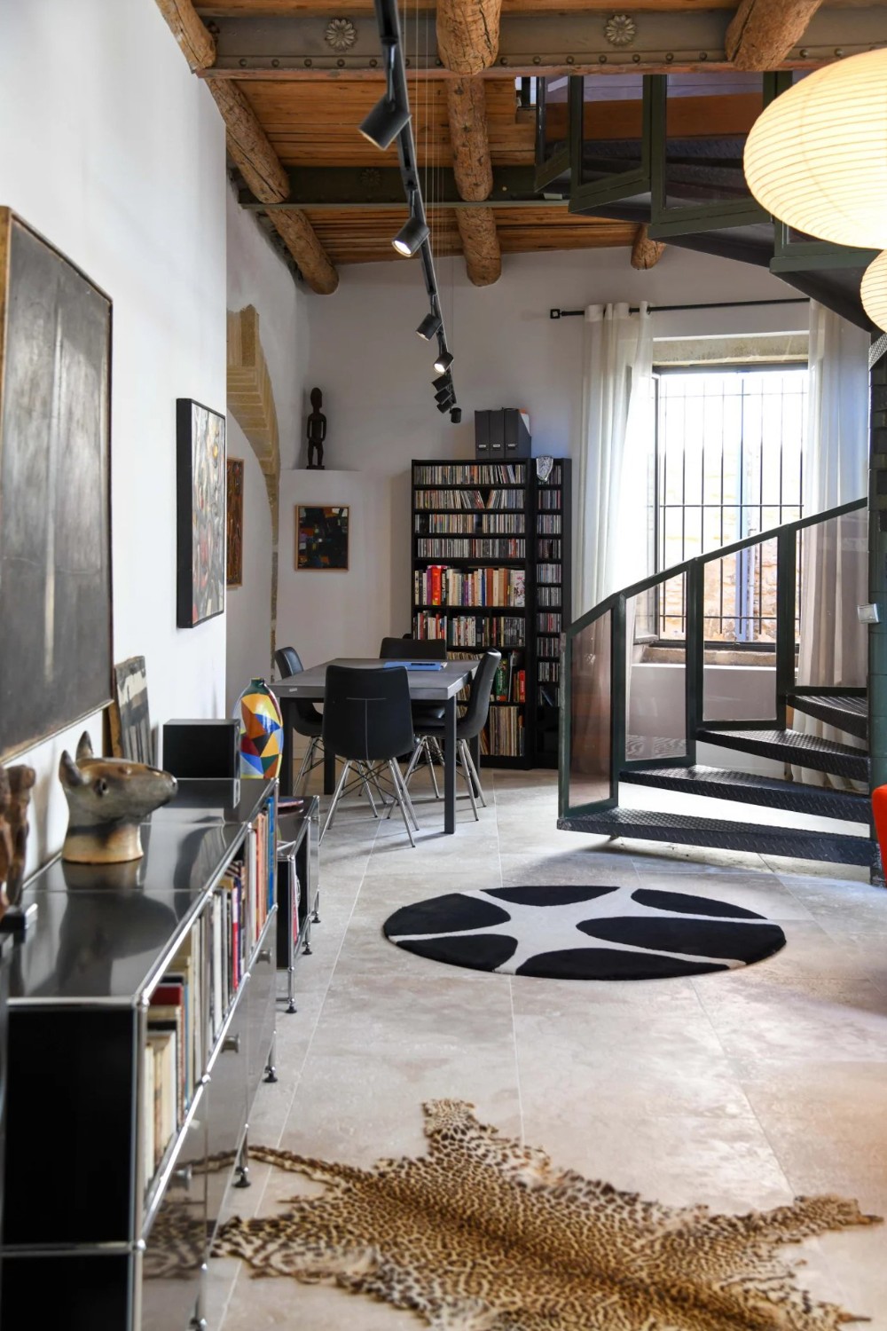 Na parterze znajduje się salon z jadalnią o podwójnej wysokości, otwierający się na zielony dziedziniec. Na tym poziomie znajduje się również sypialnia oraz łazienka z wanną, prysznicem typu walk-in i umywalką. Osobne WC dla gości.