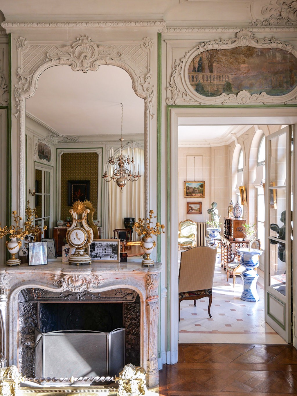 Wejście do pałacu zdobi imponująca klatka schodowa z maskaronami, misternie wykonanymi konsolami i rokokowym szczytem. Prowadzi ona do jasnego salonu w stylu Ludwika XVI ze stiukowymi reliefami, marmurowym kominkiem i podłogą ułożoną w wzór kaboszonów. Do salonu przylega pokój w stylu Régence z mistrzowską boazerią oraz jadalnia z elementami rokokowymi i kominkiem z czasów Ludwika XV.