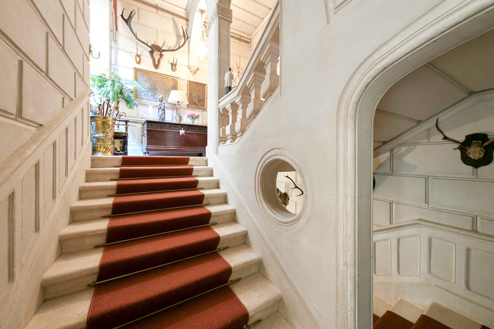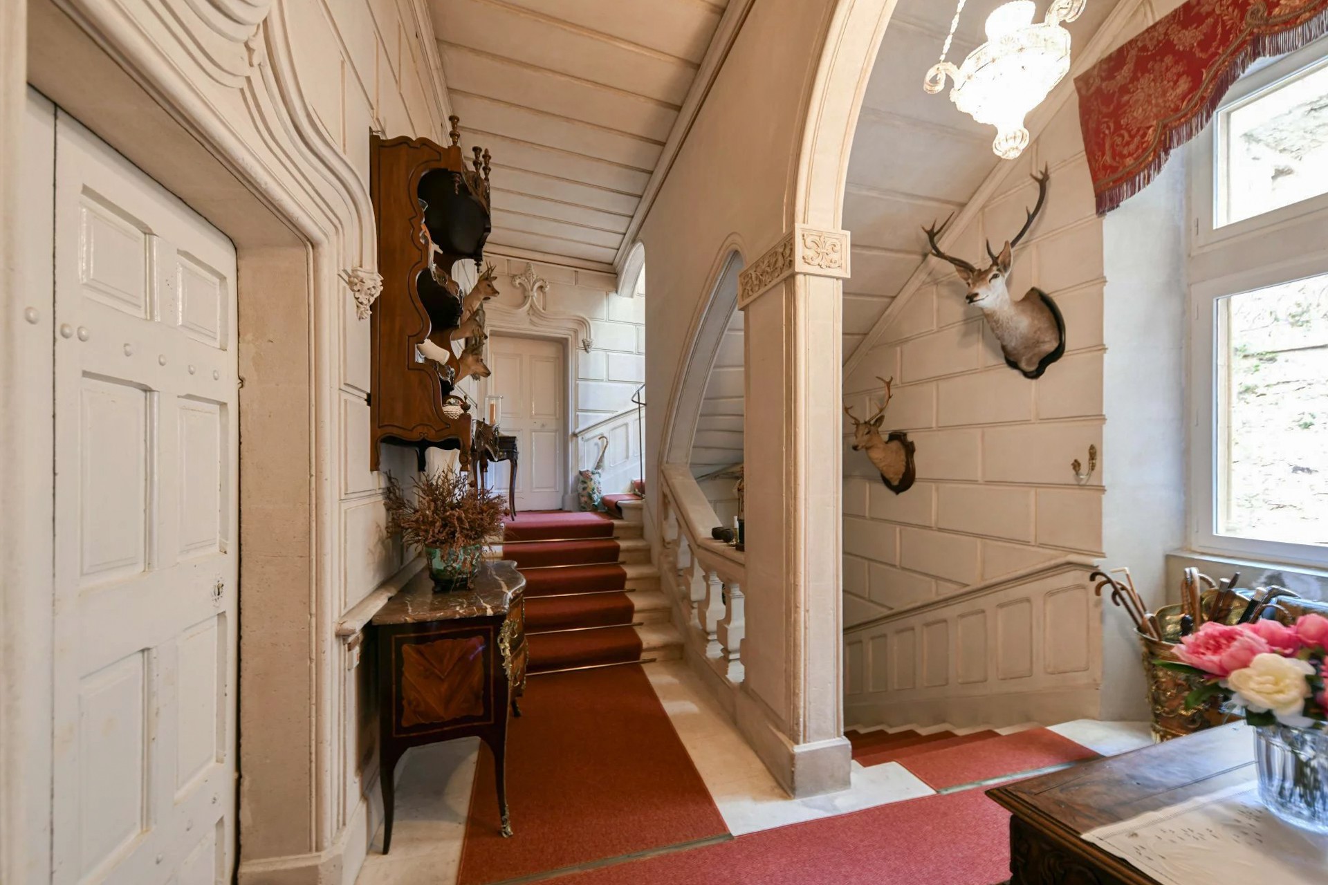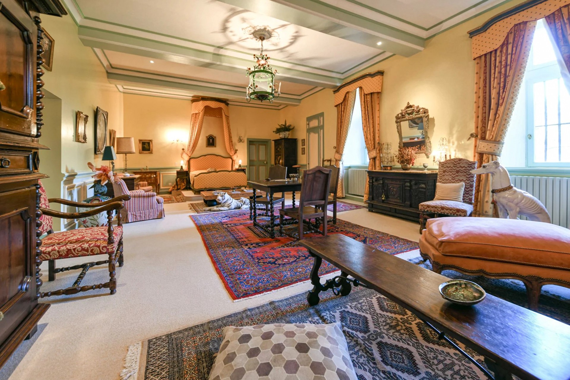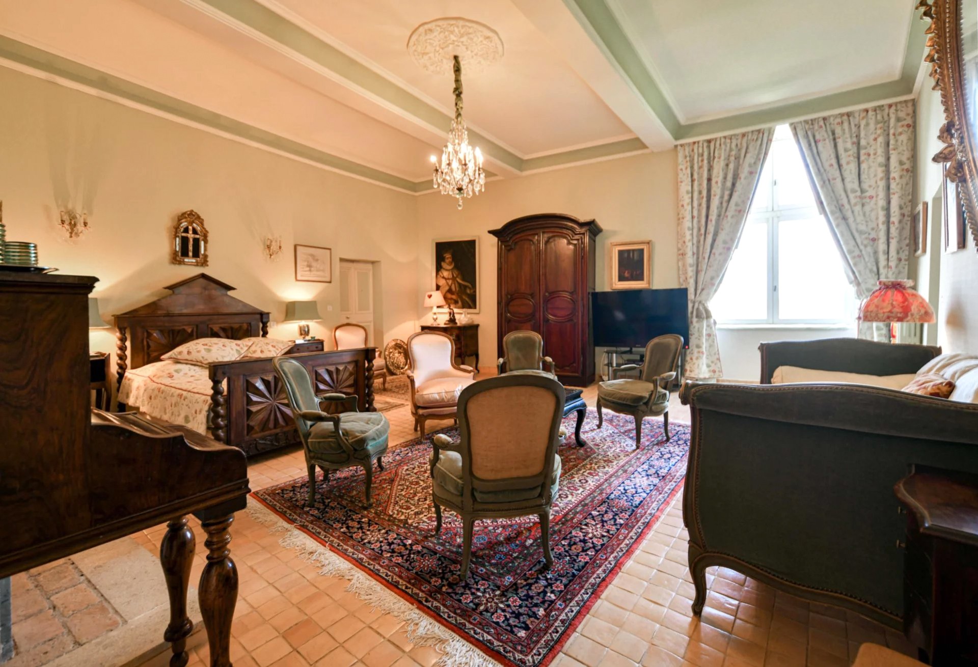 Budynek główny rozciąga się na trzech kondygnacjach. Na parterze przestronny salon z sklepieniem przyciąga oryginalnym sufitem z XVII wieku. Wytworne schody prowadzą na piętro, gdzie harmonijnie rozmieszczone są reprezentacyjne pomieszczenia: dwa salony z wysokimi oknami, jadalnia z kominkiem i biblioteka. Z długiego korytarza dostępna jest główna apartamentowa suite o powierzchni 100 m² z widokiem na park.