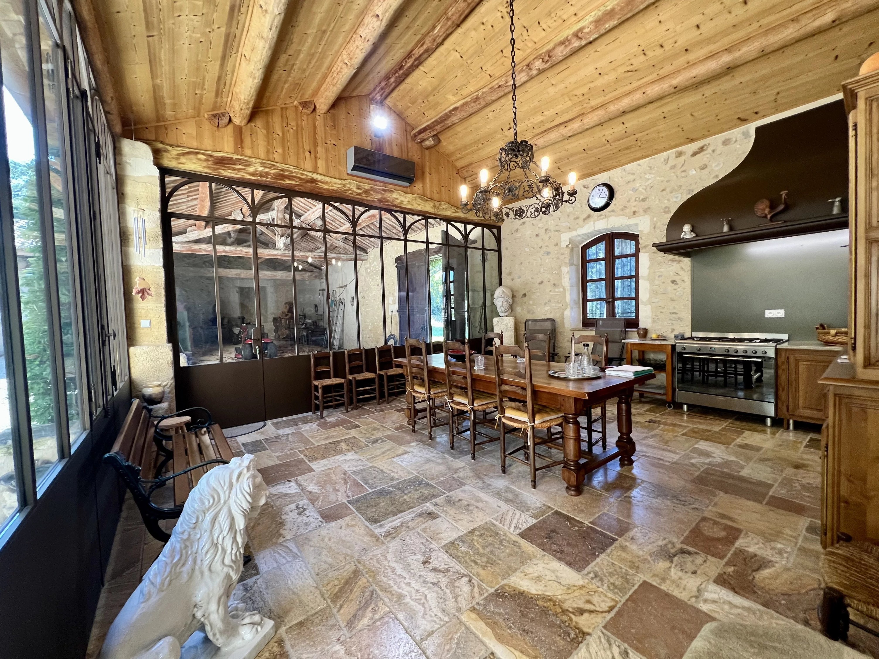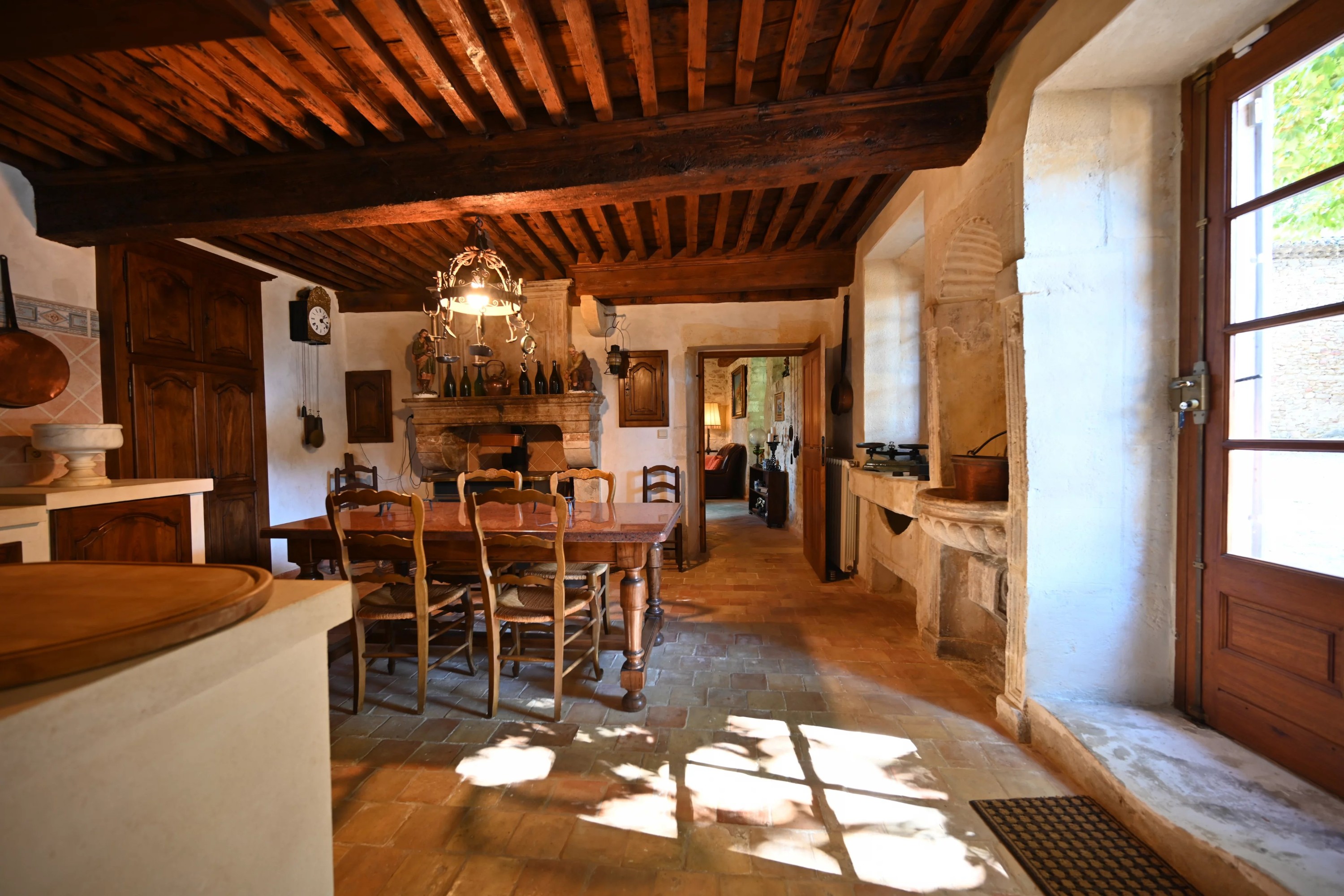 - Salon o powierzchni około 50 m² z widocznymi belkami stropowymi, kamiennym kominkiem z XVI wieku z wkładem oraz kamiennym zlewem.