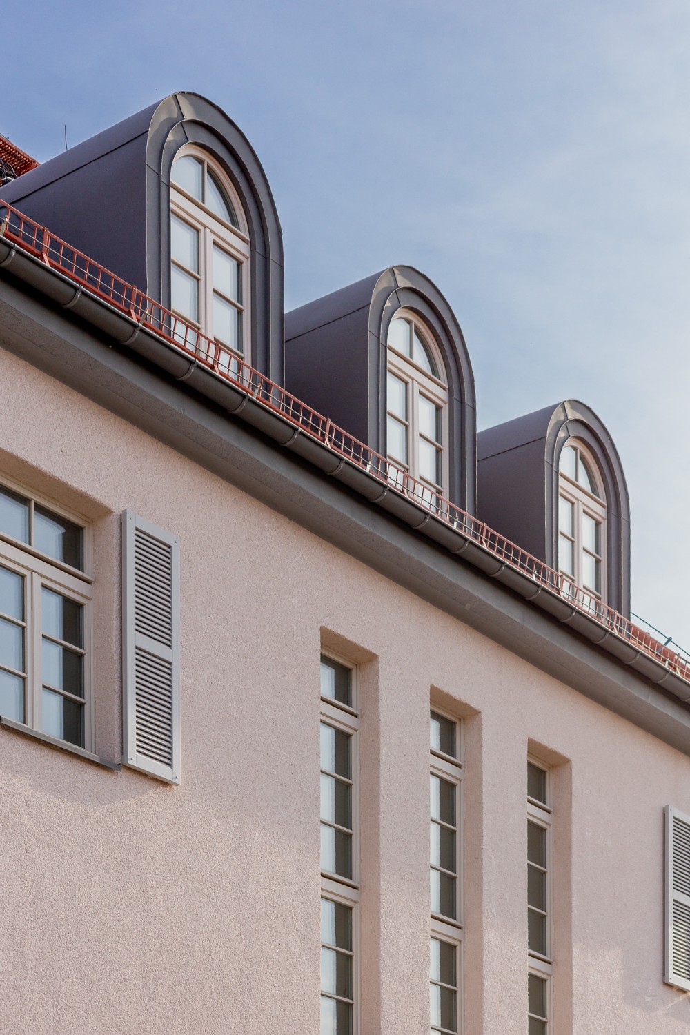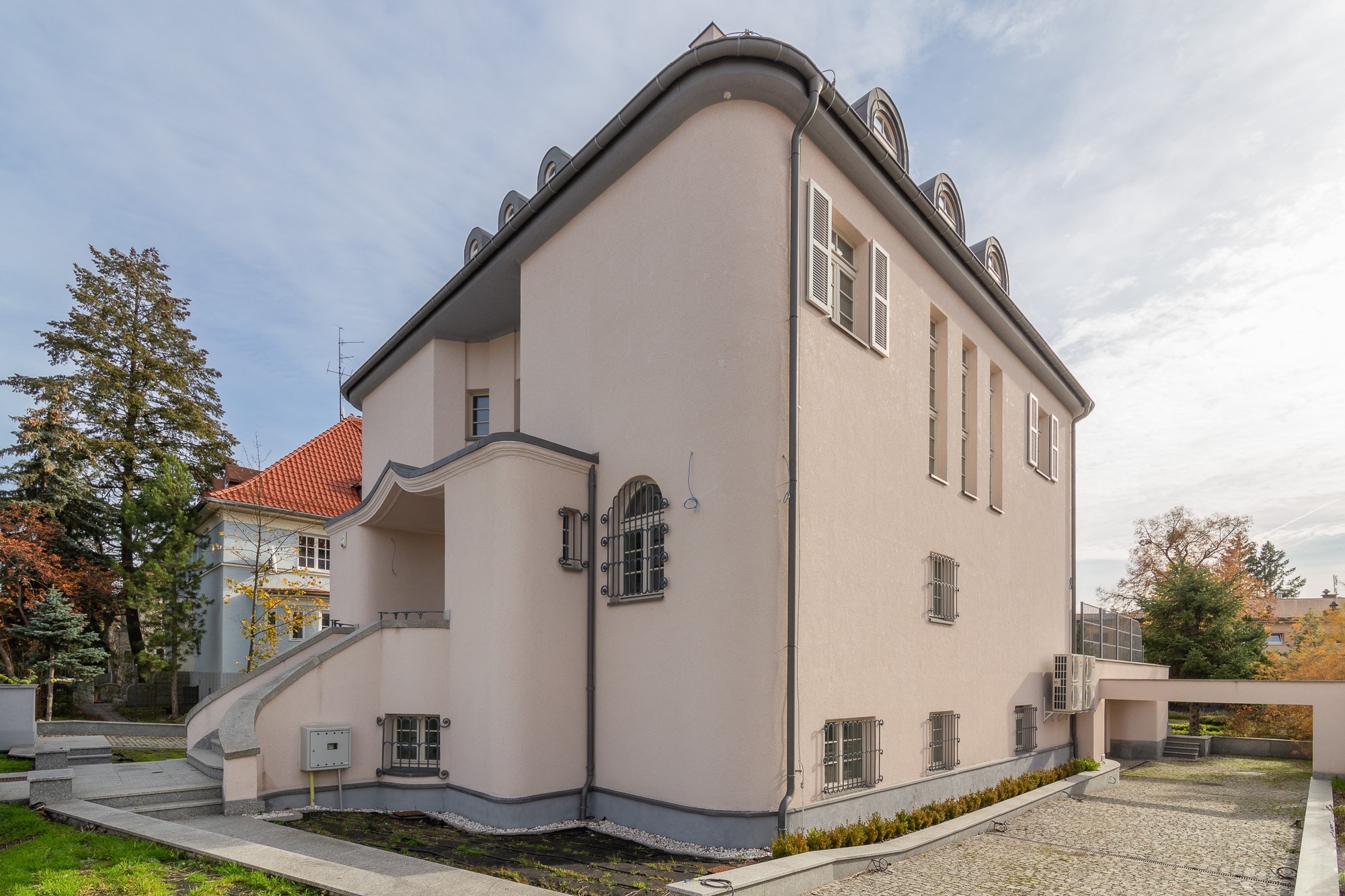 Od strony ulicy przechodzień może dostrzec prostą i surowo wyglądającą bryłę – z kilkoma niedużymi oknami zabezpieczonymi kratami. Zwieńczoną dachem o kształcie przypominającym czapeczki pajacyków z dzieł Makowskiego. Obiekt z tej perspektywy przypomina na pierwszy rzut oka bardziej schron, aniżeli budynek mieszkalny.