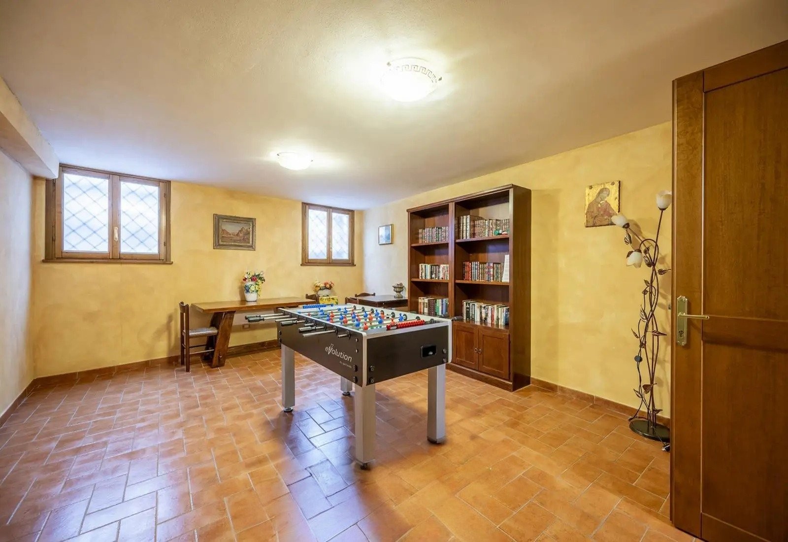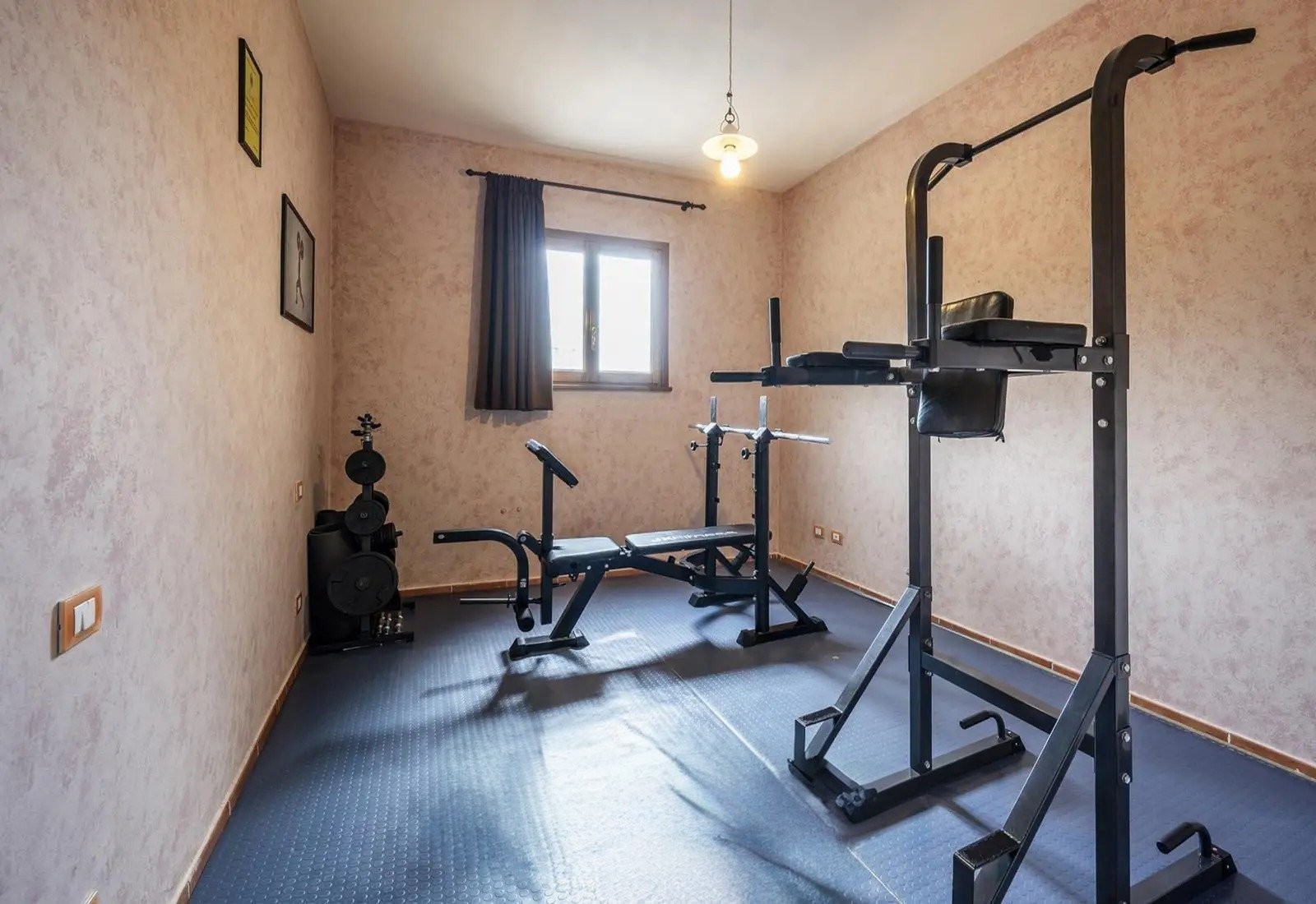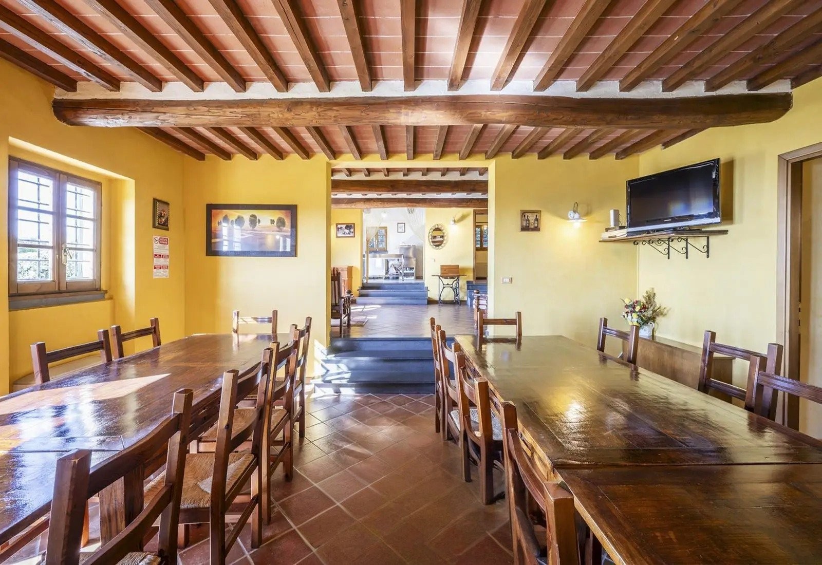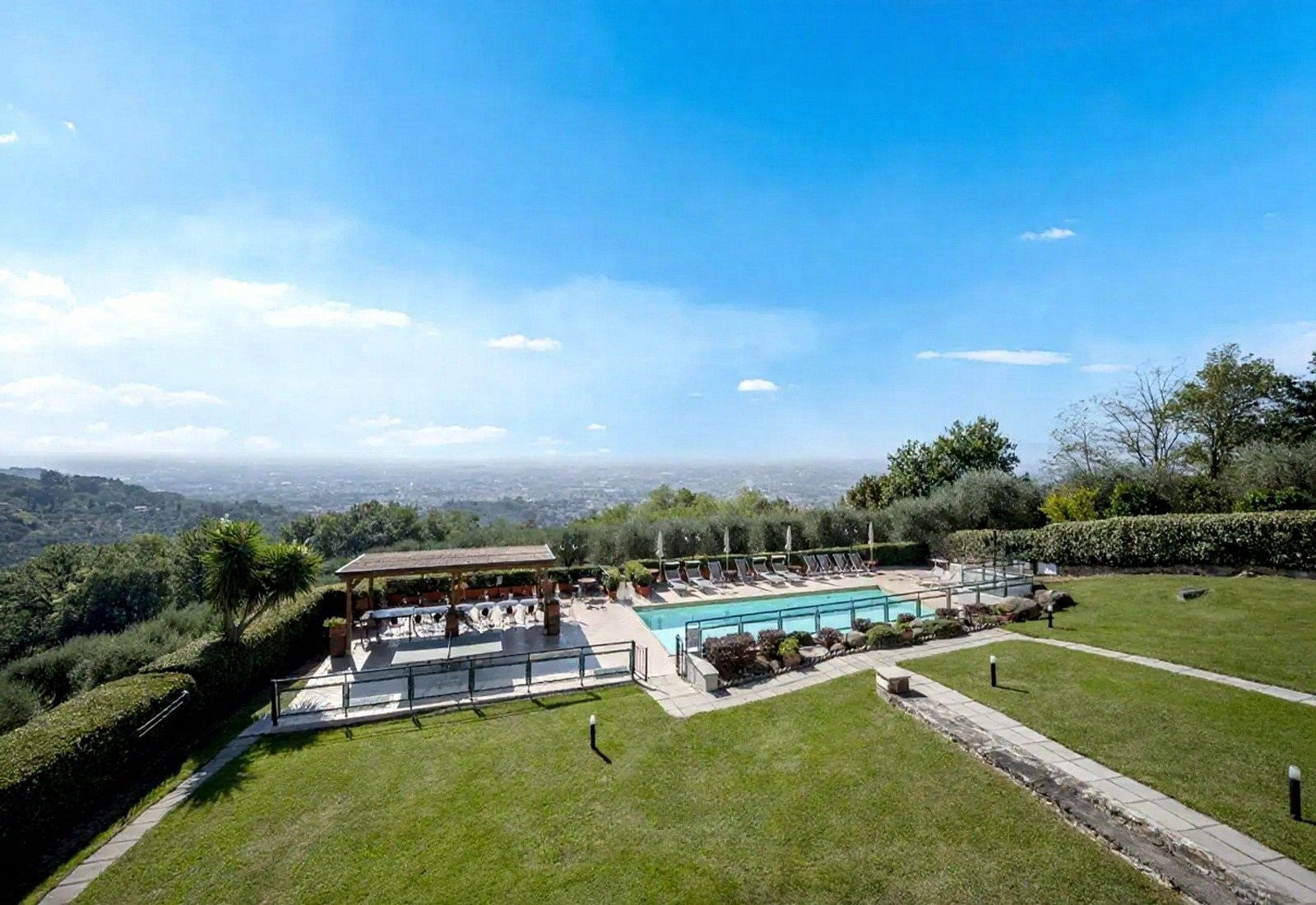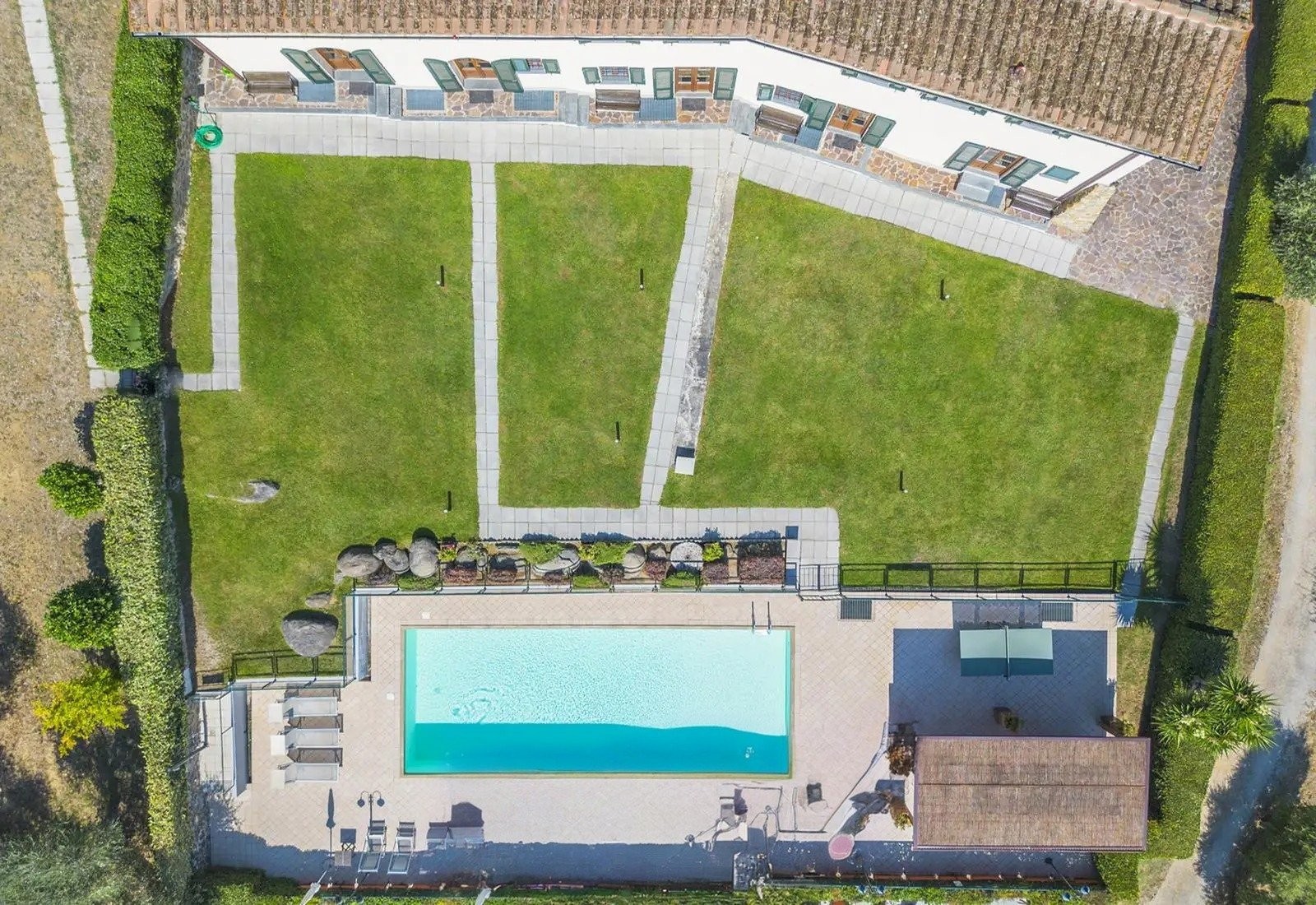 Teren zachowuje funkcjonalny charakter rolniczy, oferując jednocześnie infrastrukturę rekreacyjną i sportową. Basen ma wymiary 5,5 × 12 metrów i przylega do tarasu-solarium z widokiem na dolinę i Montecatini Terme. Na posesji znajdują się także boiska do siatkówki, piłki nożnej, koszykówki i badmintona, zadaszony pawilon z grillem oraz miejsce na ognisko. Układ terenu pozwala na niezależne funkcjonowanie części rekreacyjnych względem stref mieszkalnych, a wysokość i orientacja działki zapewniają naturalną wentylację oraz panoramiczne widoki.