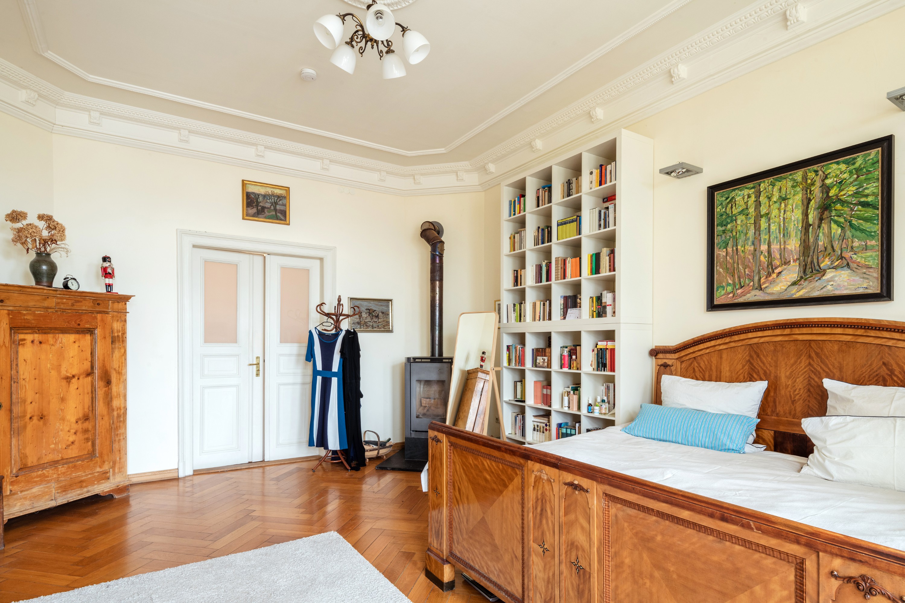 Układ obejmuje cztery główne pomieszczenia, przestronną kuchnię z jadalnią, dwie łazienki, garderobę lub pokój gościnny, taras oraz dwa balkony. Do wyjątkowych atutów należą piec opalany drewnem w salonie oraz oryginalny, ręcznie malowany sufit w głównej łazience.