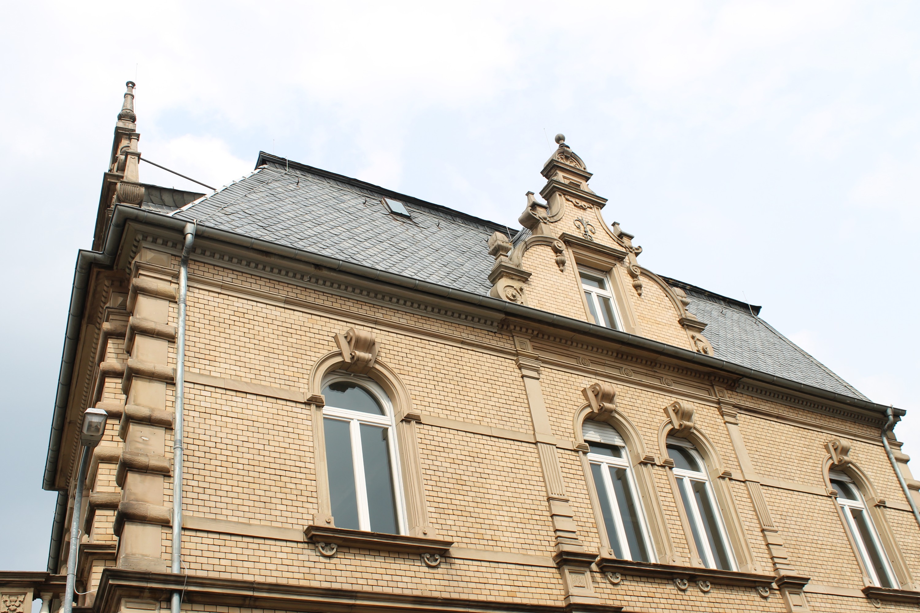 Budynek dwupiętrowy, wzniesiony z jasnej cegły i bogato zdobiony ornamentami z piaskowca w stylu neorenesansowym. Architektura nawiązuje do reprezentacyjnych willi z tego okresu: elewacje są podzielone przez płaskie ryzality, łamane dachy, balustrady i misternie obramowane okna łukowe i półokrągłe. Strome dachy mansardowe pokryte są łupkiem.