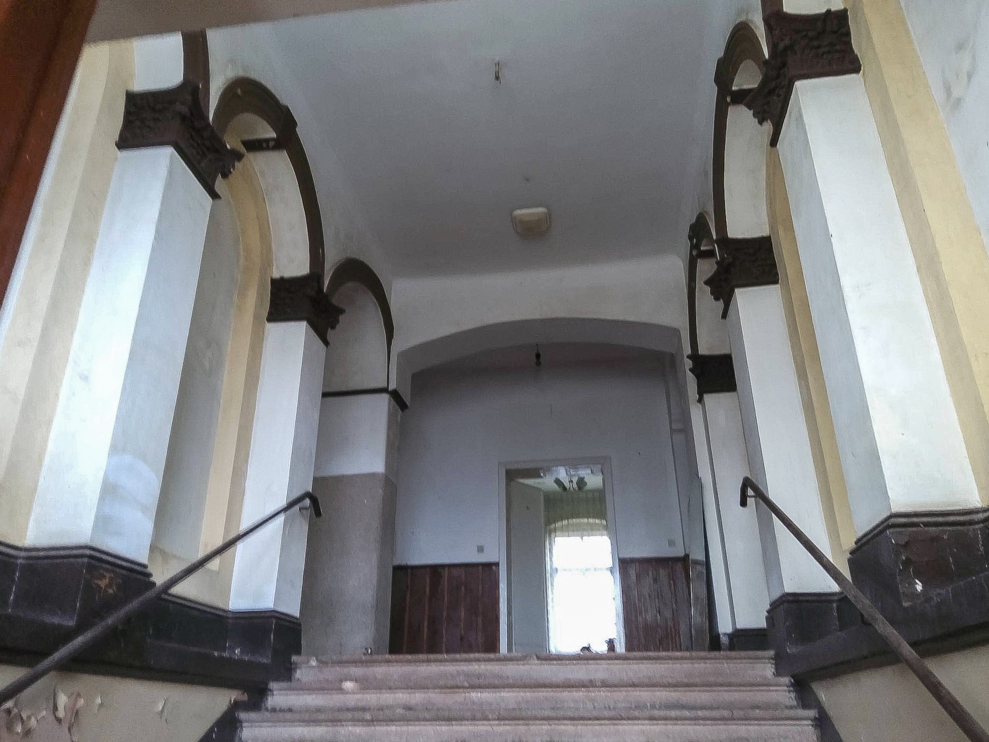Reprezentacyjne wejście wewnątrz pałacu z zachowanym pierwotnym wystrojem prowadzi na wysoki parter. Szerokie schody zdobione płytkimi arkadami i kompozytowymi pilastrami robią niesamowite wrażenie.
