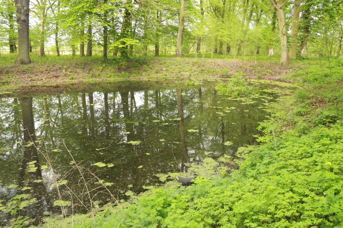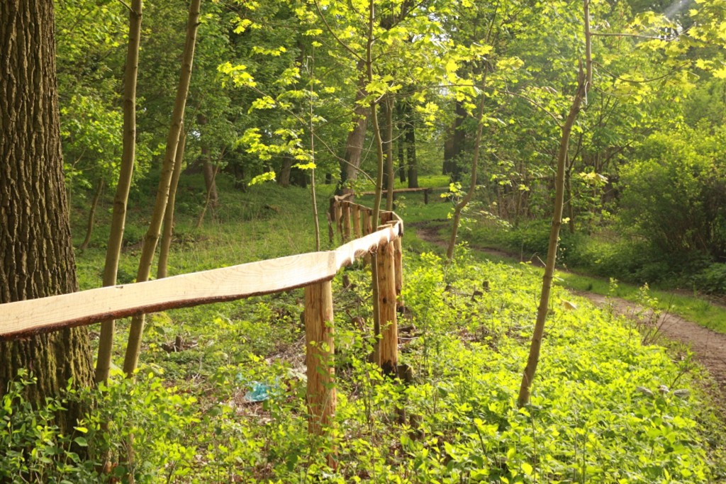 Budynek otoczony parkiem, który od północnej strony graniczy z pozostałościami folwarku, od południa park opada w kierunku stawów, dalej las oraz łąki. Część granic parku posiada naturalny charakter. Łączna powierzchnia parku to 66.442 m2.