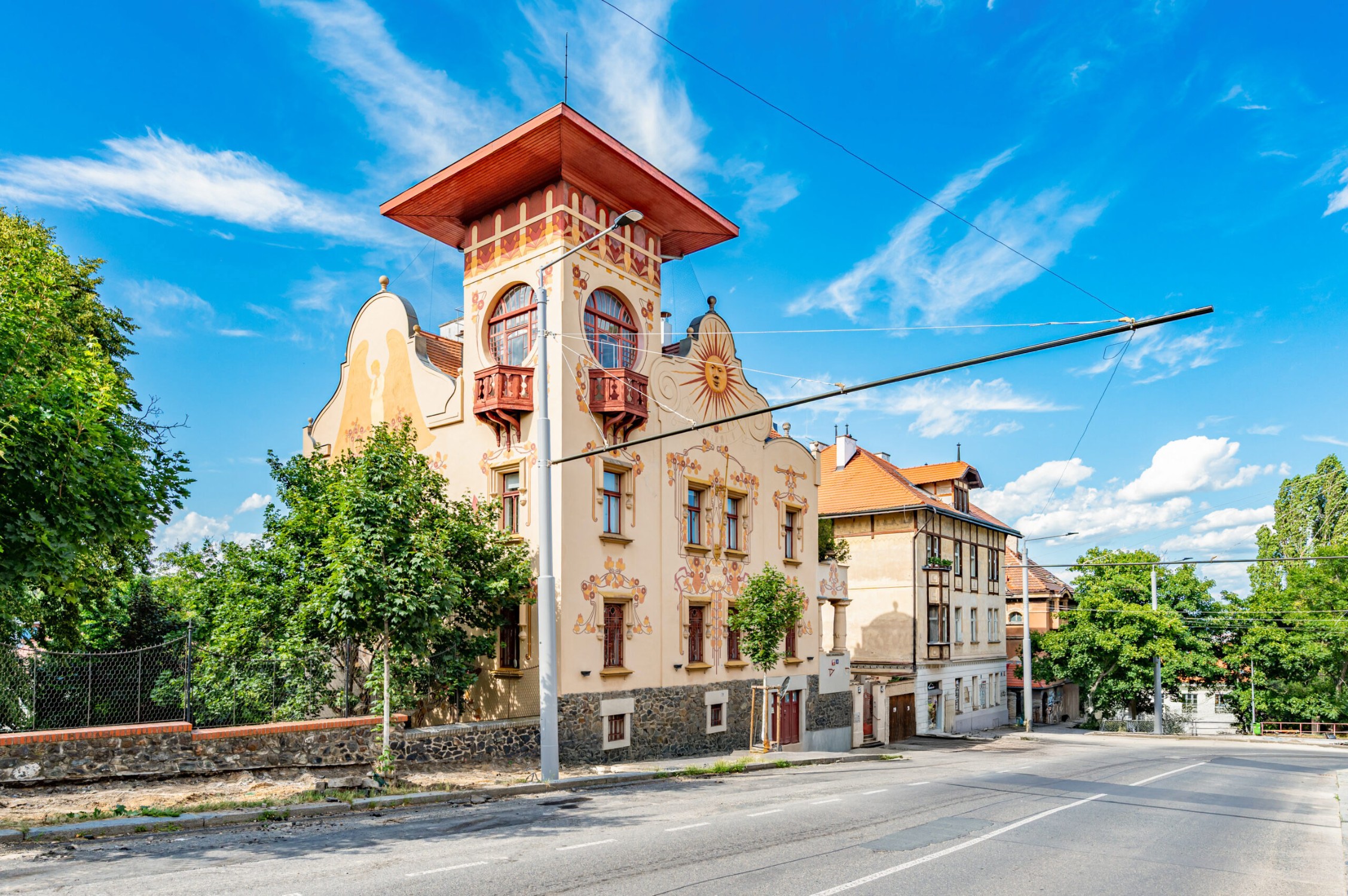 Fasada willi została zaprojektowana i ozdobiona przez wybitnego malarza akademickiego Františka Koblihę. Ozdoby obejmują ornamenty, freski, figurę anioła i zegar słoneczny – wszystkie utrzymane w najczystszej estetyce secesyjnej.