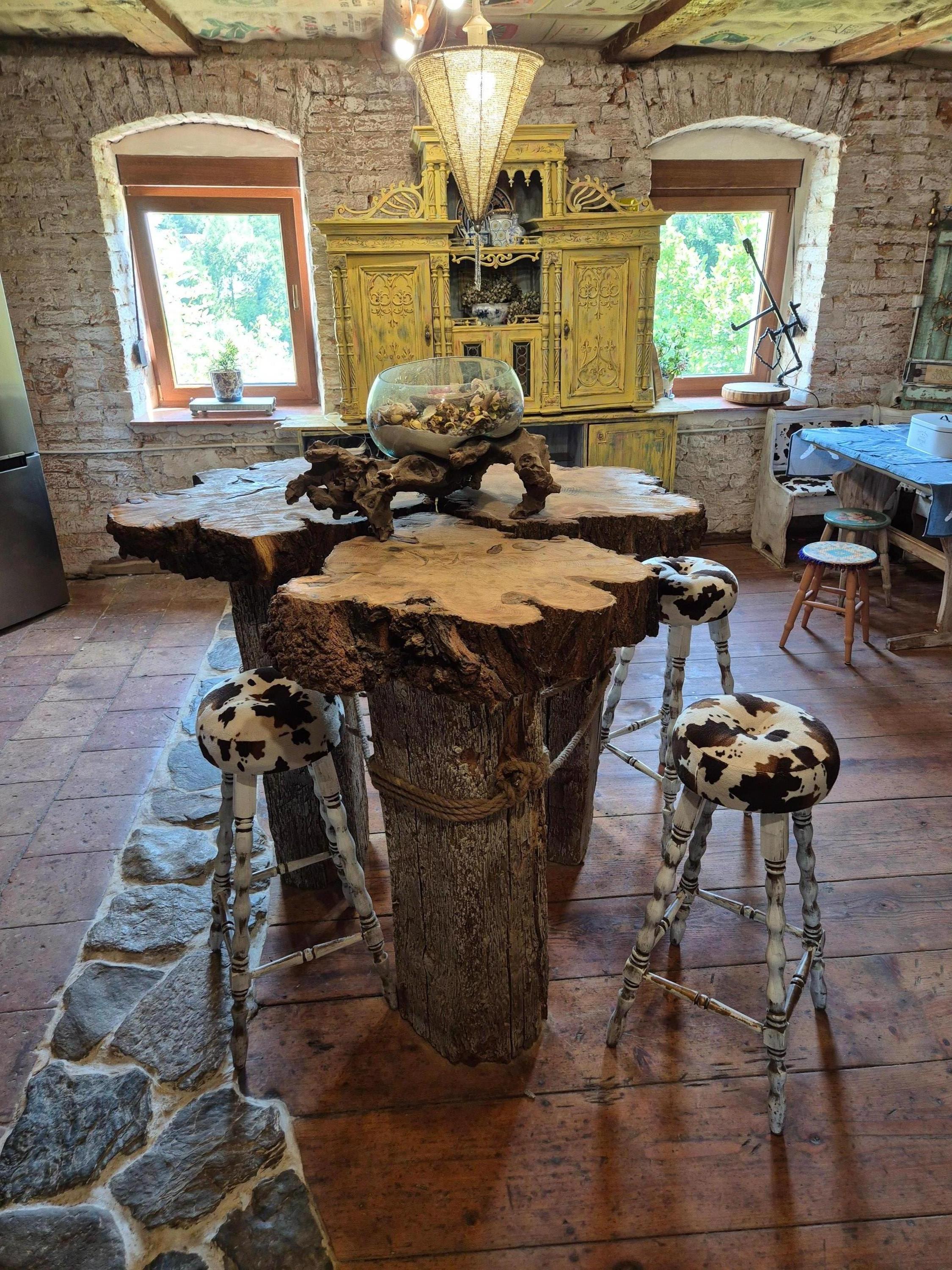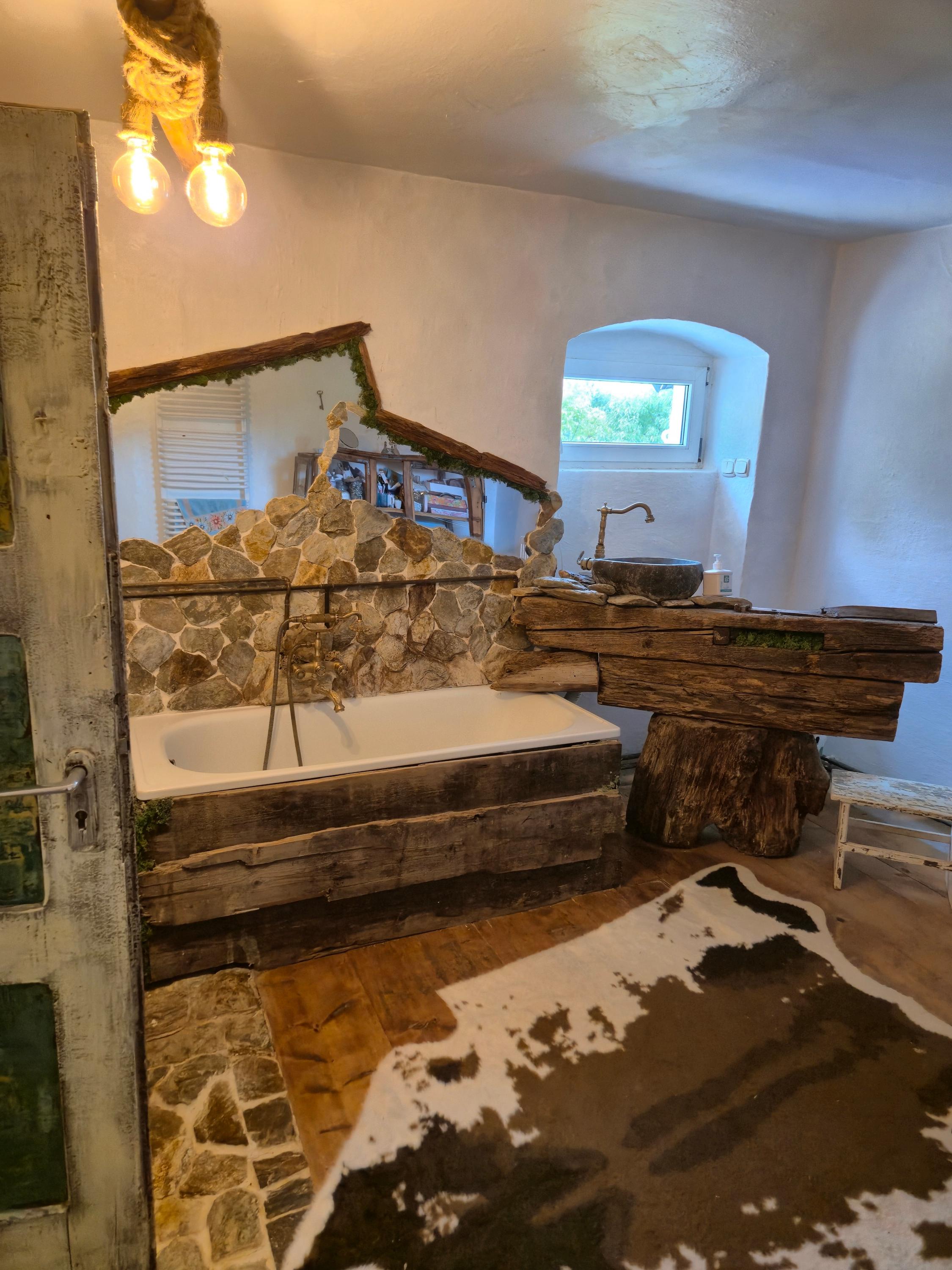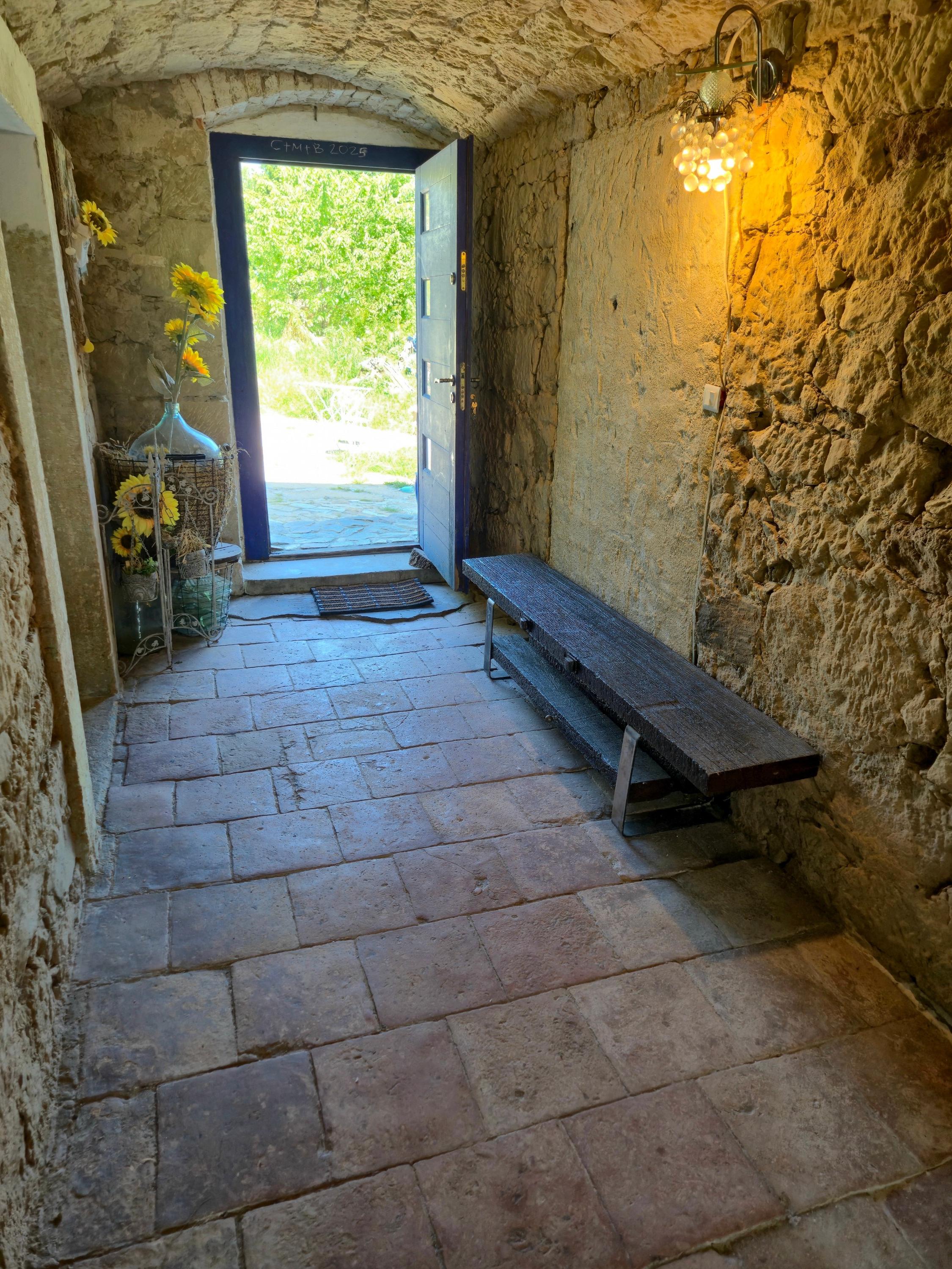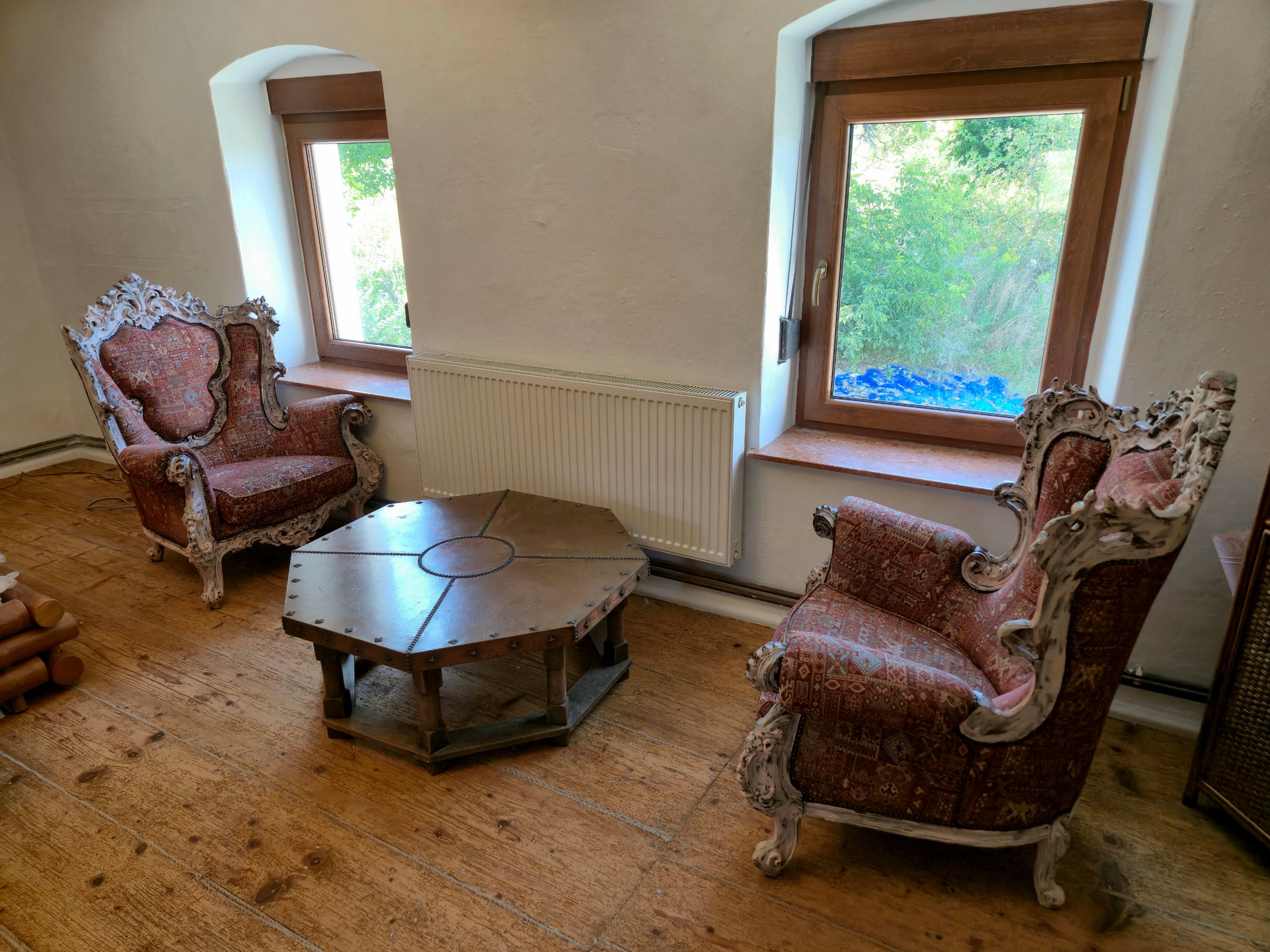 Na posesji znajduje się również stajnia z oryginalnymi sklepieniami krzyżowymi – obecnie w trakcie renowacji z przeznaczeniem na salon kominkowy i strefę SPA. Obok domu znajdują się nastrojowe kamienne ruiny, które pełnią funkcję patio – idealne miejsce do wypoczynku.