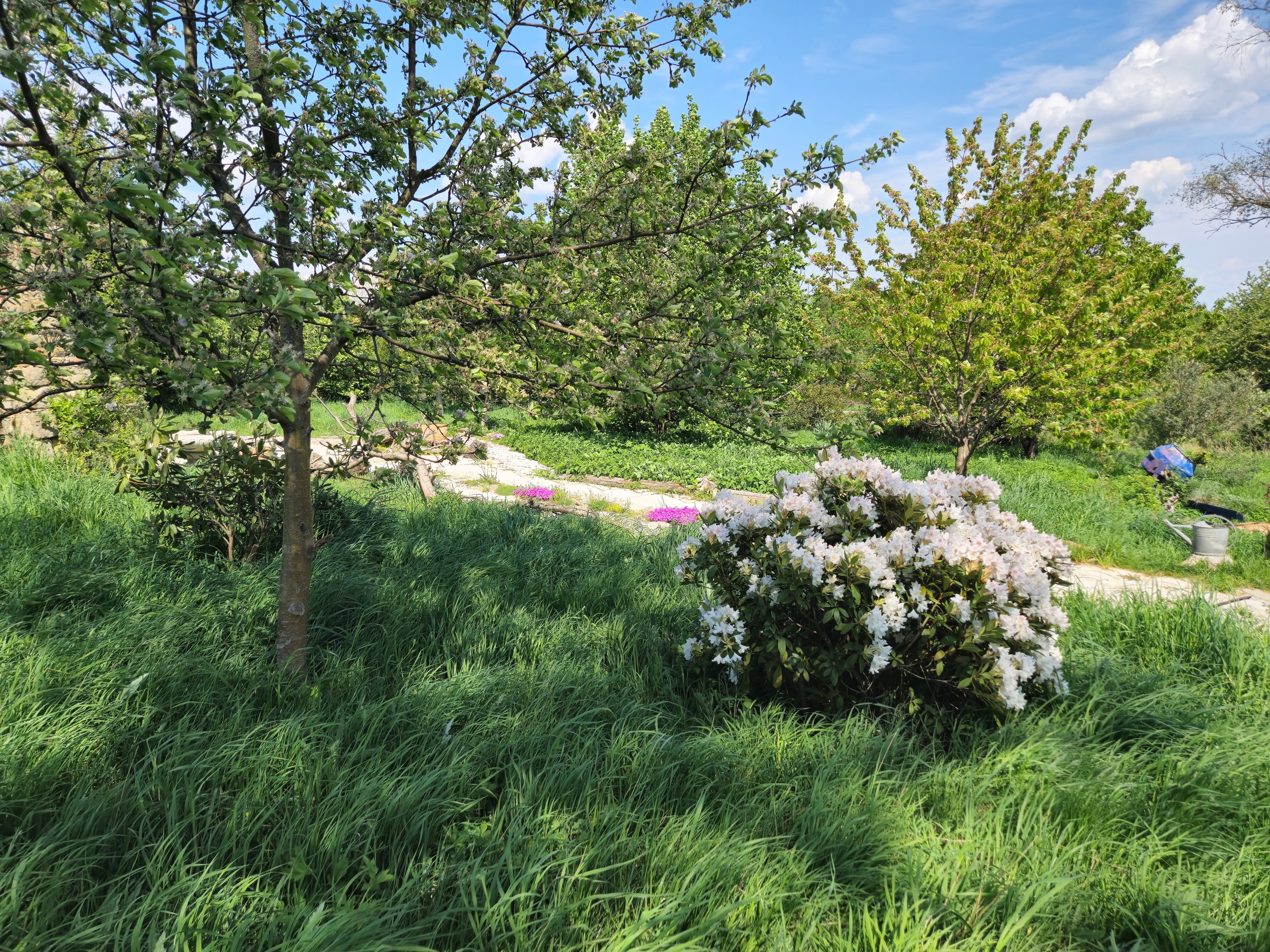 Zadbany, z licznymi starymi drzewami, krzewami ozdobnymi i drzewami owocowymi.