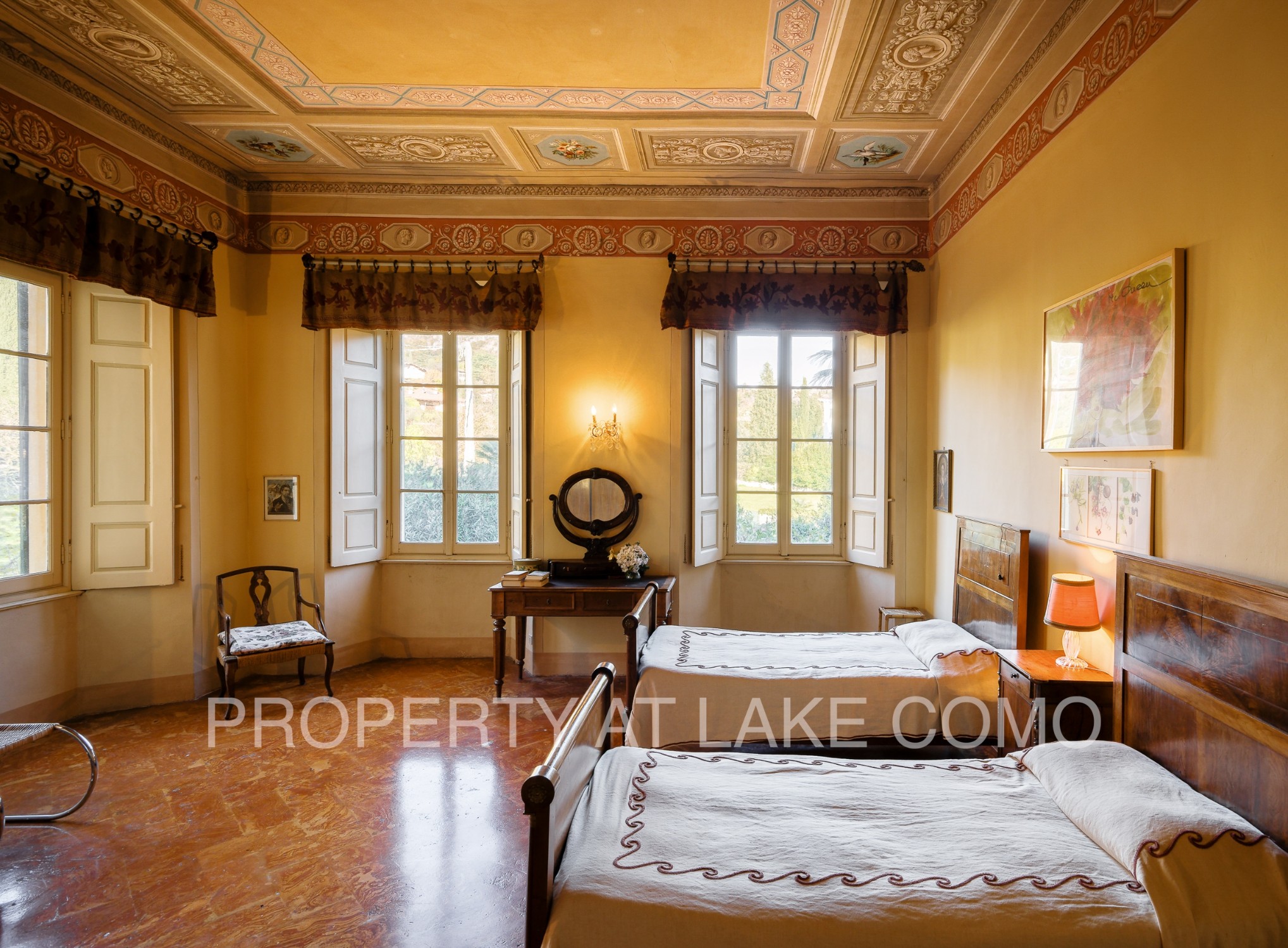 Granitowe schody prowadzą na pierwsze piętro, gdzie znajduje się przestronny korytarz z dostępem do balkonu z widokiem na jezioro. Na tym piętrze znajdują się cztery przestronne sypialnie z widokiem na jezioro i niesamowite freski na suficie, jedna sypialnia jednoosobowa oraz dwie łazienki. Drugie piętro składa się z dwóch mieszkań, do których można także wejść z ogrodu. W piwnicy znajdują się pomieszczenia techniczne, magazyny oraz piwnica na wino. Do nieruchomości należy także mieszkanie dla dozorcy o powierzchni około 100 m², które wymaga pełnego remontu.