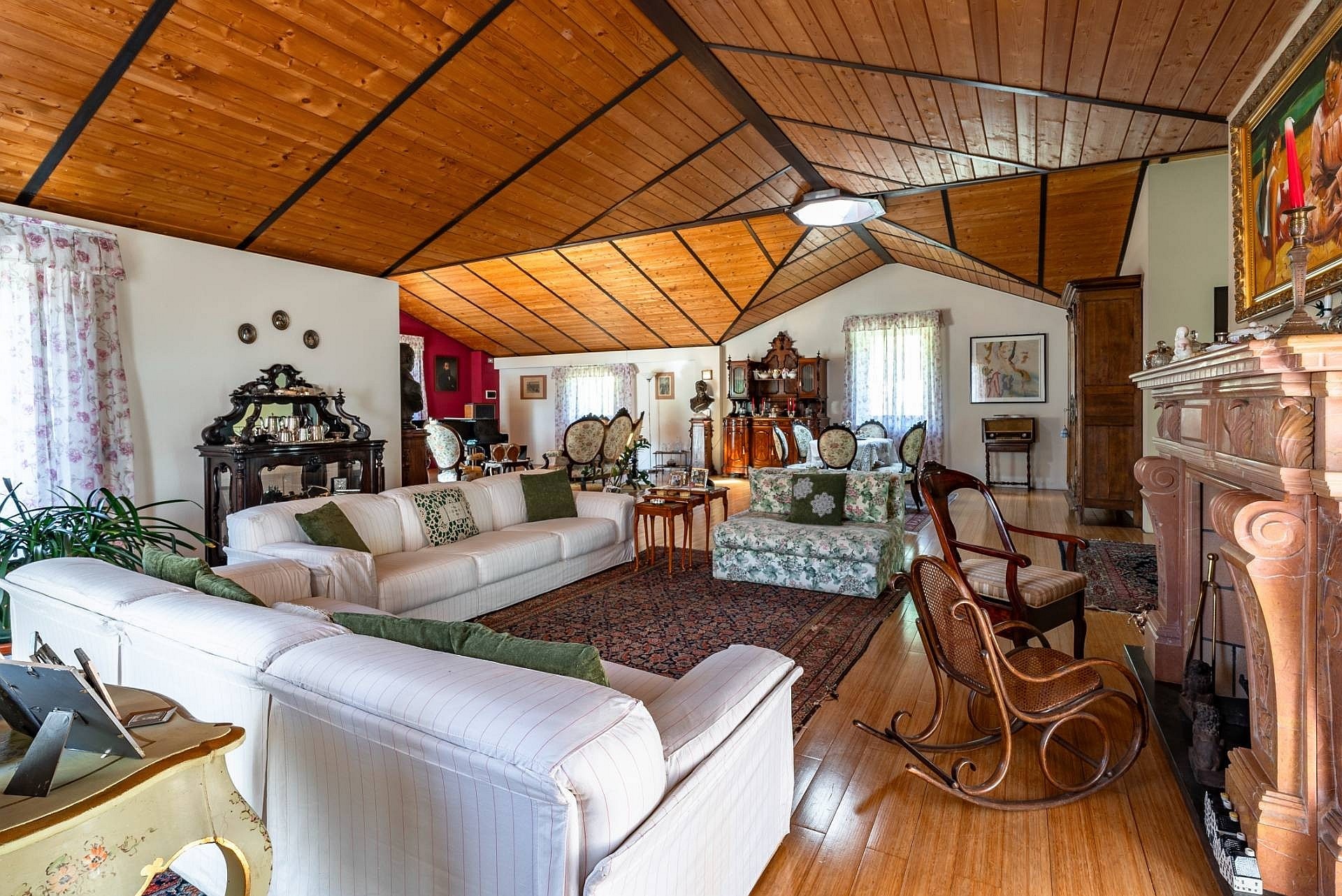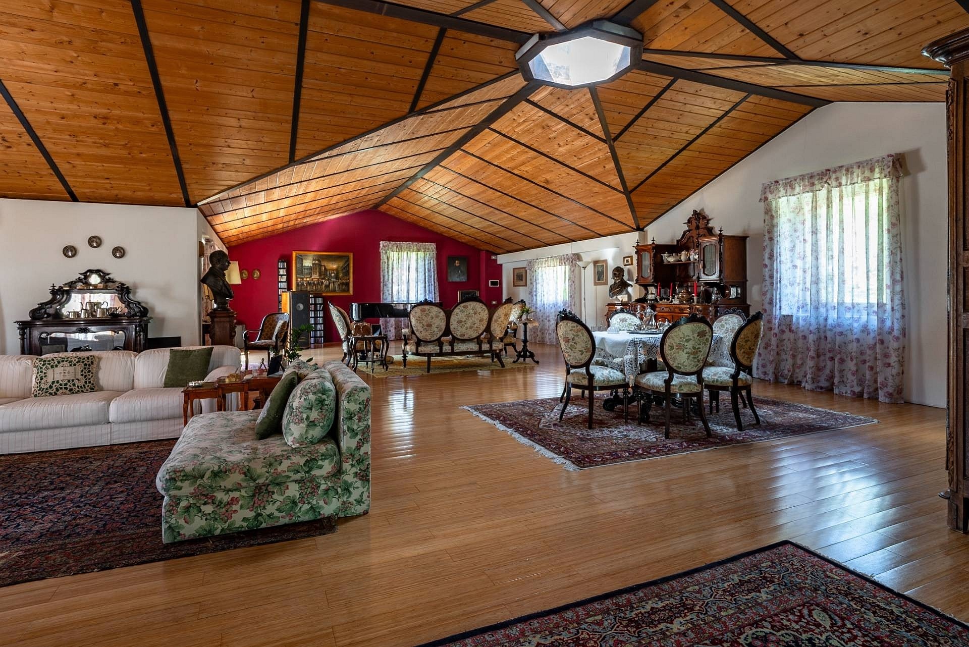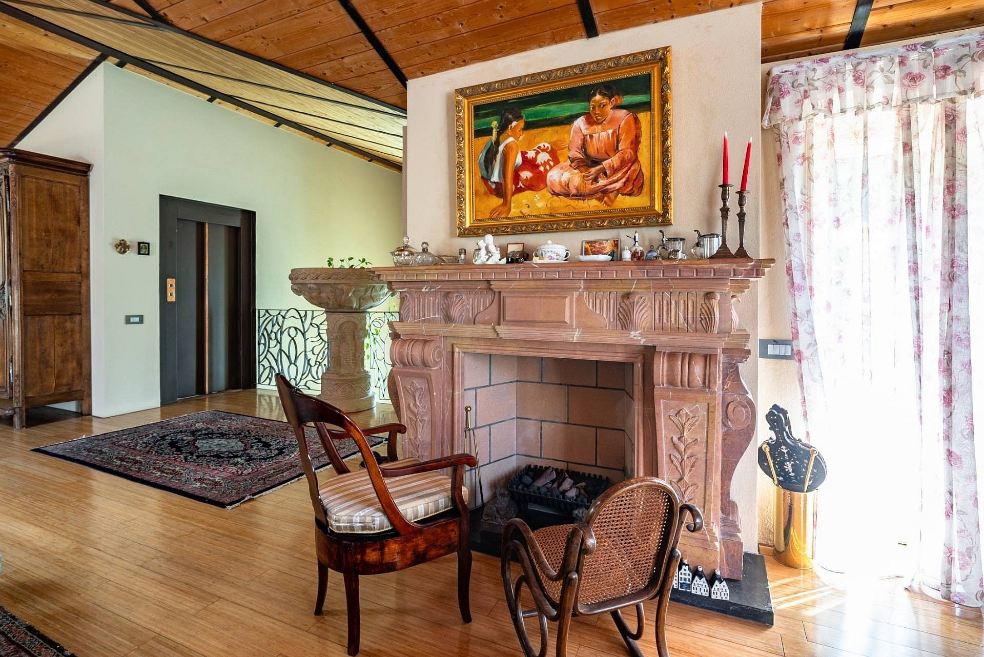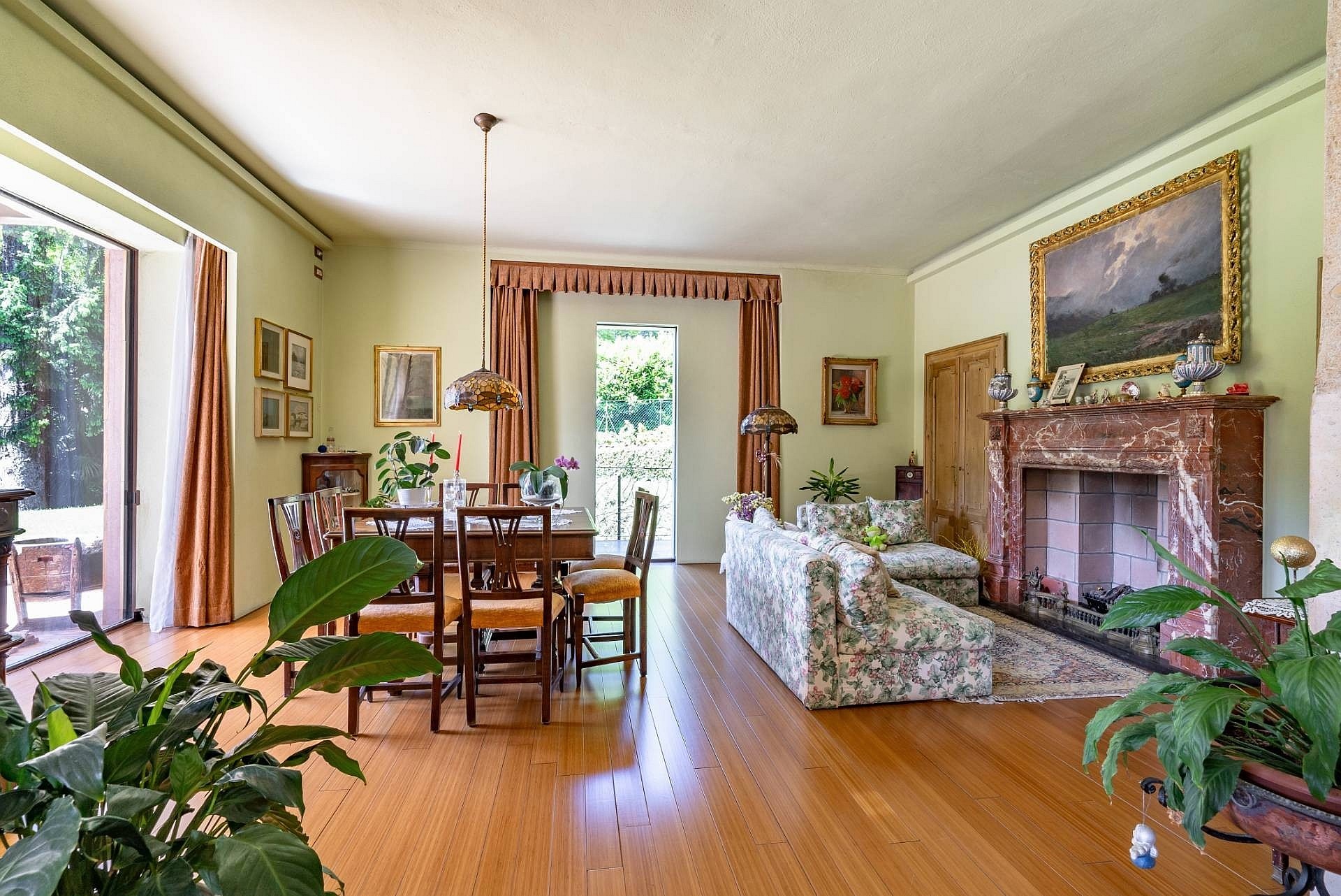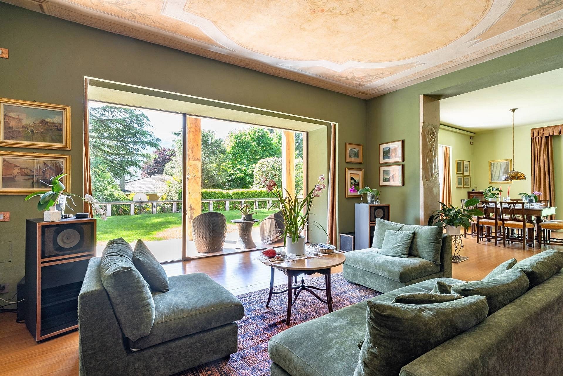 Wejście do głównej willi prowadzi przez duże, nowoczesne drzwi o dopracowanym wzornictwie. Na tym poziomie znajduje się przestronny salon z wysokimi sufitami, ozdobionymi freskami z początku XX wieku, odrestaurowanymi podczas prac remontowych, oraz dużymi oknami wychodzącymi na ogród. Na tej kondygnacji znajdują się również herbaciarnia, jadalnia z kominkiem, nowoczesna kuchnia z kominkiem oraz łazienka. Strefa dzienna połączona jest z częścią sypialnianą, poddaszem oraz piwnicą, do których prowadzą winda i nowoczesne schody o marmurowym wykończeniu z metalową konstrukcją i ręcznie wykonaną balustradą.