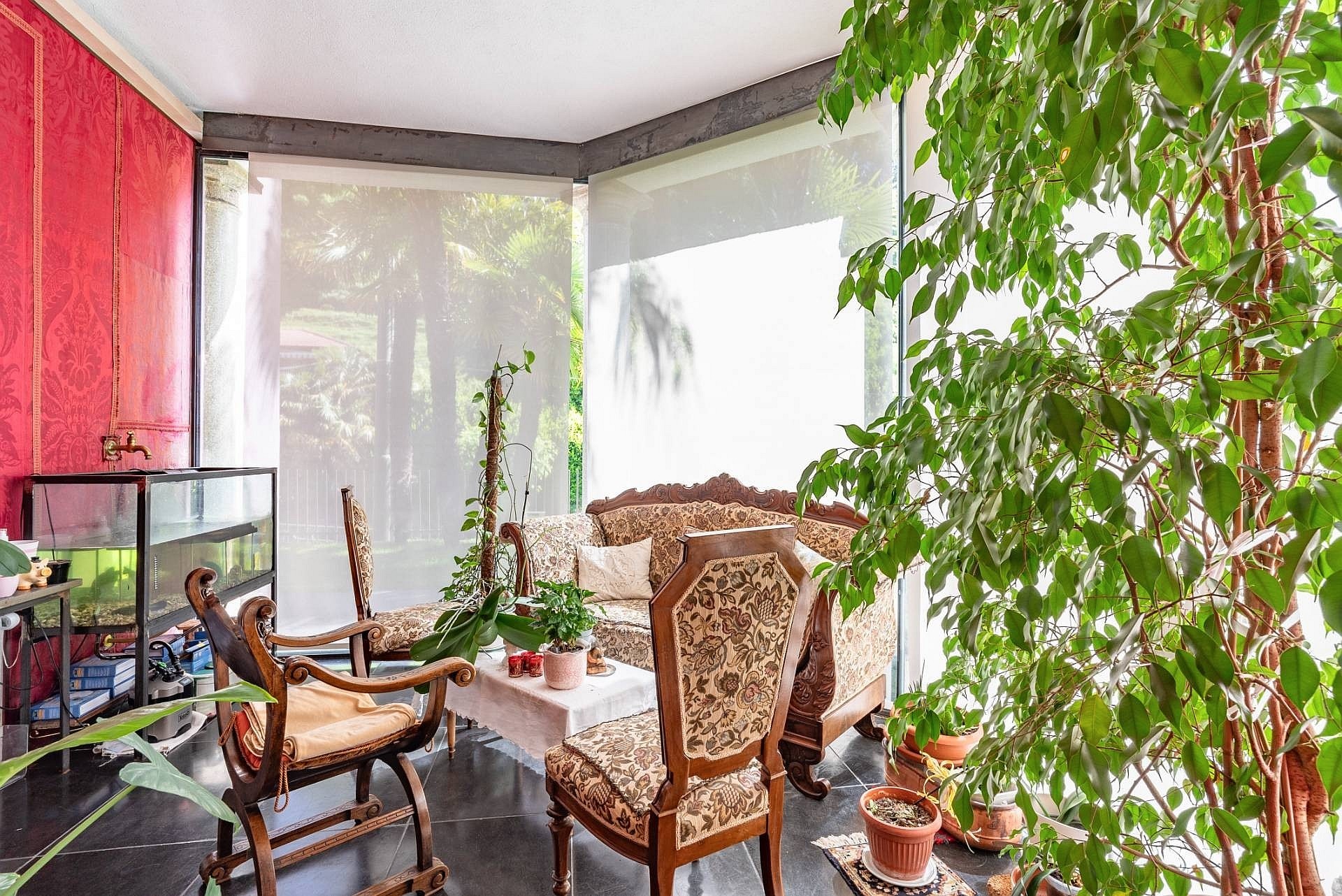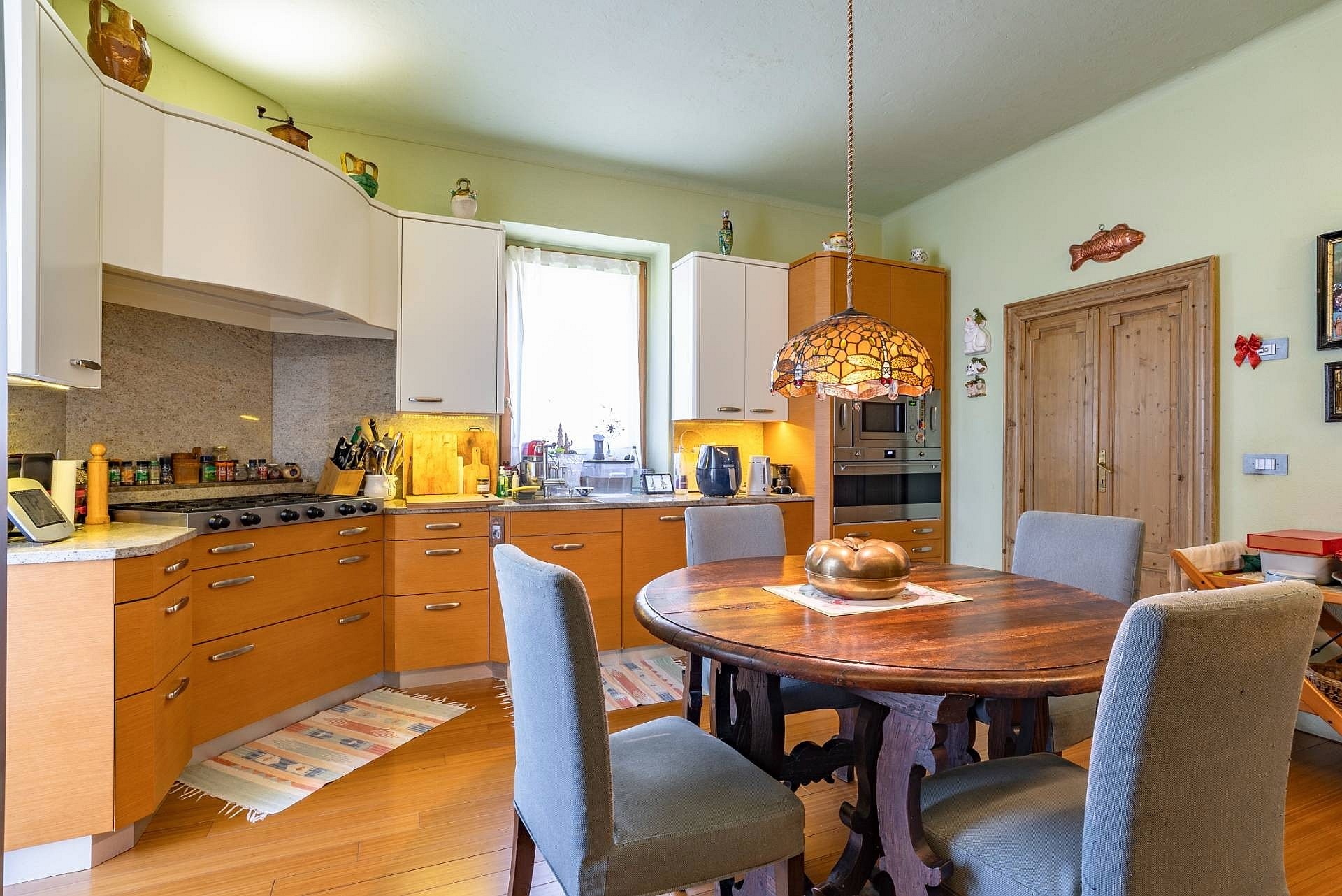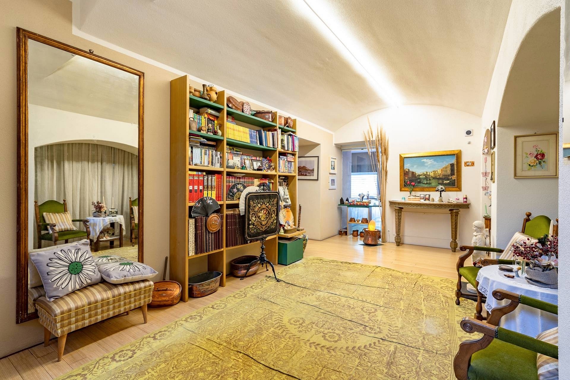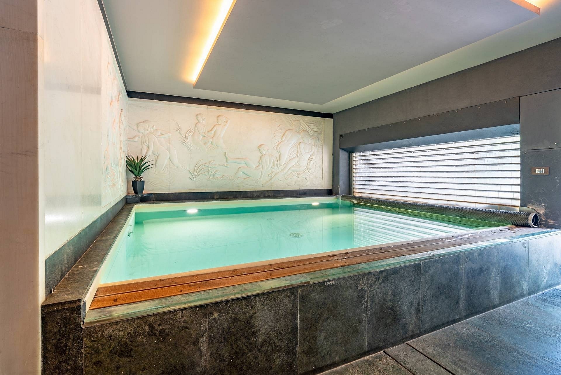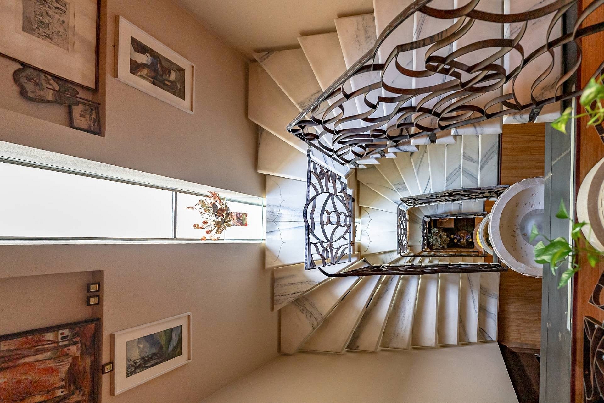 Wejście do głównej willi prowadzi przez duże, nowoczesne drzwi o dopracowanym wzornictwie. Na tym poziomie znajduje się przestronny salon z wysokimi sufitami, ozdobionymi freskami z początku XX wieku, odrestaurowanymi podczas prac remontowych, oraz dużymi oknami wychodzącymi na ogród. Na tej kondygnacji znajdują się również herbaciarnia, jadalnia z kominkiem, nowoczesna kuchnia z kominkiem oraz łazienka. Strefa dzienna połączona jest z częścią sypialnianą, poddaszem oraz piwnicą, do których prowadzą winda i nowoczesne schody o marmurowym wykończeniu z metalową konstrukcją i ręcznie wykonaną balustradą.