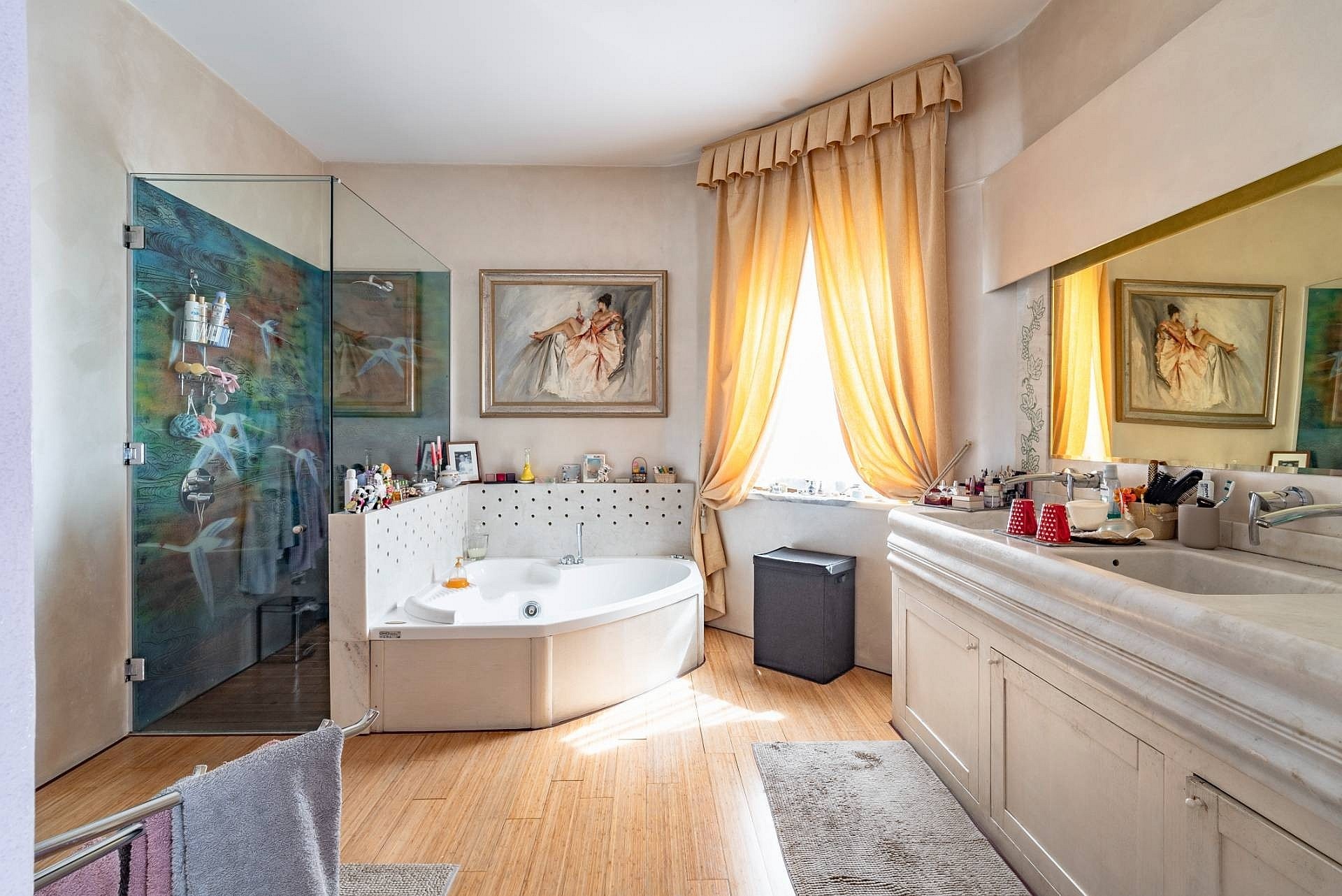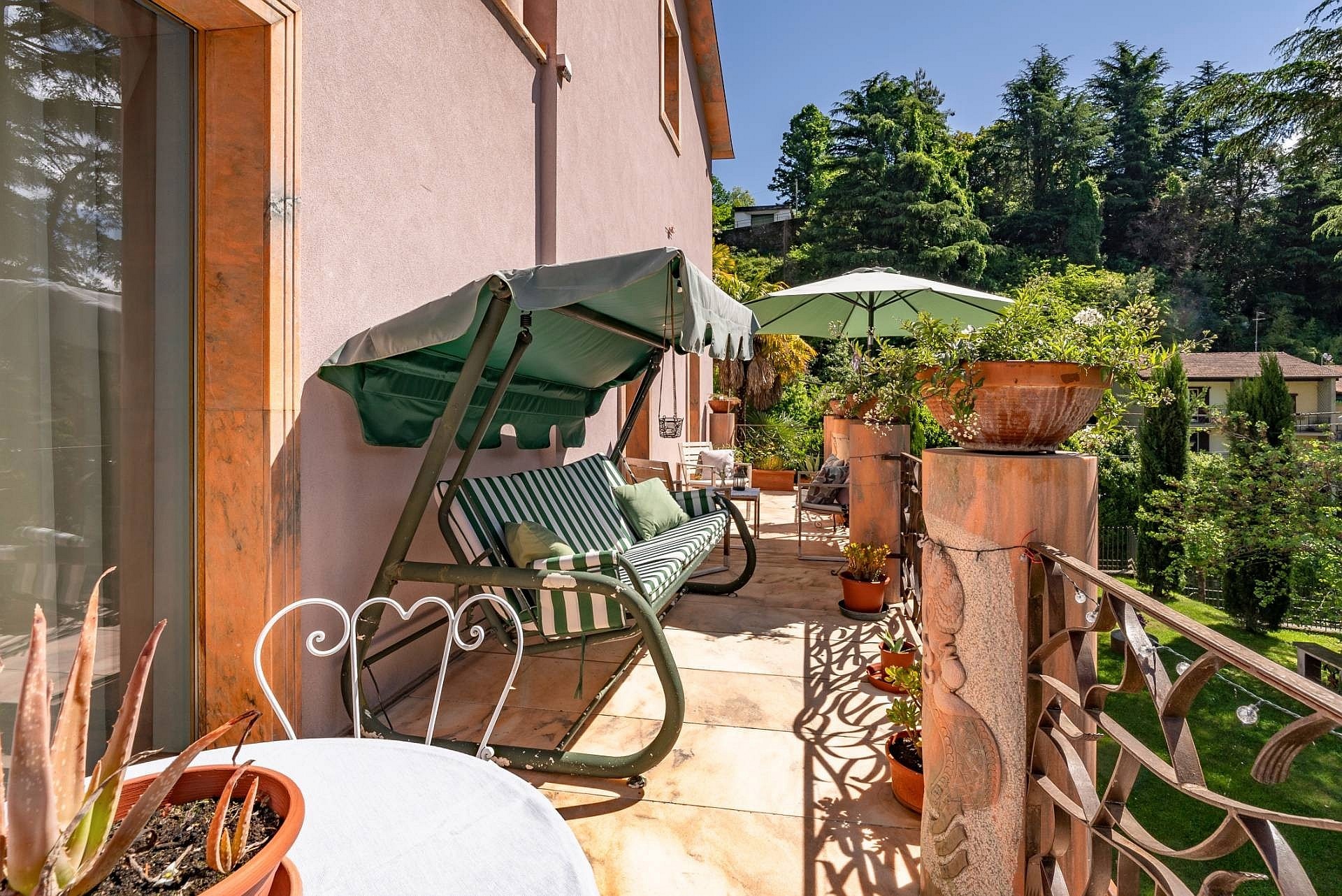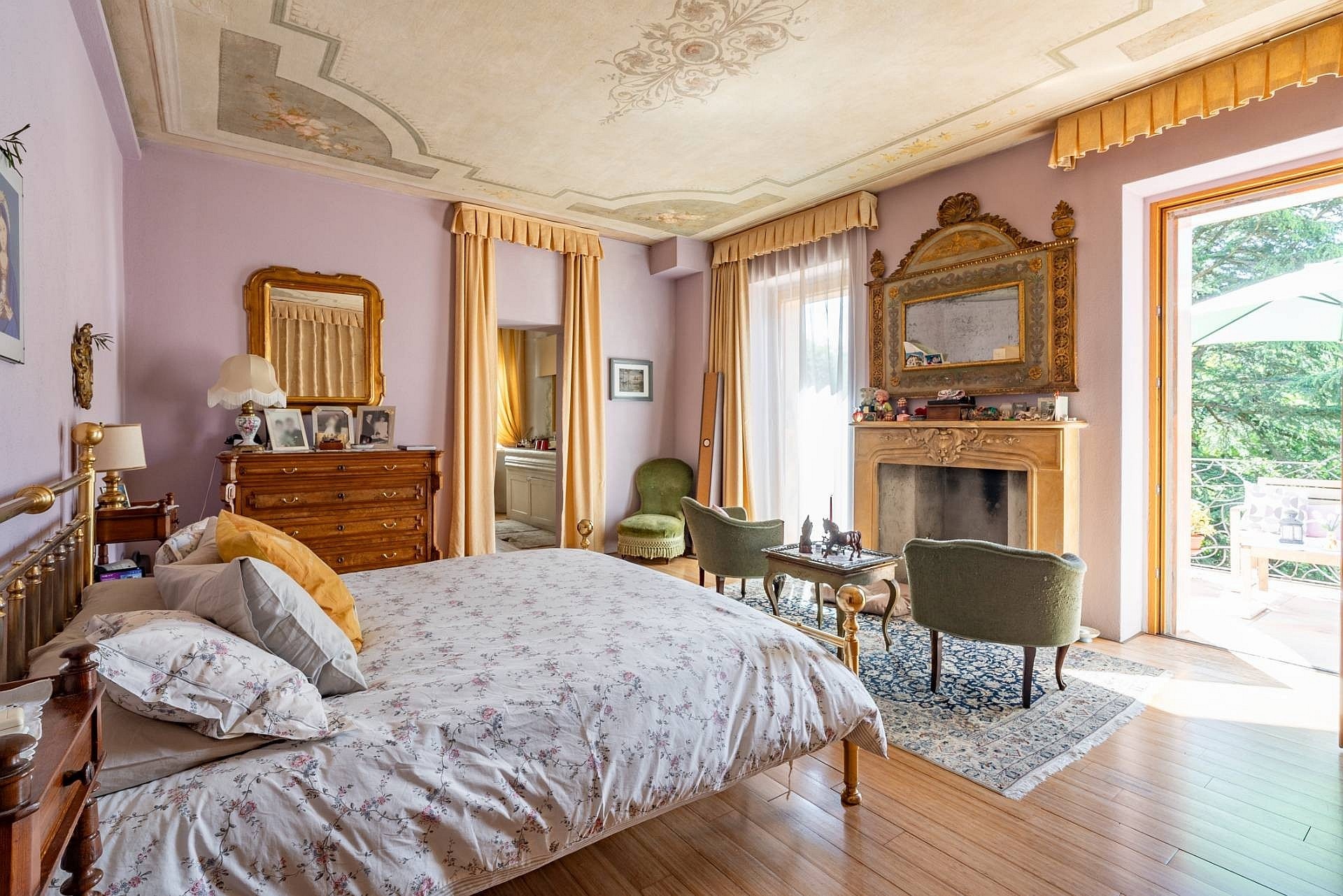 Apartament główny, ozdobiony freskami z początku XX wieku, posiada prywatną łazienkę z wanną z hydromasażem i prysznicem, garderobę oraz balkon z widokiem na ogród i jezioro. Sypialnie gościnne wyposażone są w łazienki z prysznicem, a jedna z nich posiada również własną łazienkę. Poddasze wyróżnia się wysokim sufitem z odsłoniętymi belkami stropowymi oraz przestronnym salonem z kominkiem, dwoma tarasami i prywatną łazienką. Taras dachowy oferuje widok na jezioro i może być wykorzystywany jako miejsce wypoczynku.