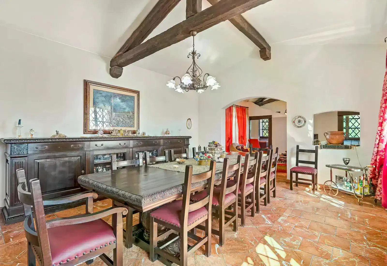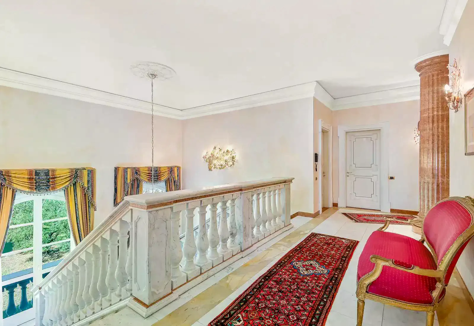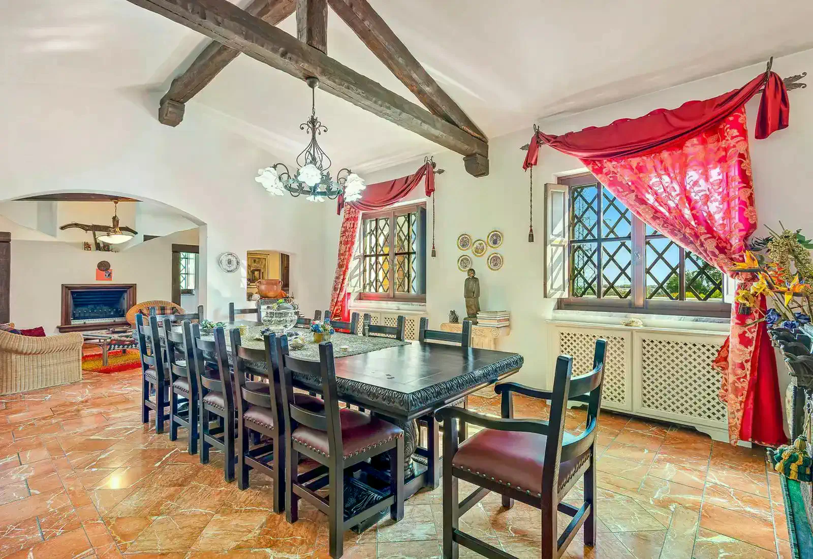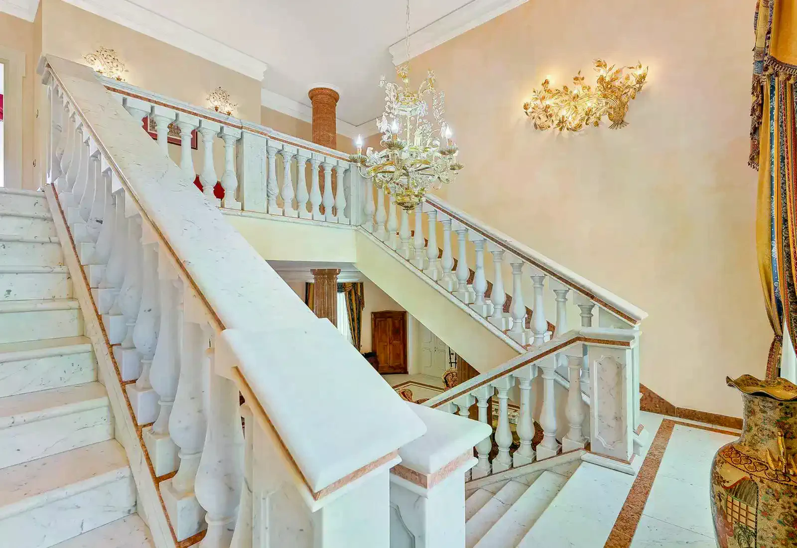 Na parterze znajduje się przestronny salon z oryginalnym kominkiem, jasna jadalnia oraz dwie w pełni wyposażone kuchnie – jedna reprezentacyjna do spotkań towarzyskich, druga techniczna dla personelu lub prywatnego szefa kuchni. Na piętrze znajduje się sześć dużych sypialni i cztery łazienki wykończone marmurem i drewnem na wymiar.