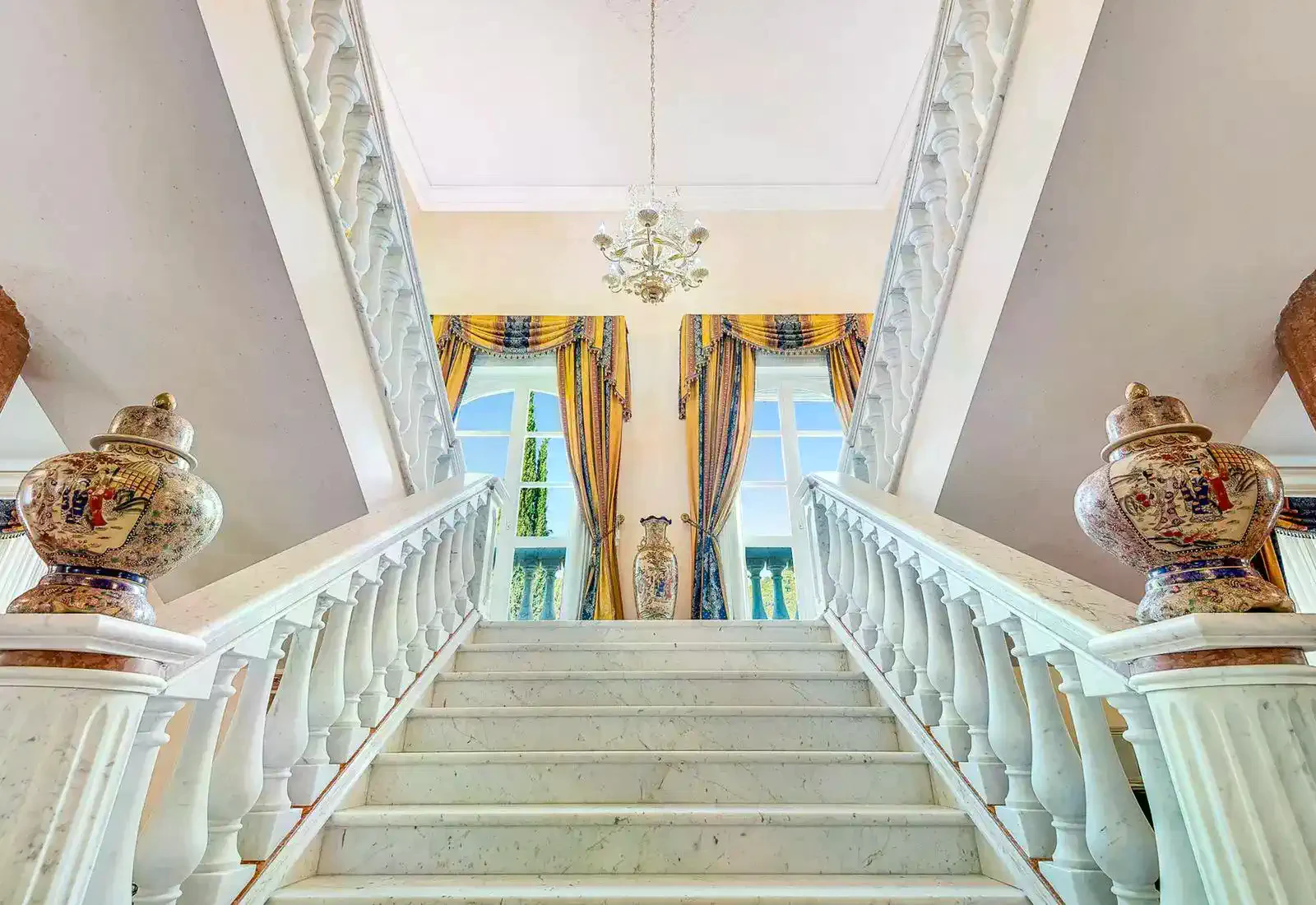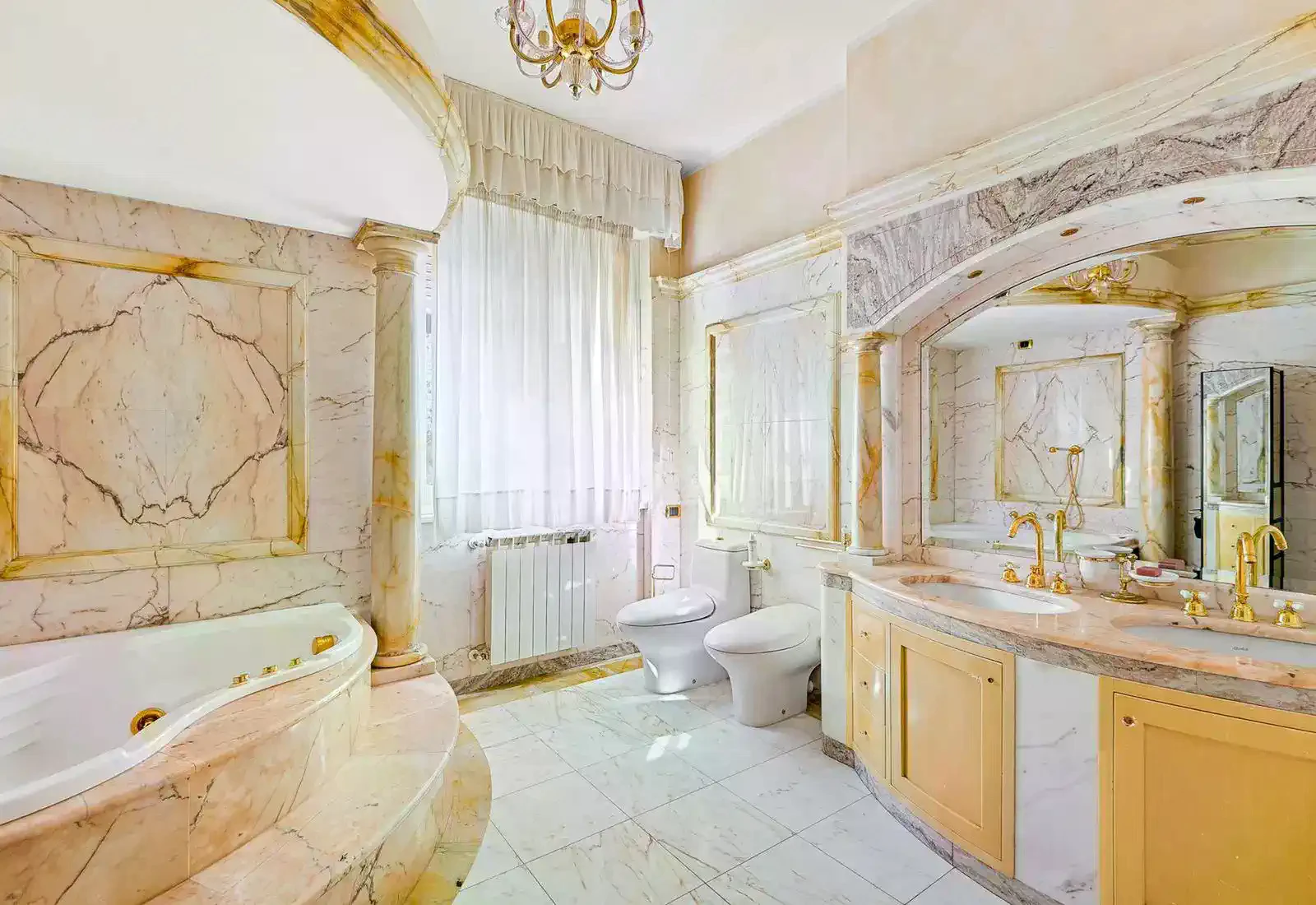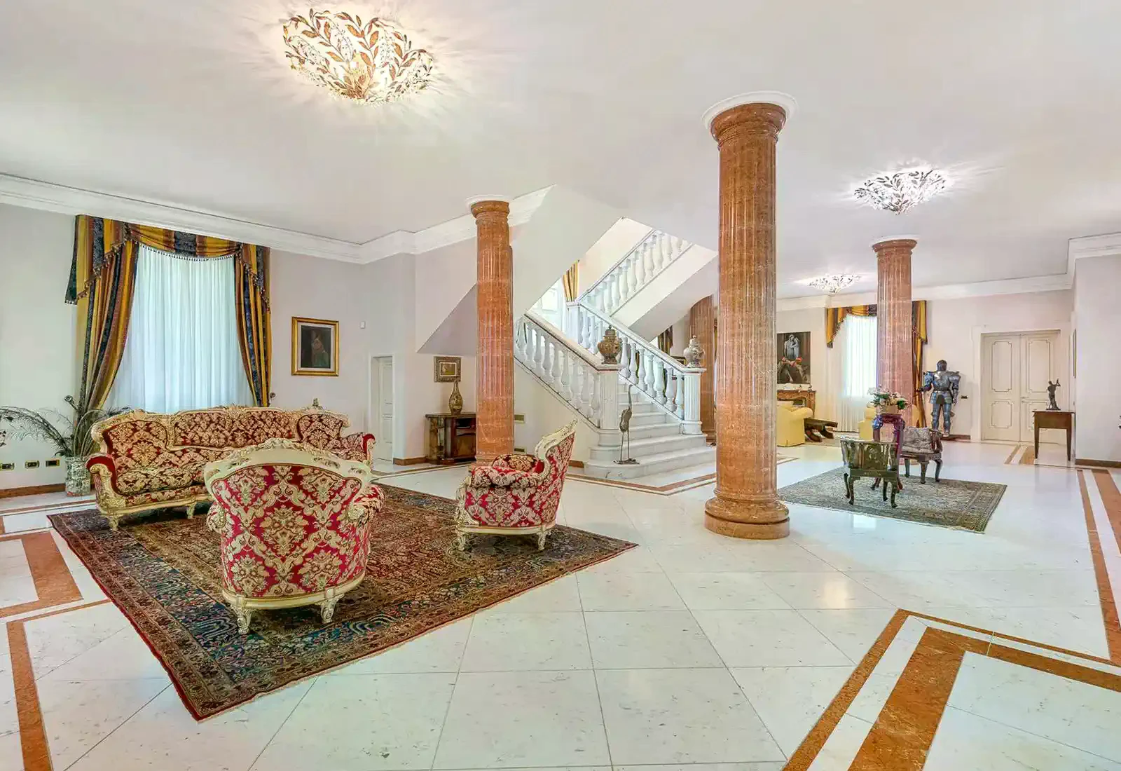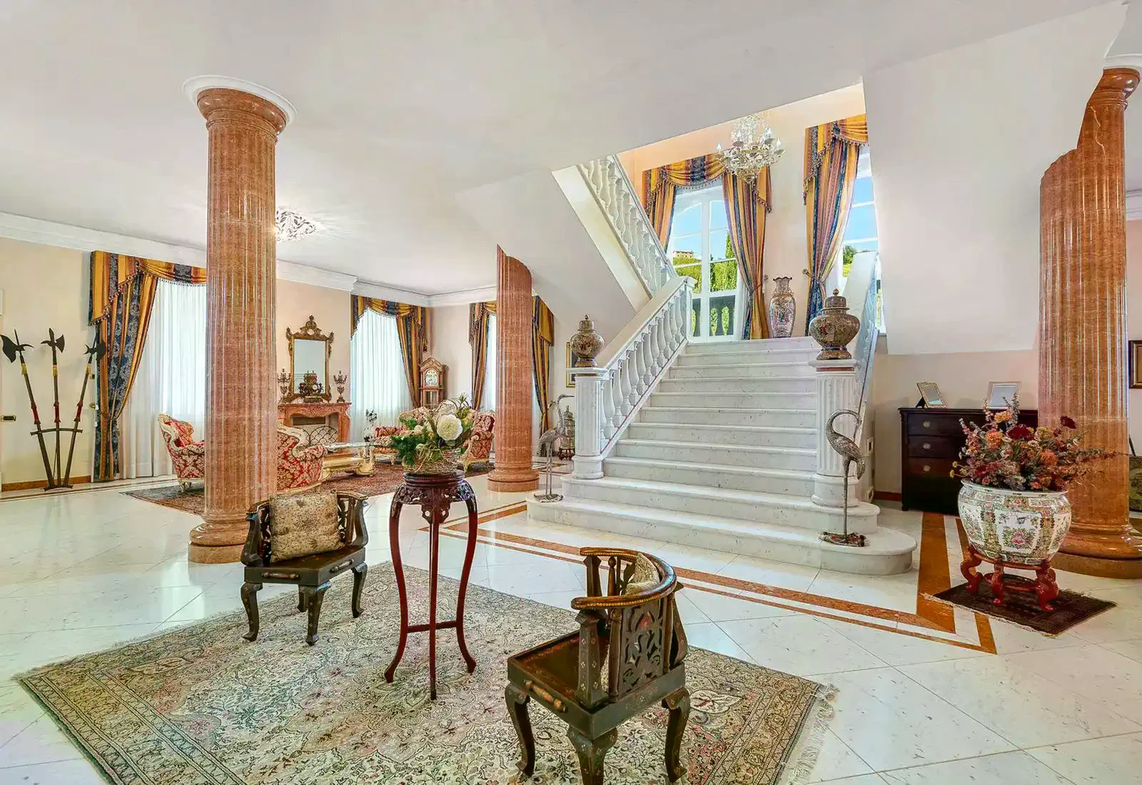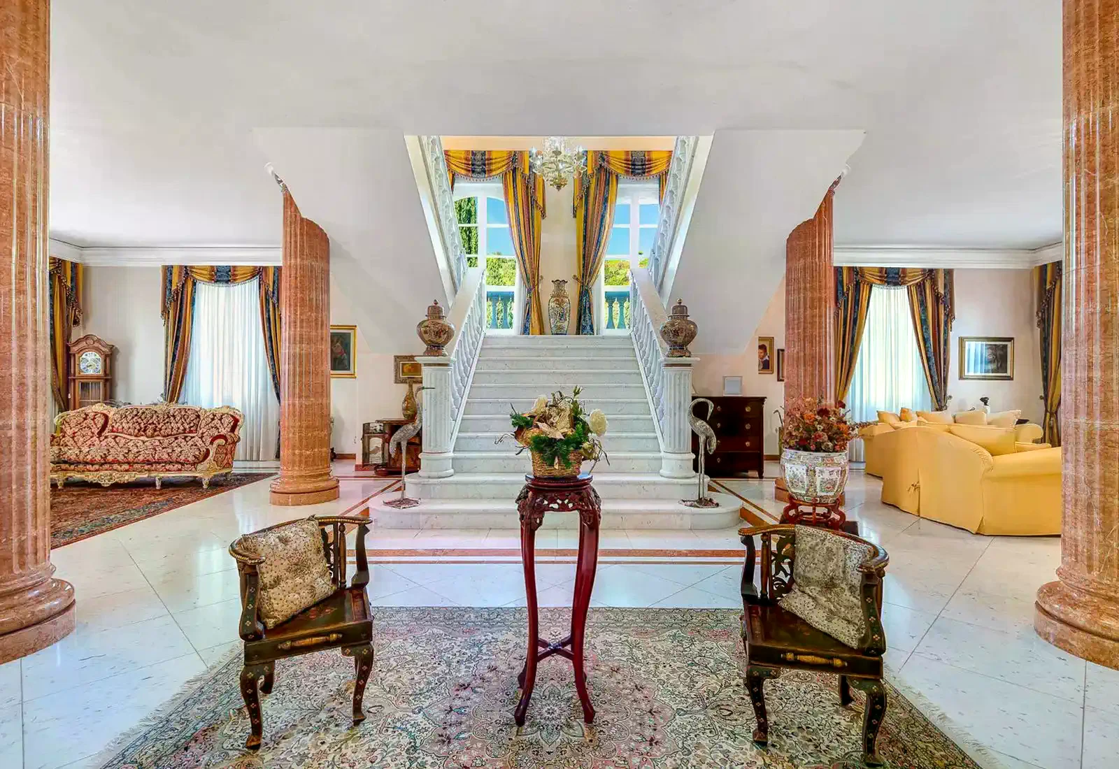Na parterze znajduje się przestronny salon z oryginalnym kominkiem, jasna jadalnia oraz dwie w pełni wyposażone kuchnie – jedna reprezentacyjna do spotkań towarzyskich, druga techniczna dla personelu lub prywatnego szefa kuchni. Na piętrze znajduje się sześć dużych sypialni i cztery łazienki wykończone marmurem i drewnem na wymiar.