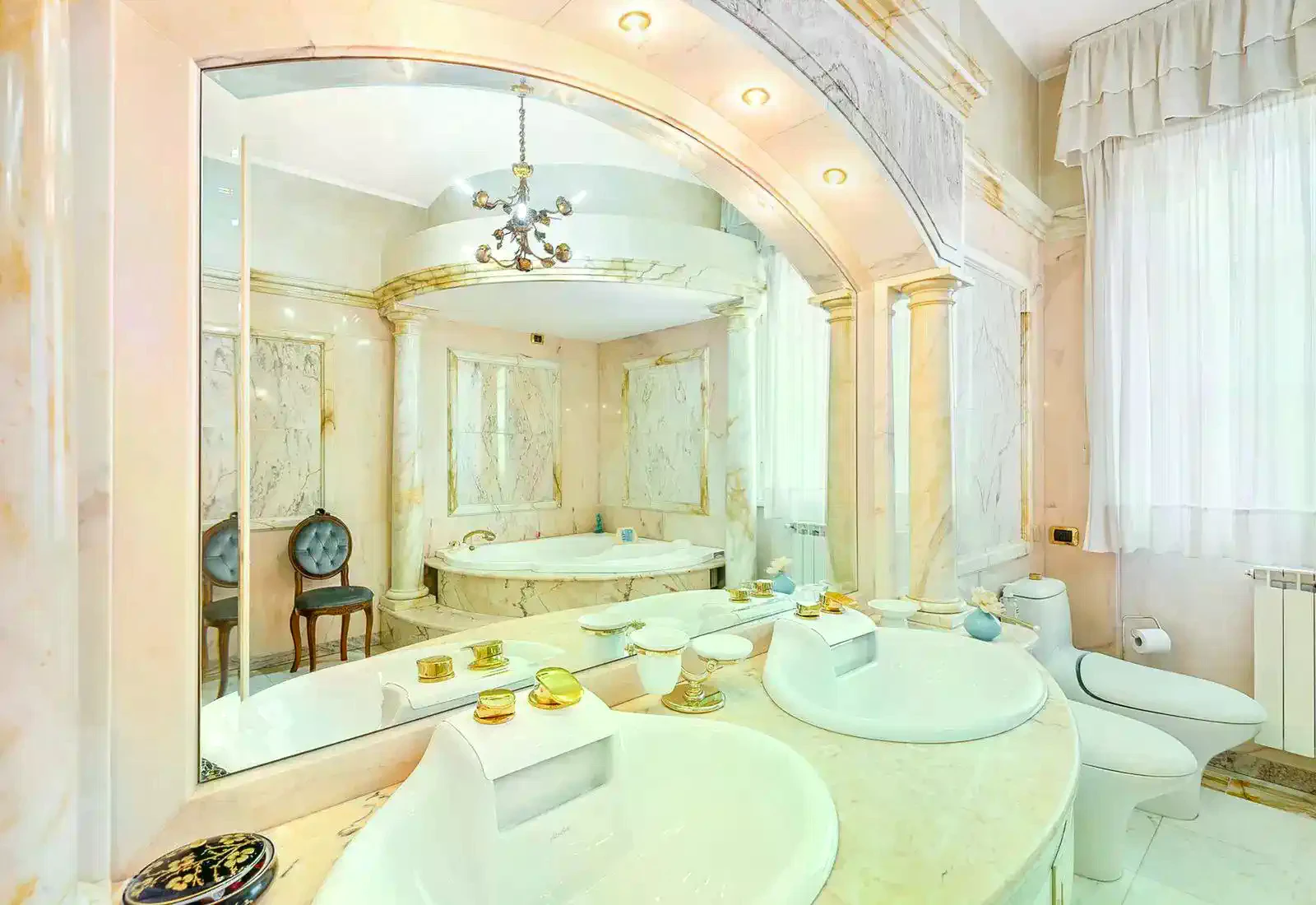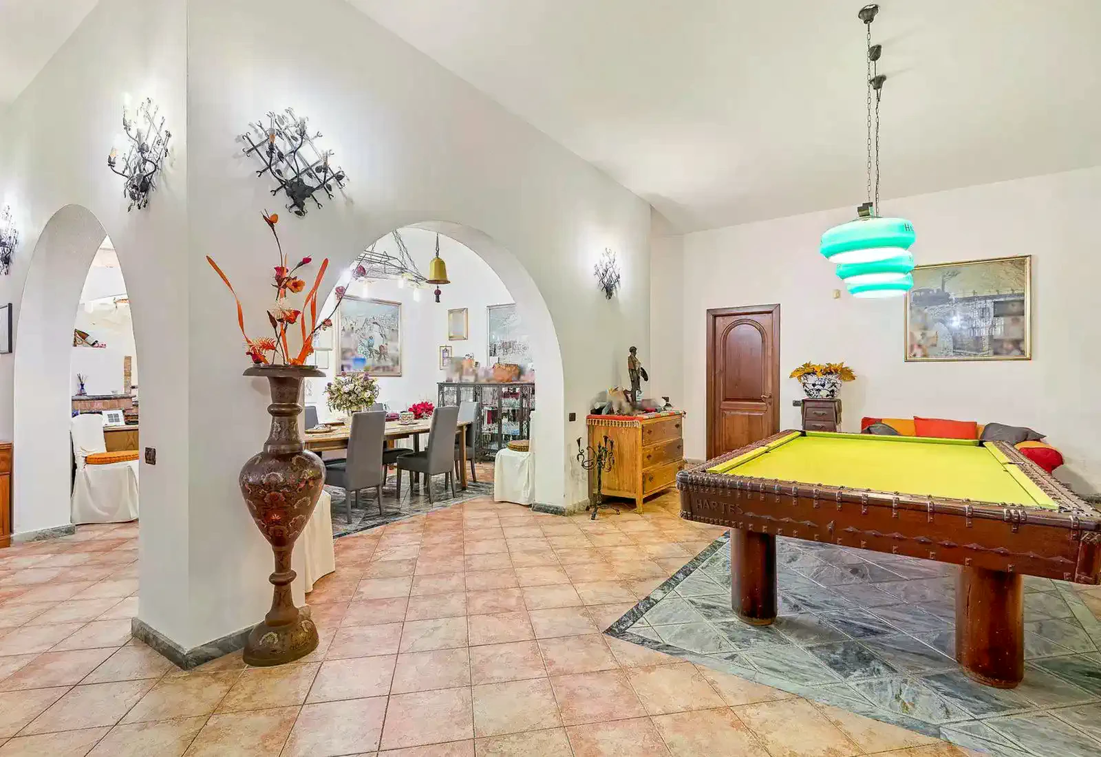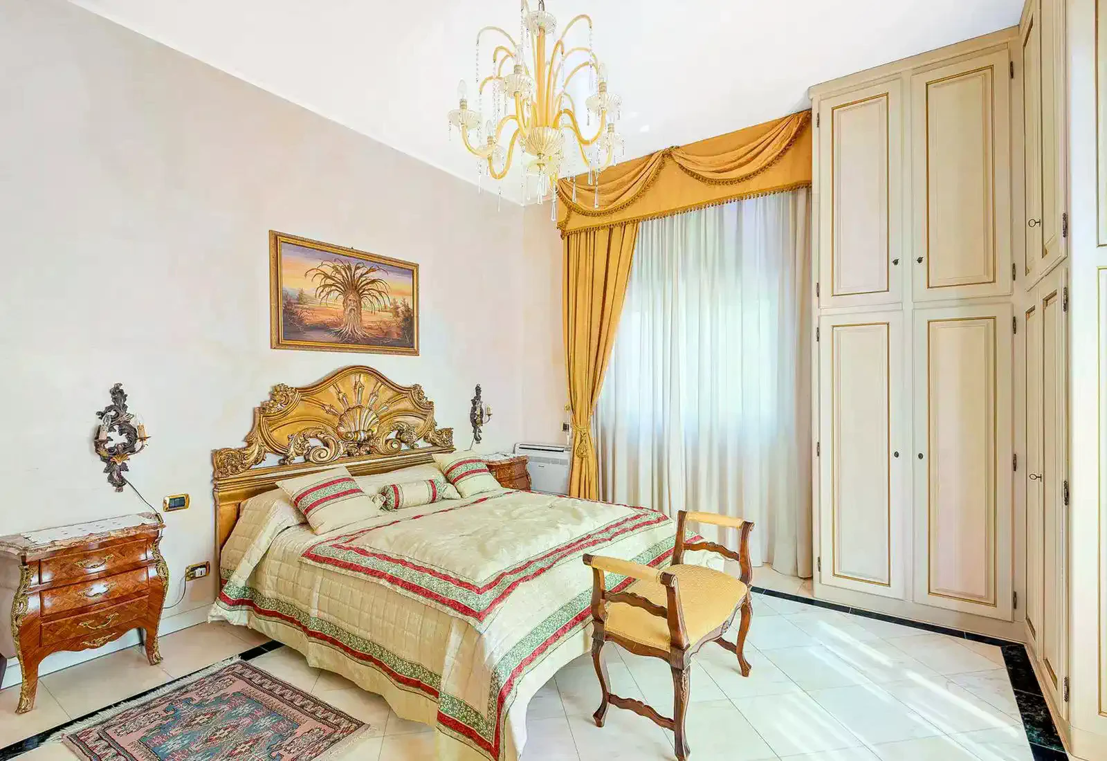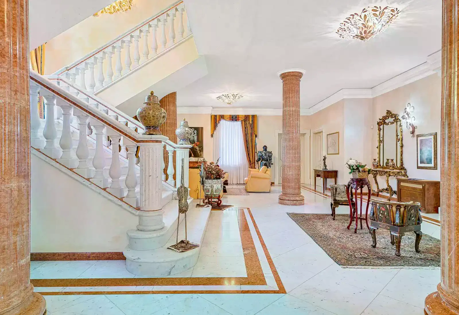 Na parterze znajduje się przestronny salon z oryginalnym kominkiem, jasna jadalnia oraz dwie w pełni wyposażone kuchnie – jedna reprezentacyjna do spotkań towarzyskich, druga techniczna dla personelu lub prywatnego szefa kuchni. Na piętrze znajduje się sześć dużych sypialni i cztery łazienki wykończone marmurem i drewnem na wymiar.