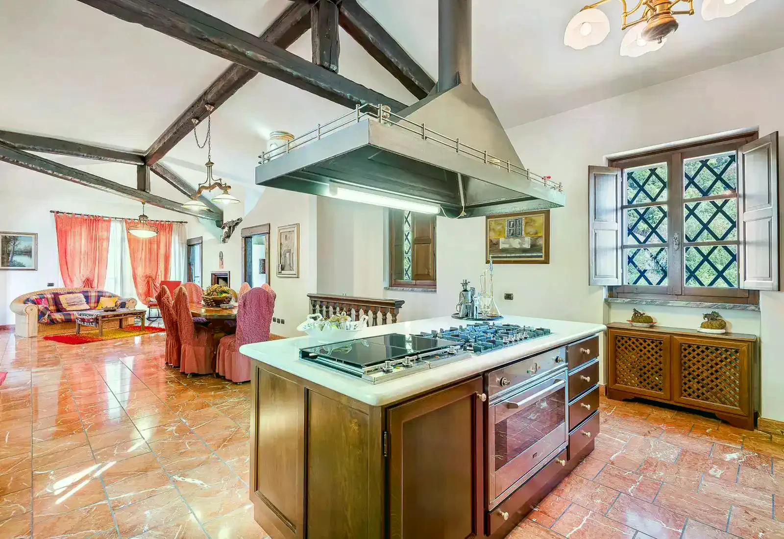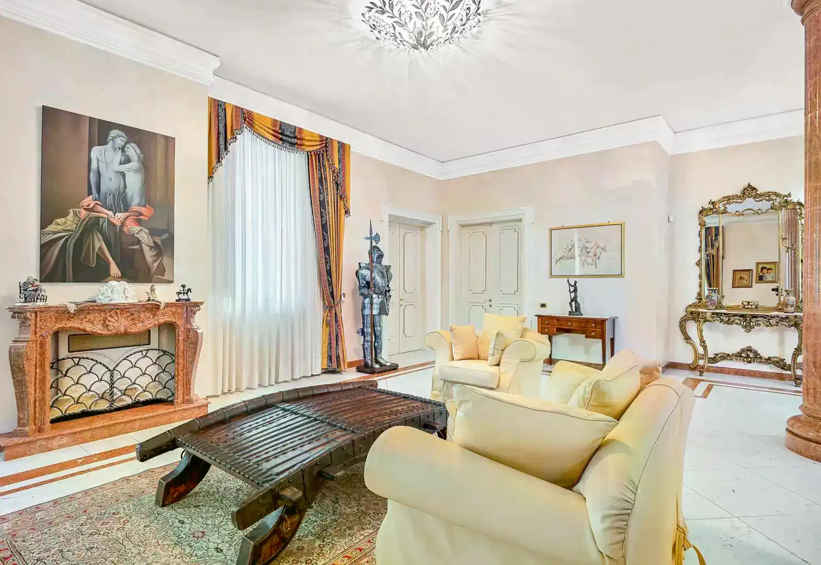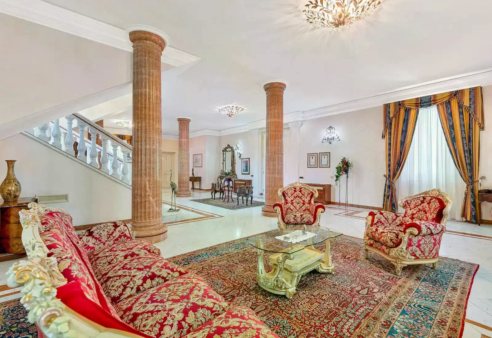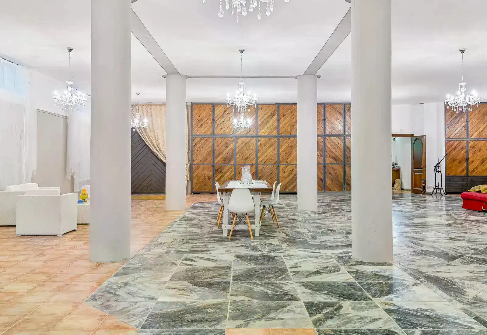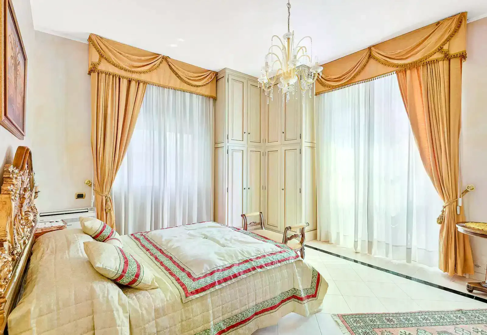 Na parterze znajduje się przestronny salon z oryginalnym kominkiem, jasna jadalnia oraz dwie w pełni wyposażone kuchnie – jedna reprezentacyjna do spotkań towarzyskich, druga techniczna dla personelu lub prywatnego szefa kuchni. Na piętrze znajduje się sześć dużych sypialni i cztery łazienki wykończone marmurem i drewnem na wymiar.