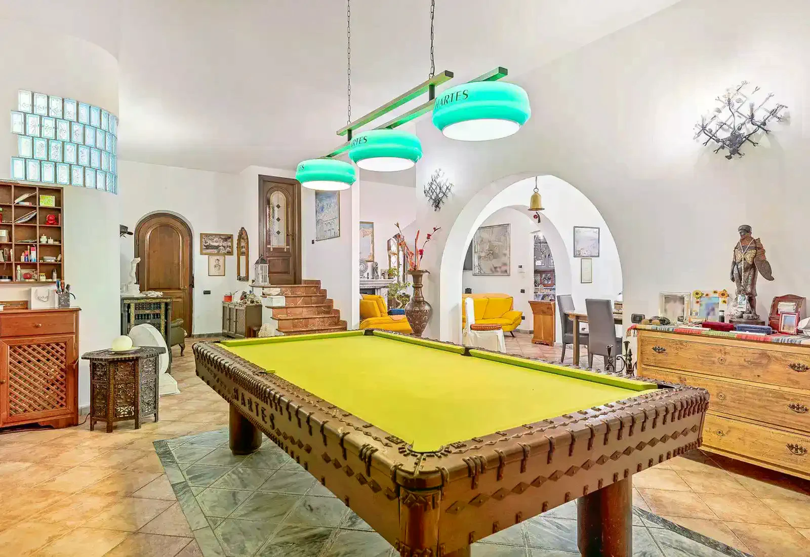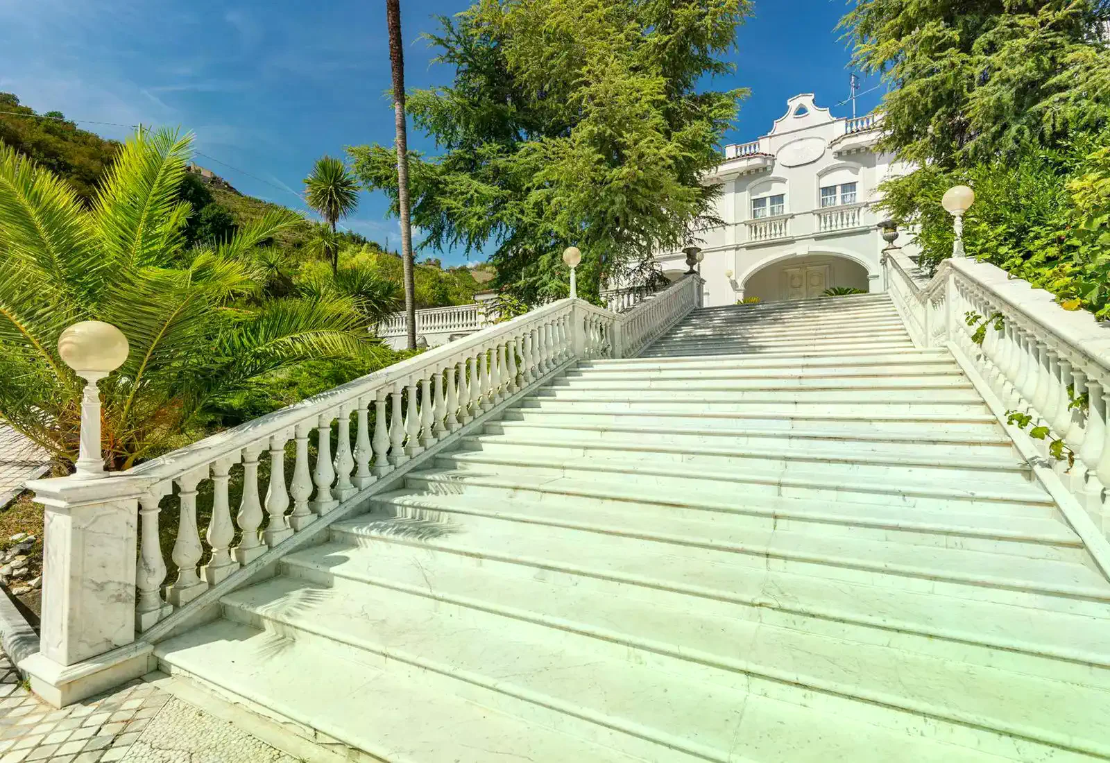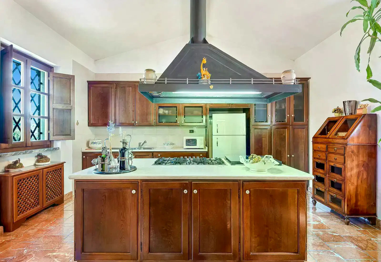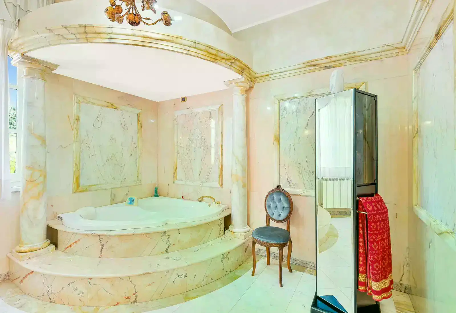 Na parterze znajduje się przestronny salon z oryginalnym kominkiem, jasna jadalnia oraz dwie w pełni wyposażone kuchnie – jedna reprezentacyjna do spotkań towarzyskich, druga techniczna dla personelu lub prywatnego szefa kuchni. Na piętrze znajduje się sześć dużych sypialni i cztery łazienki wykończone marmurem i drewnem na wymiar.