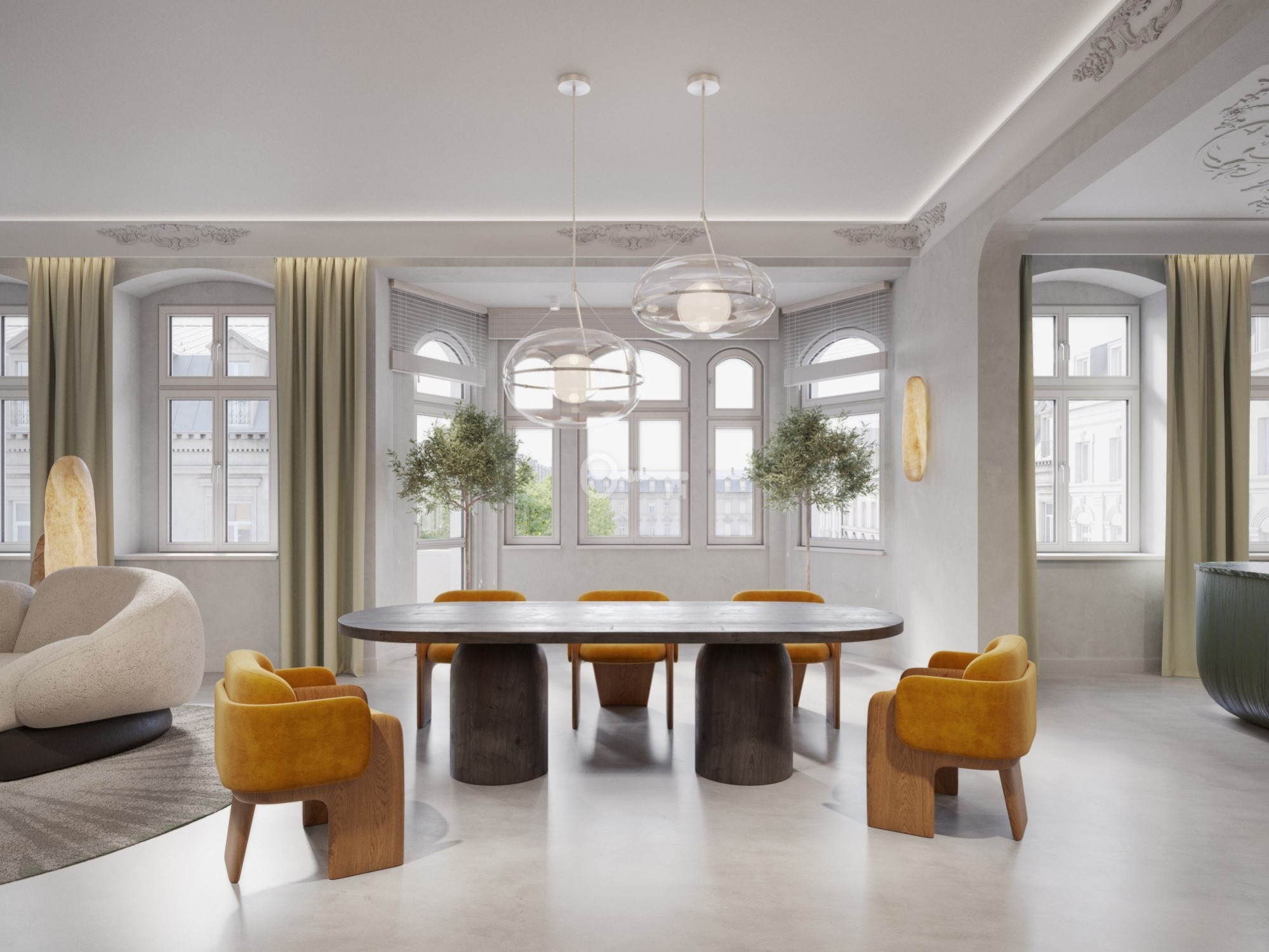 Przywracając pierwotny blask budynku, zadbano o każdy detal — od starannie odtworzonej fasady, przez zdobione gzymsy i pilastry, po stylowe klatki schodowe z zachowanymi, oryginalnymi elementami. Elewacja budynku, wzorowana na projekcie architekta Georga Rzechulki, harmonijnie łączy klasyczną elegancję z delikatną, nowoczesną kolorystyką, której wybór został również potwierdzony ekspertyzą feng shui.