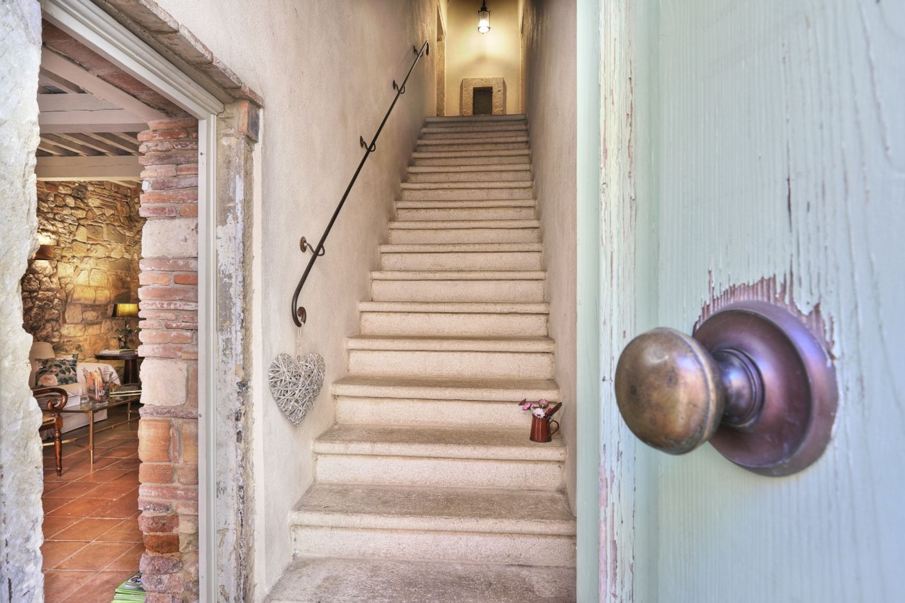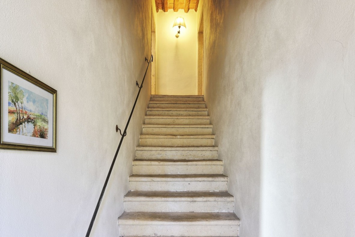 Stare kamienne schody prowadzą na piętro, oferujące przestronne i pełne światła pomieszczenia: