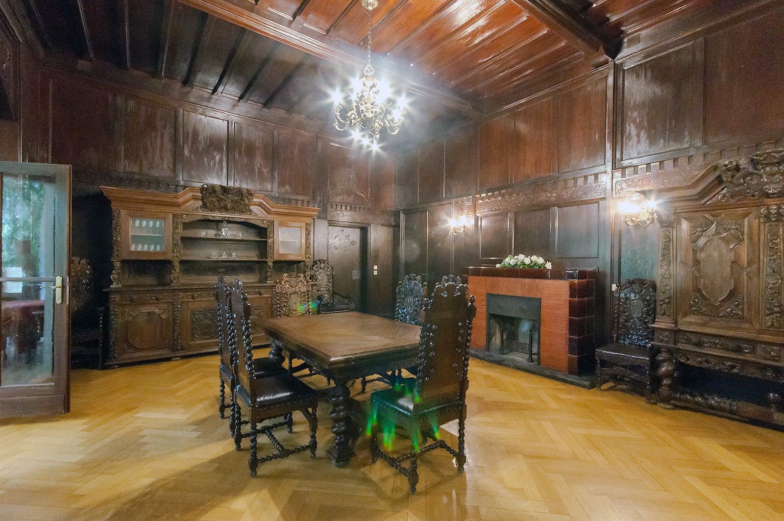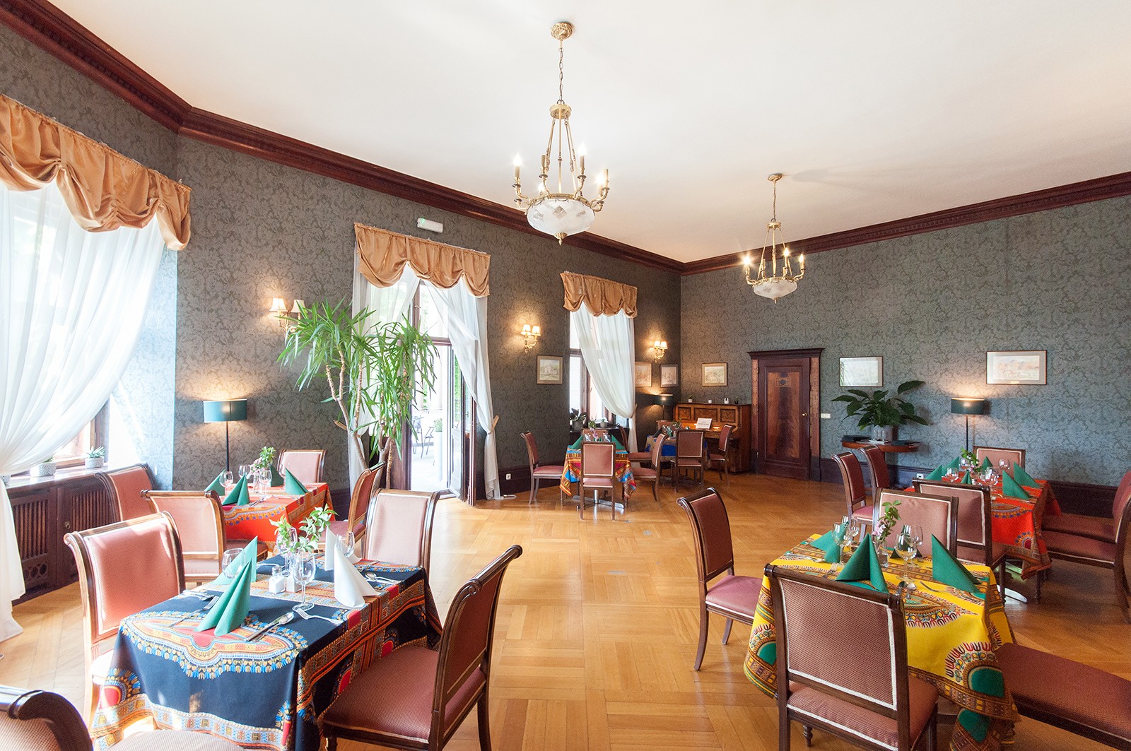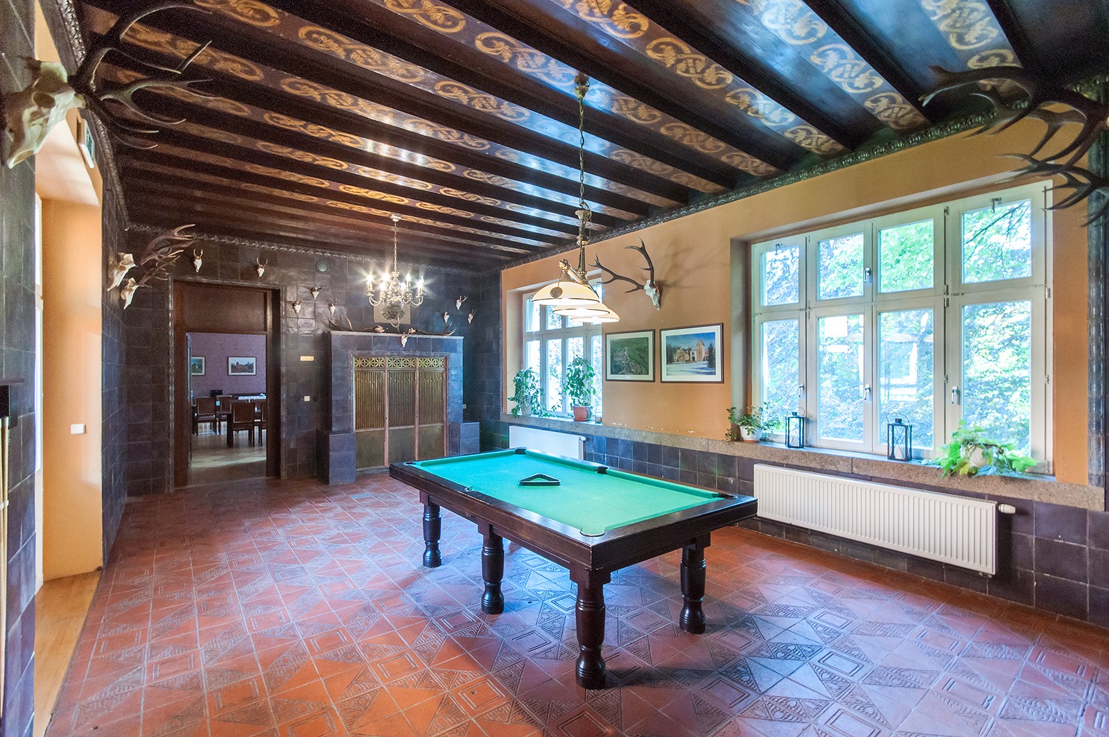 - Salę Myśliwską z drewnianym polichromowanym stropem i ciemnoniebieskimi kaflami na ścianach.