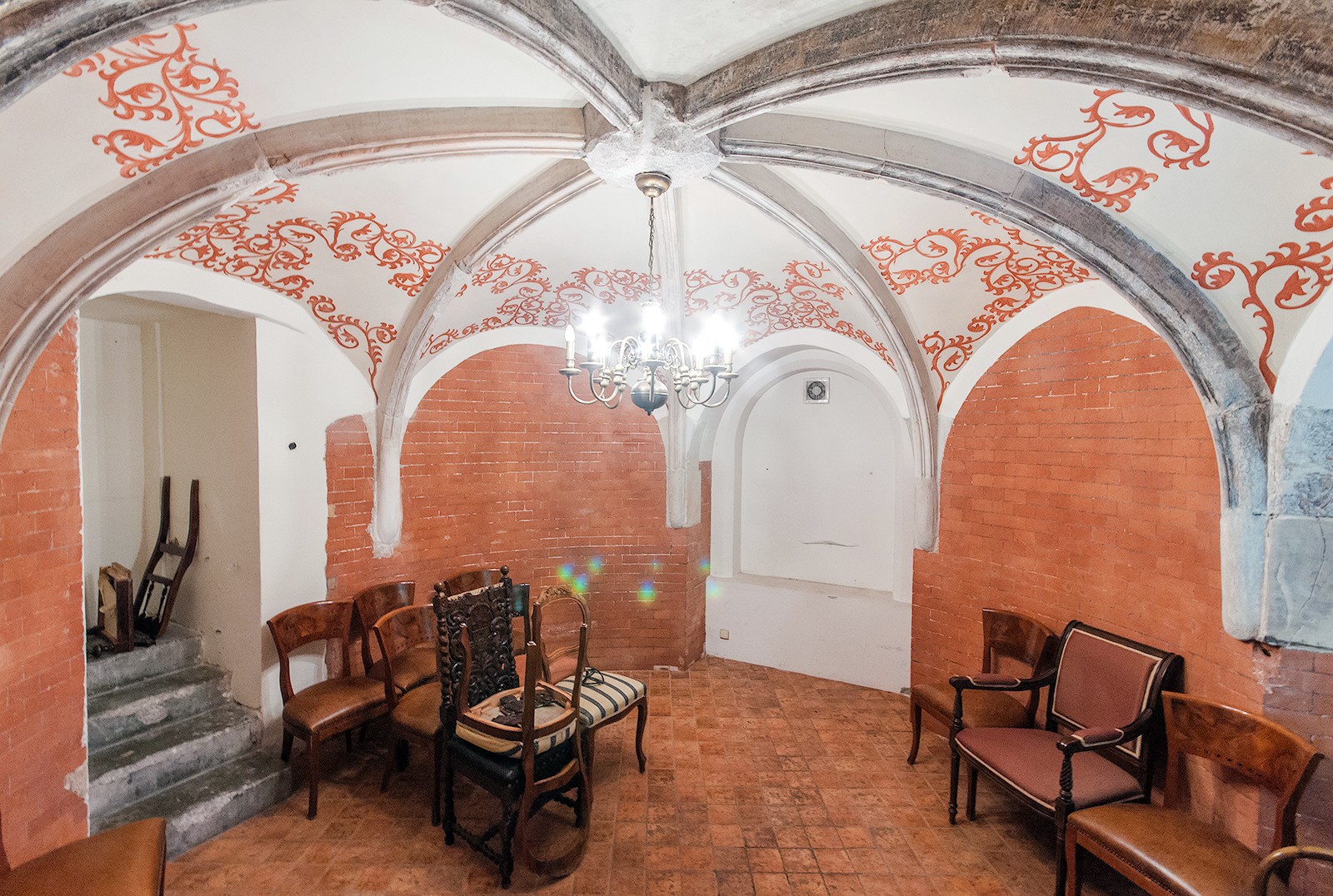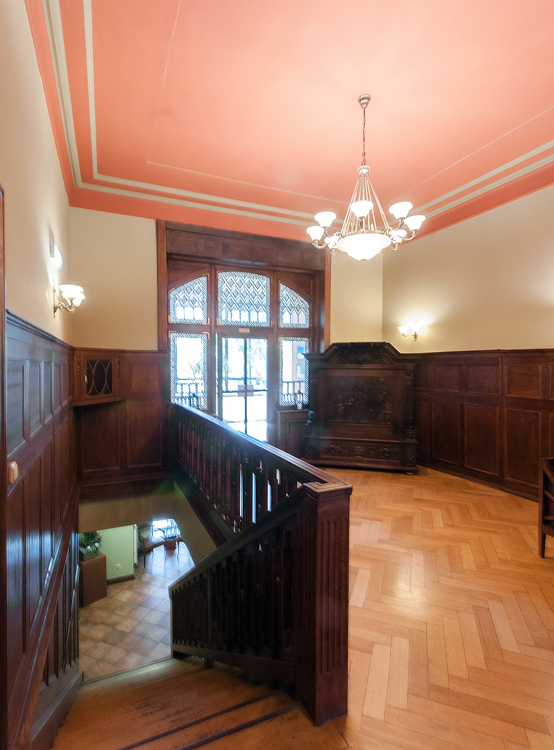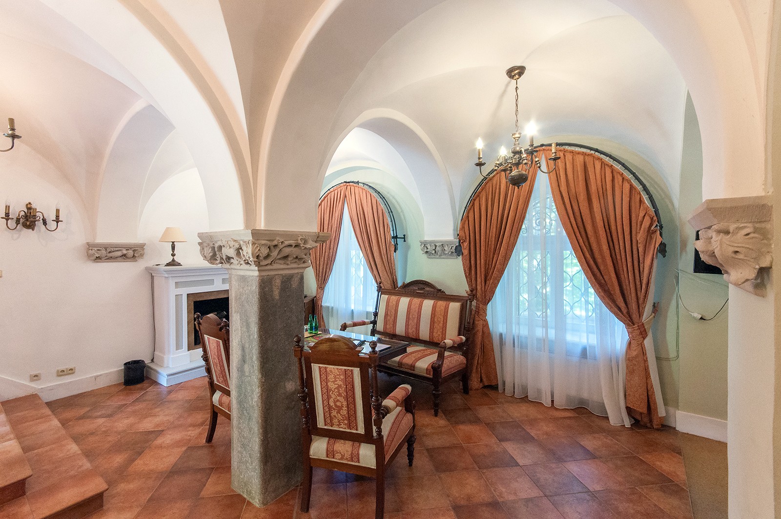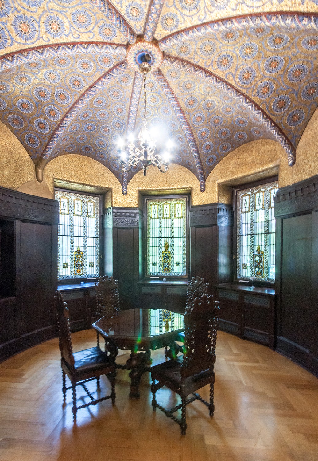 - Salę pod kopułą w wieży wschodniej z geometryczną polichromią i witrażami z ciepłymi, miodowymi szybami, które tworzą przytulny klimat, kontrastujący z Salą Myśliwską.