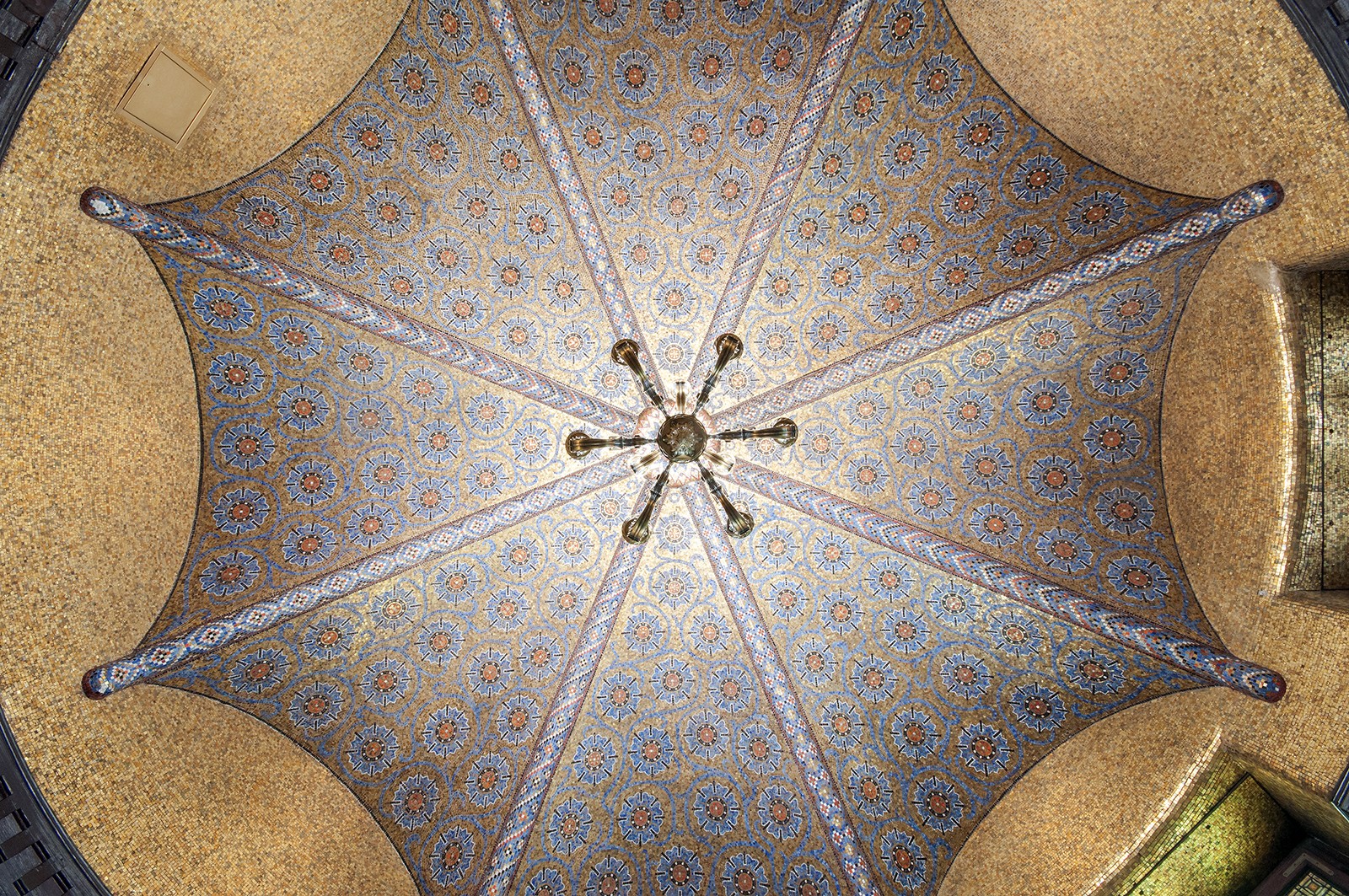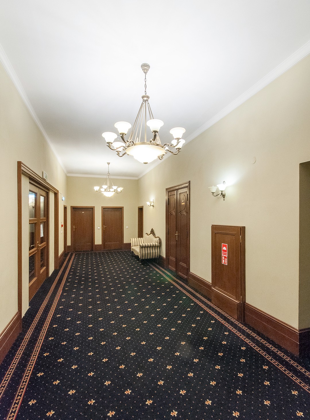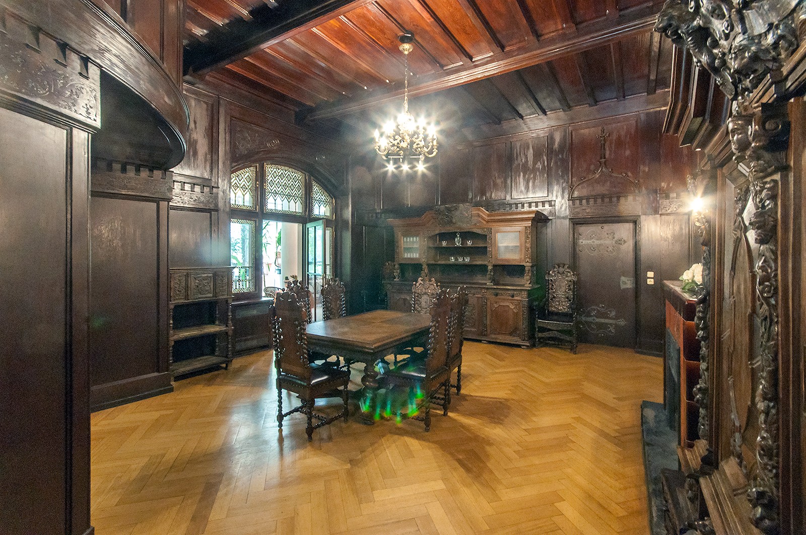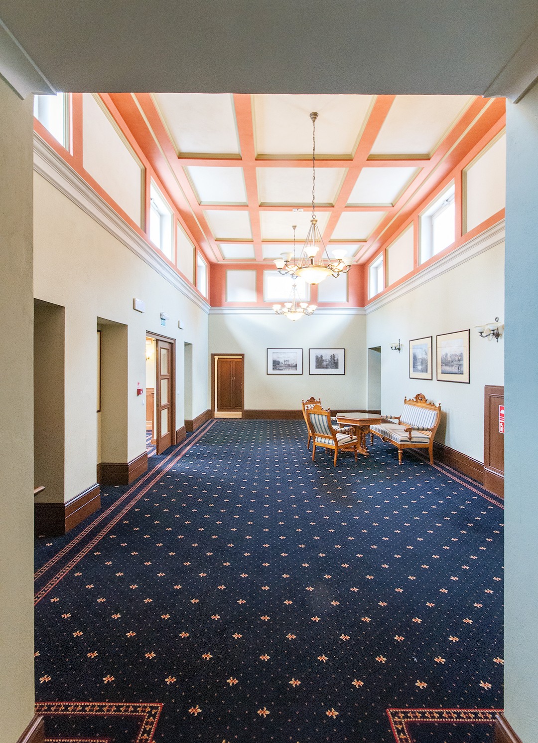 - Salę pod kopułą w wieży wschodniej z geometryczną polichromią i witrażami z ciepłymi, miodowymi szybami, które tworzą przytulny klimat, kontrastujący z Salą Myśliwską.