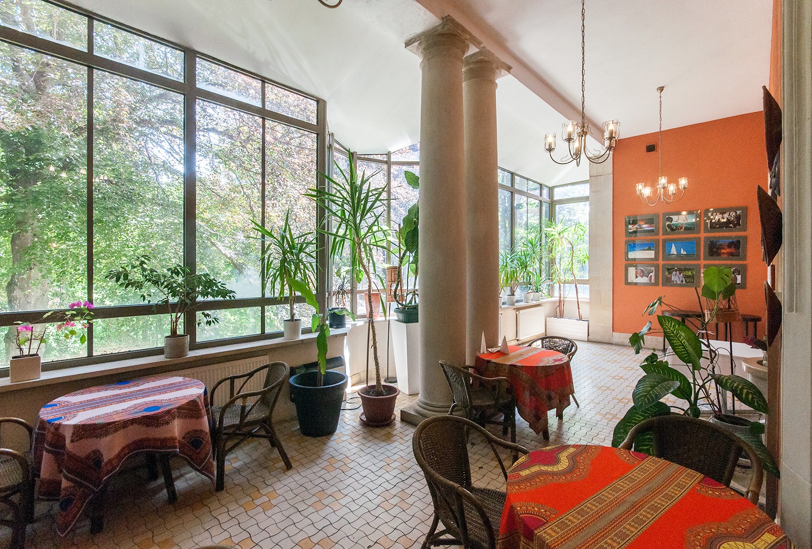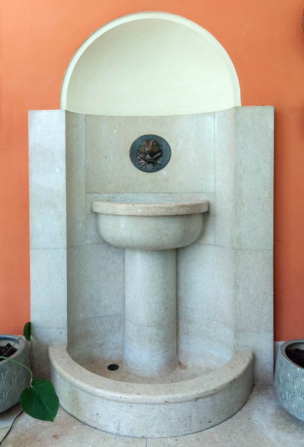 - Oranżerię, do której prowadzą dwa wejścia – z holu i z Sali Gdańskiej – otoczone szerokimi kamiennymi łukami. Centralnym punktem są dwie kolumny z białego piaskowca. Naprzeciw nich znajduje się kamienna fontanna z miską wspartą na kolumnie.