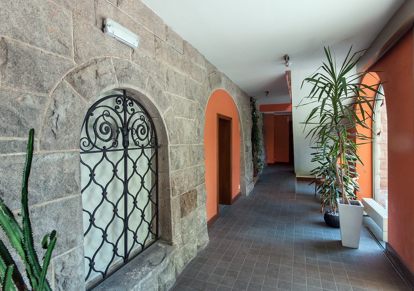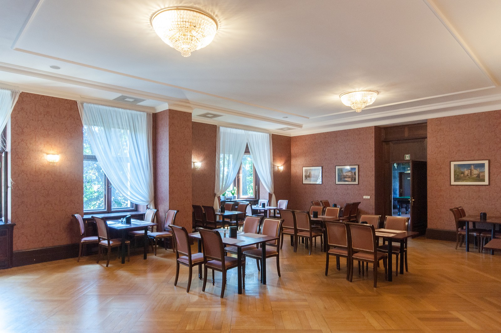 - Dysponuje 30 pokojami i apartamentami hotelowymi (ok. 60 miejsc noclegowych), windą, restauracją, barem, kawiarnią, salami konferencyjnymi i klubowymi.