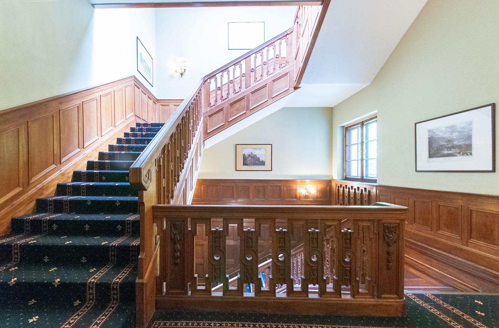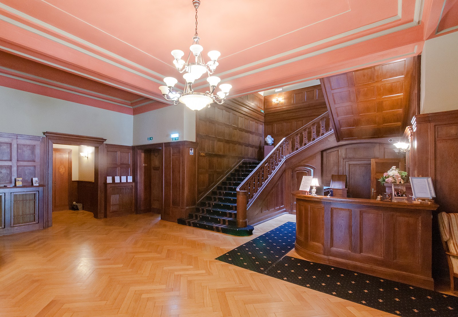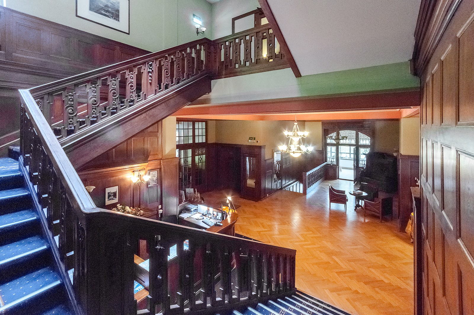 - Hol z reprezentacyjnymi schodami, dębową balustradą i szerokimi, rzeźbionymi tralkami.