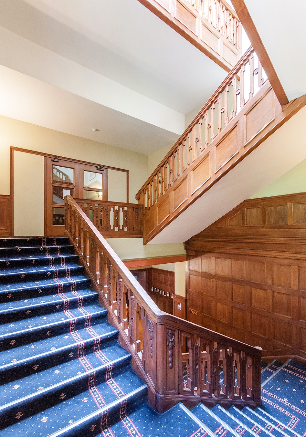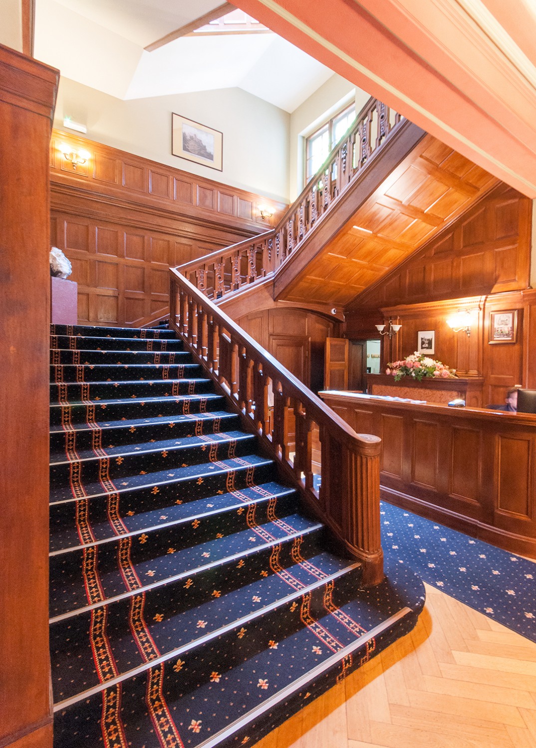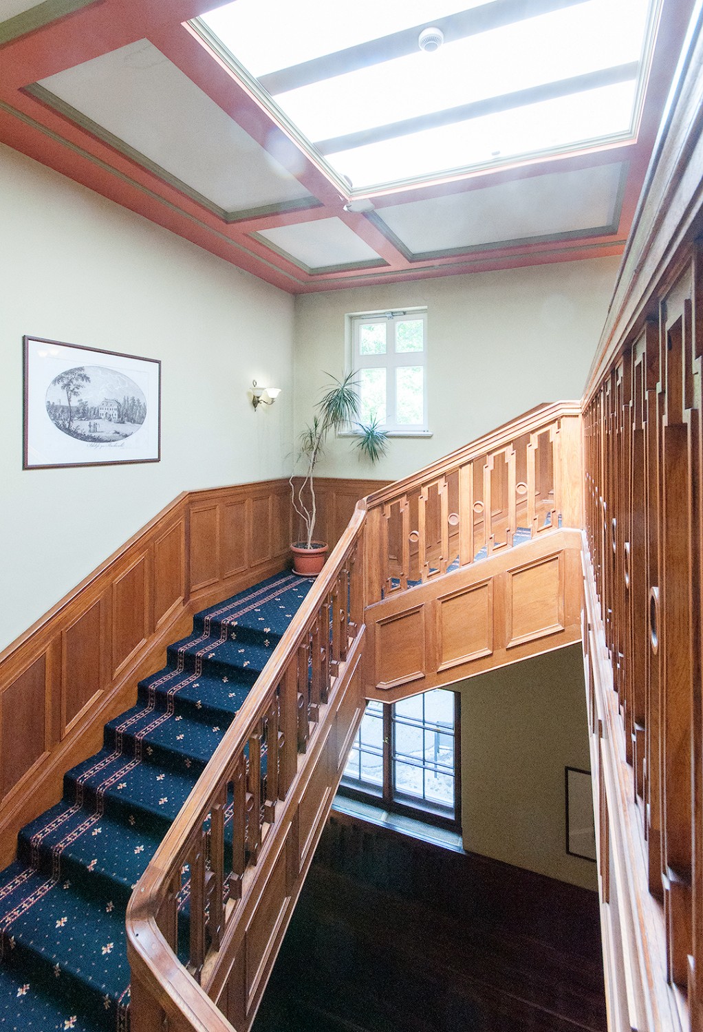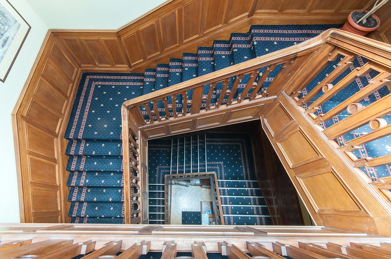 - Hol z reprezentacyjnymi schodami, dębową balustradą i szerokimi, rzeźbionymi tralkami.