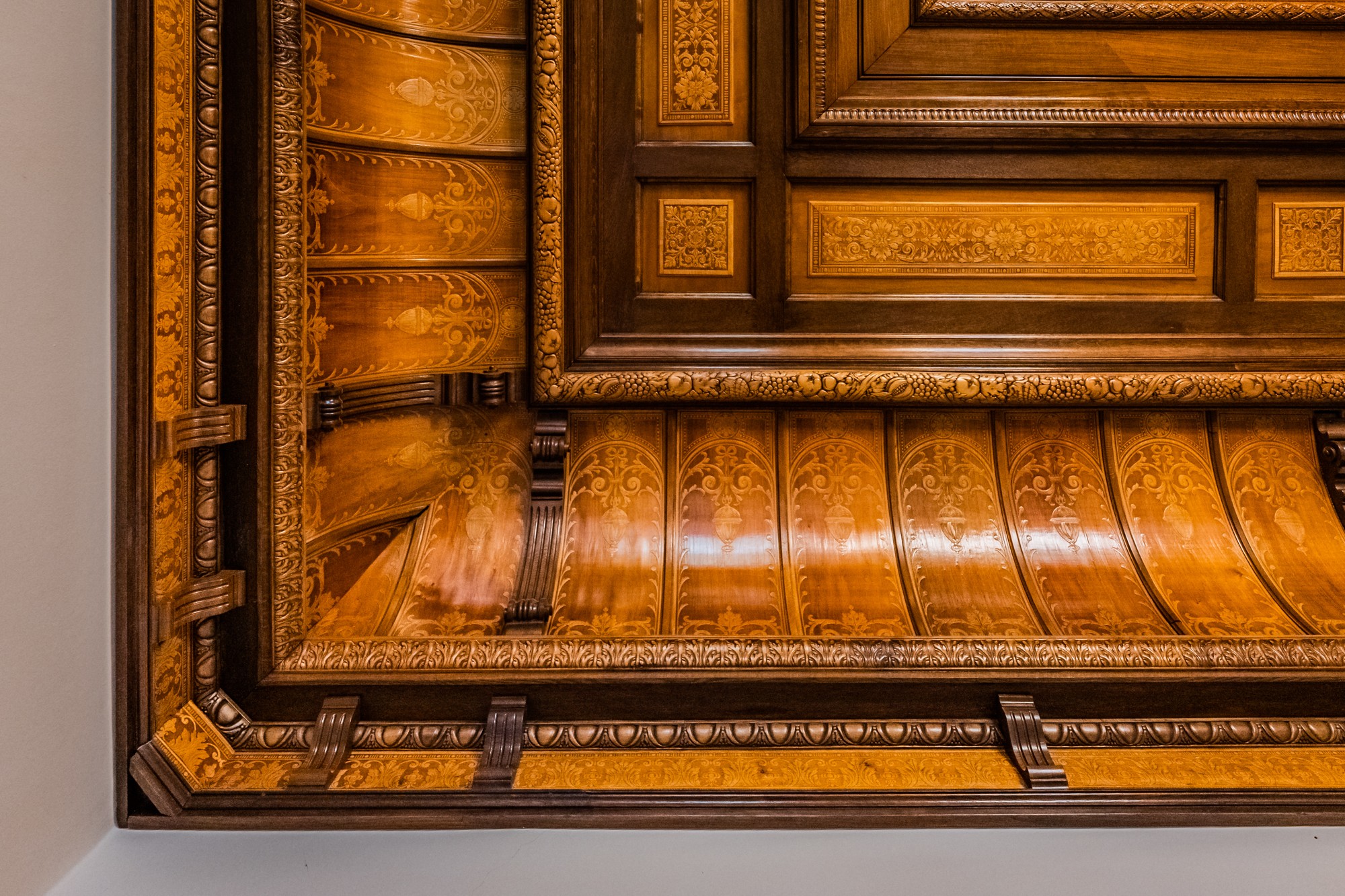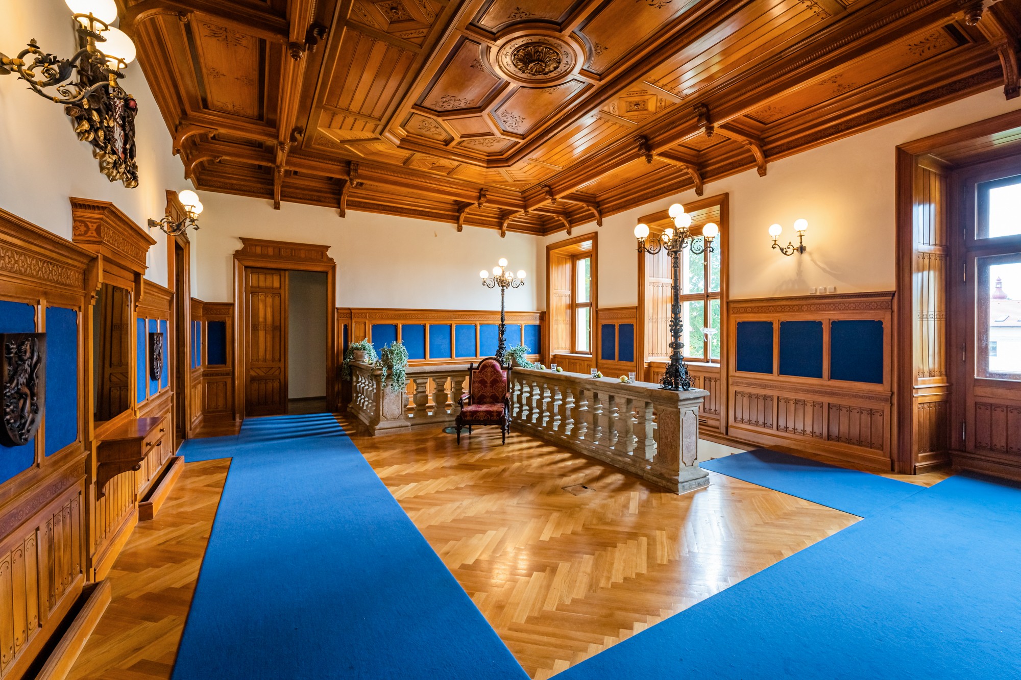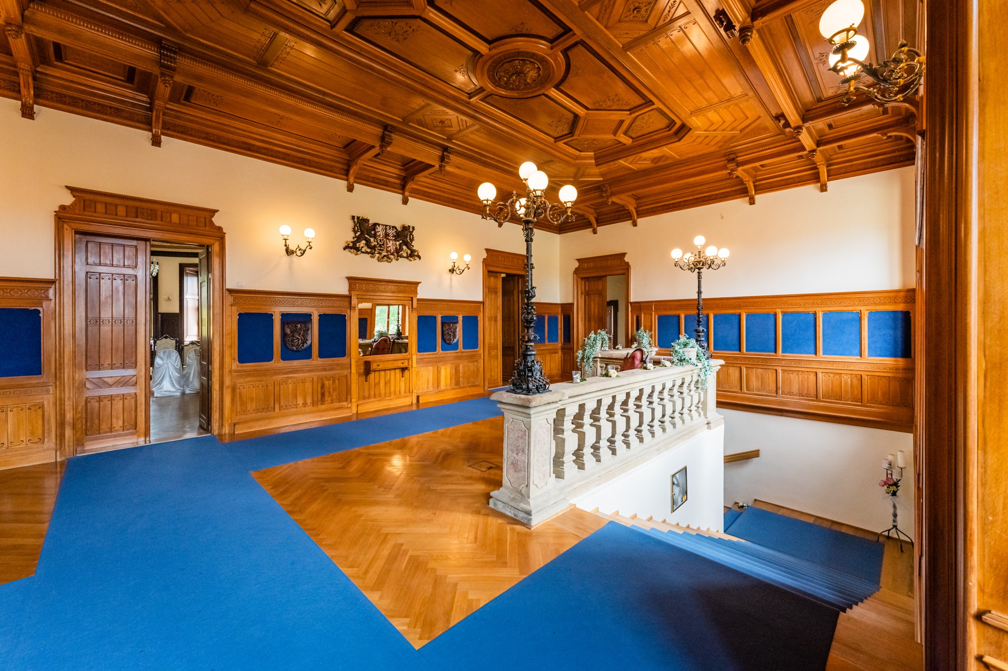 Historyczne detale architektoniczne są w pełni zachowane. Narożniki okienne i wnęki posiadają rzeźbione drewniane ozdoby. Między wejściem do sali owalnej a przylegającym pokojem znajduje się lustro, za którym kryje się wąska spiralna klatka schodowa prowadząca do pomieszczeń w wieży (77 m²) – tajne przejście.