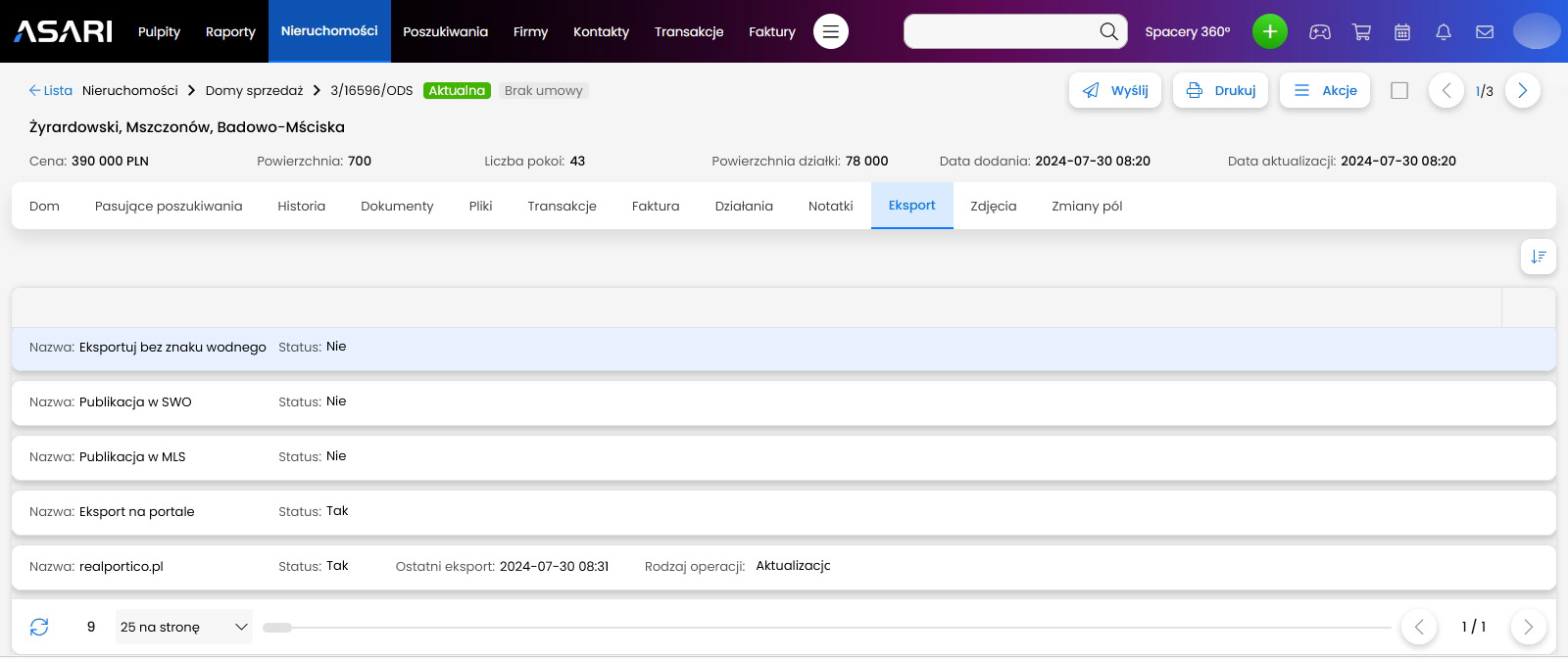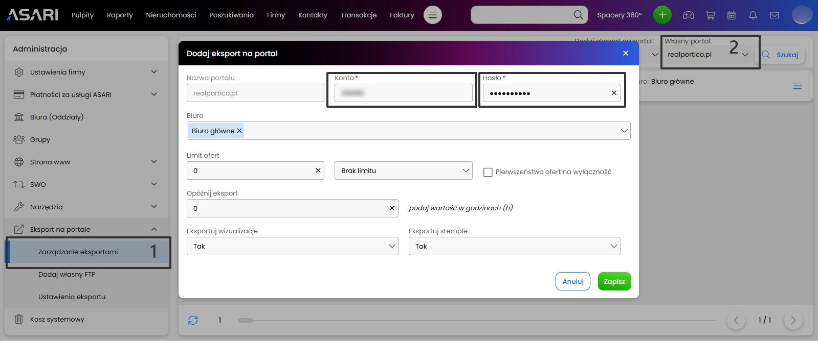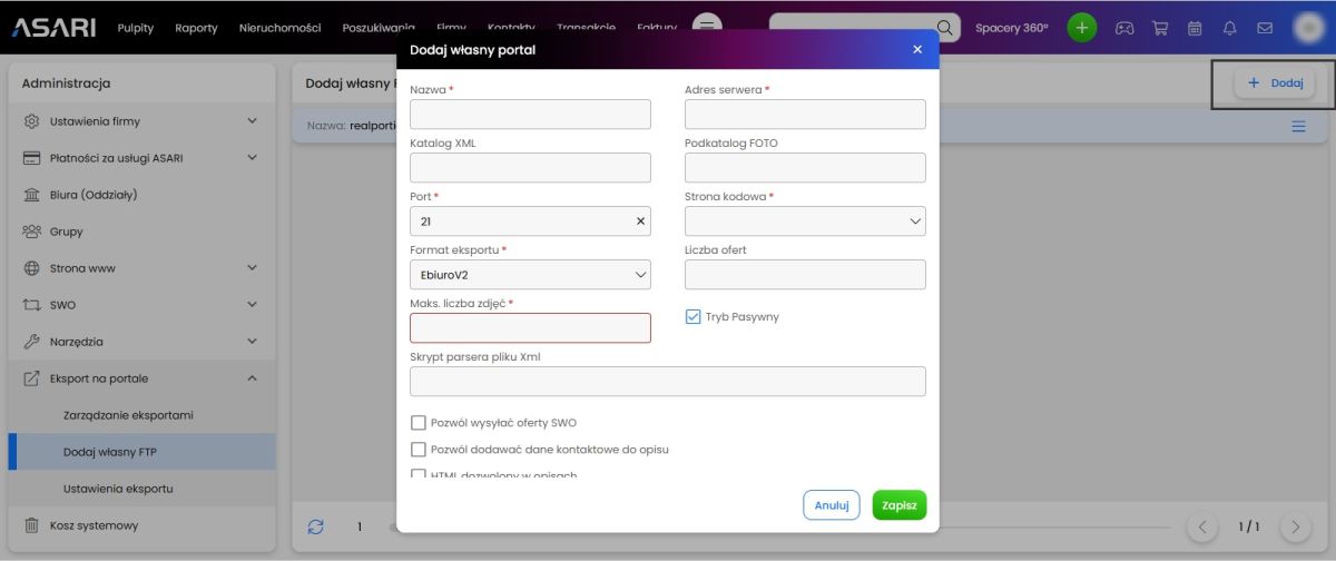 REALPORTICO to niezależny portal, który nie posiada partnerstw ani umów z innymi portalami nieruchomości, portalami ogłoszeniowymi ani systemami CMS, takimi jak ASARI CRM. Dlatego Twoje oferty nieruchomości nie pojawią się automatycznie na naszym portalu, jeśli publikujesz je za pomocą ASARI lub innego oprogramowania. Zamiast tego konieczne jest skonfigurowanie osobnego eksportu i wybranie realportico.pl w opcjach eksportu danej nieruchomości.